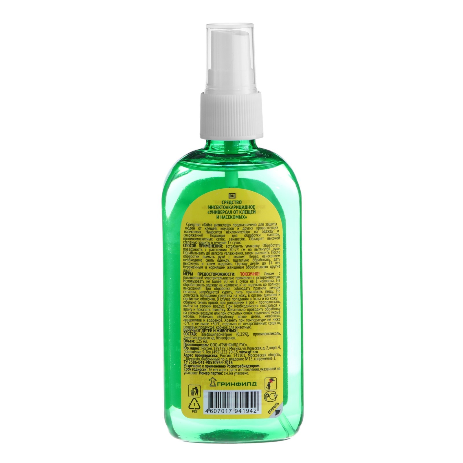 Спрей от клещей "тайга", антиклещ, 125 мл. Назначение: универсальное средство от клещей и насекомых. Характеристика: средство предназначено для защиты людей от клещей, комаров и других кровососущих насекомых. Наносится исключительно на одежду и снаряжение. Подходит для обработки палаток, противомоскитных сеток, занавесок. Обладает высокой степенью защиты в течение 15 суток. Способ применения: встряхнуть упаковку. Обработать поверхность с расстояния 20-25 см на вытянутой руке. Обрабатывать до легкого увлажнения, затем высушить. После обработки вымыть руки с мылом. Перед нанесением необходимо снять одежду, тщательно обработать, дать высохнуть и затем надевать. Одежду детям до 14 лет, беременным и кормящим женщинам обрабатывают другие лица. Меры предосторожности: лицам с повышенной чувствительностью применять с осторожностью. Использовать не более 50мл в сутки на 1 человека. Не обрабатывать одежду на человеке и не надевать до полного высыхания. При обработке соблюдать правила личной гигиены, запрещается курить, пить, принимать пищу. Не допускать попадания средства на кожу, в органы дыхания и слизистые оболочки. В случае попадания в глаза и на кожу – обильно смыть водой, при попадании в рот – прополоскать, выйти на свежий воздух. При необходимости показаться к врачу и показать этикетку. Желательно проводить обработку на свежем воздухе или при открытых окнах, тщательно укрыв мебель. Избегать обработку возле детей, животных, аквариумов и водоемов. Хранить при температуре не ниже -5°С и не выше +30°С, отдельно от лекарственных средств, пищевых продуктов, кормов для животныхю. Действующее вещество: альфациперметрин (0, 25%), пропиленгликоль, диметилсульфоксид, бензофенон. Форма выпуска: пластиковый флакон. Срок годности: 3 года в невскрытой упаковке производителя. Вид средства: Спрей Назначение: От клещей Тип средства: Инсектицид  развернуть описание ▼
