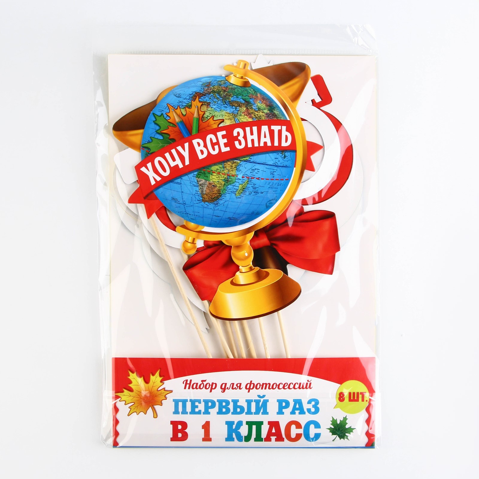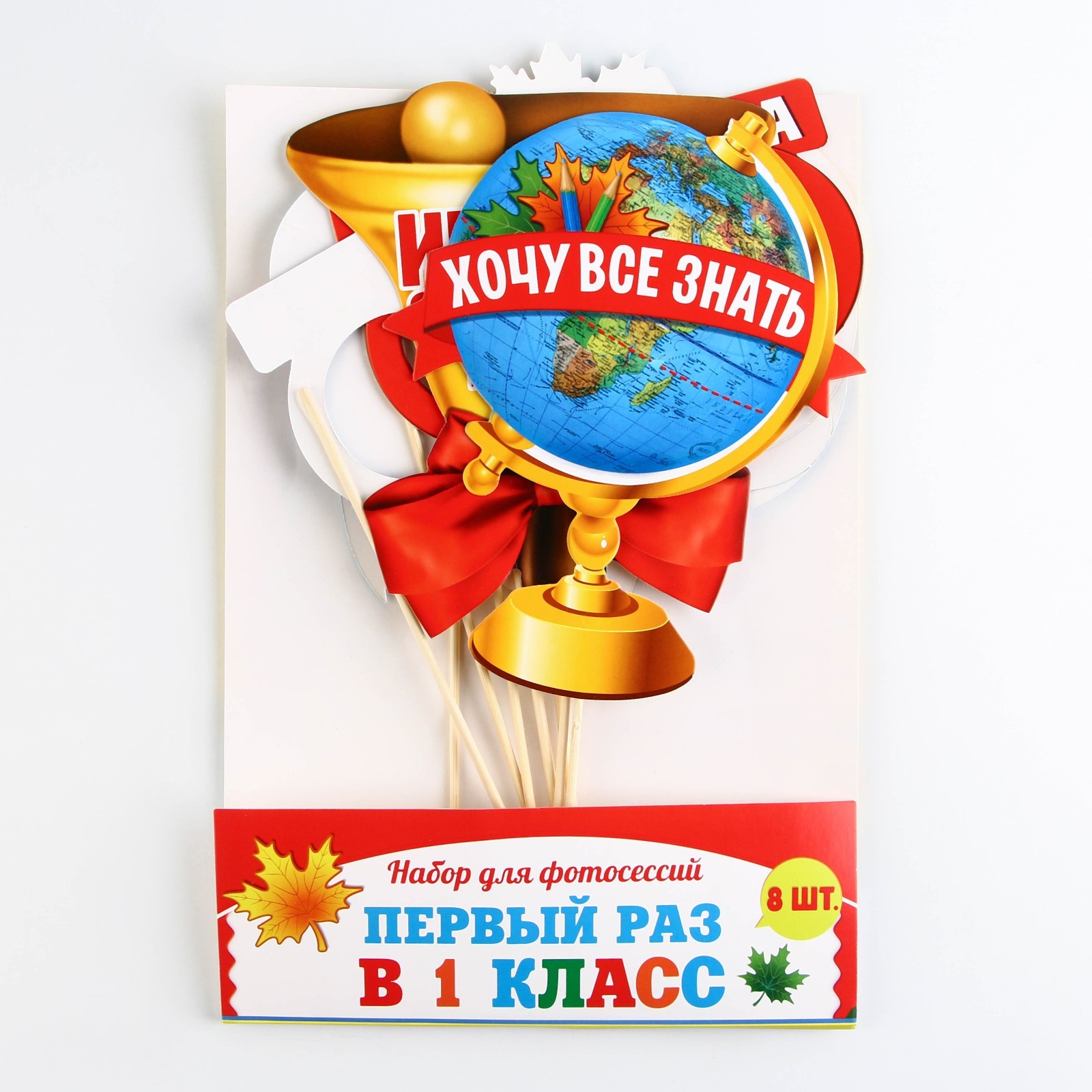 Набор фотобутафории на 1 сентября «первый раз в 1-ый класс», 8 предметов.. В набор входят 8 ярких тематических предметов на деревянной ножке, которые преобразят вас до неузнаваемости. Размеры: «1 класс» – 15,2 х 15,4 см; «Буду учиться» – 18,4 х 15,9 см; «Глобус» – 15,2 х 18,9 см; «Иду в школу» – 18,4 х 15,9 см; «Колокольчик» – 15,5 х 18 см; «Очки» – 16 х 11,4 см; «Учитель» – 18,4 х 15,9 см; Набор:Да|Цвет:Разноцветный|Для кого:Унисекс|В наборе, шт.:8|Вид упаковки:Пакет|Тематика праздника:1 Сентября|Материал:Картон|Страна:Китай  развернуть описание ▼