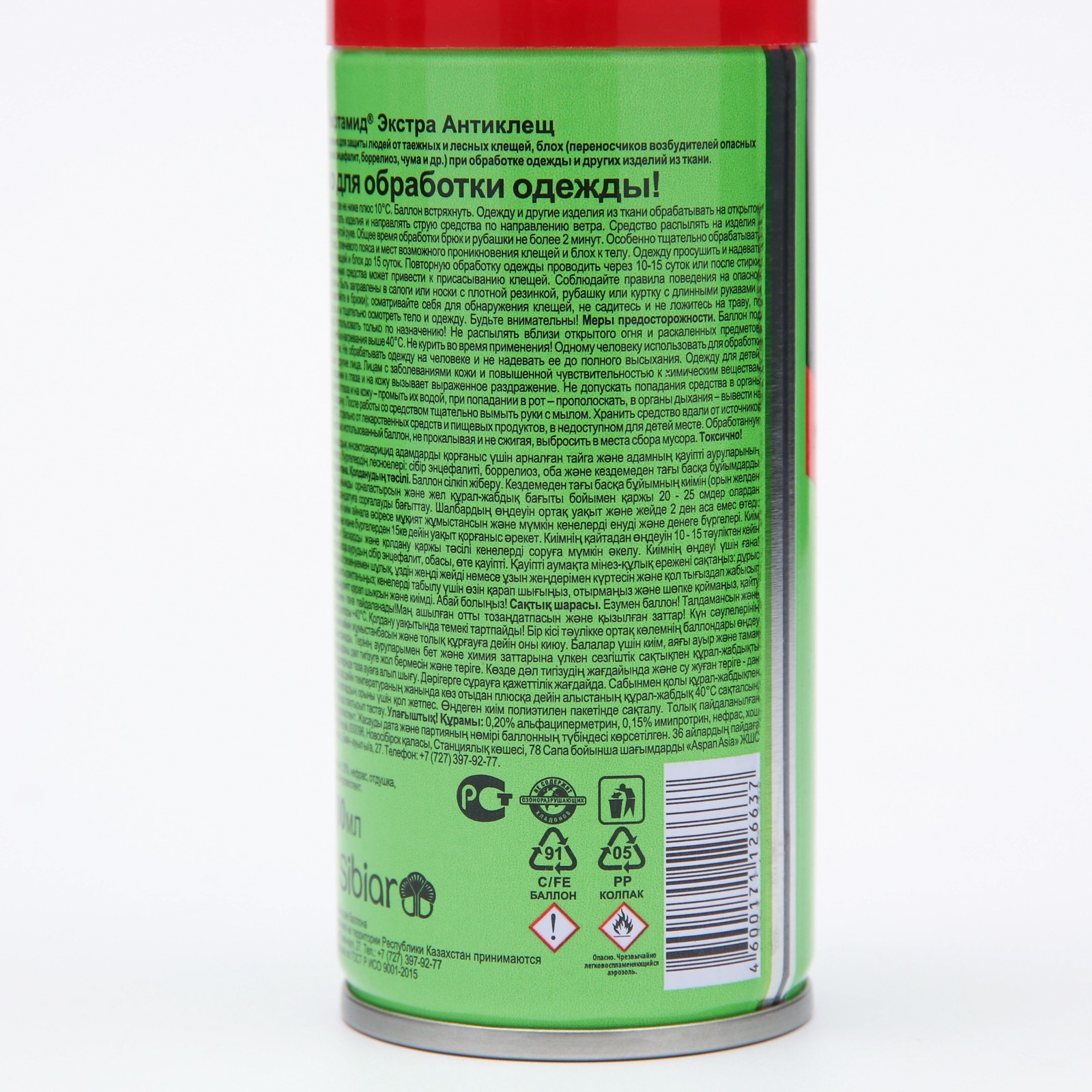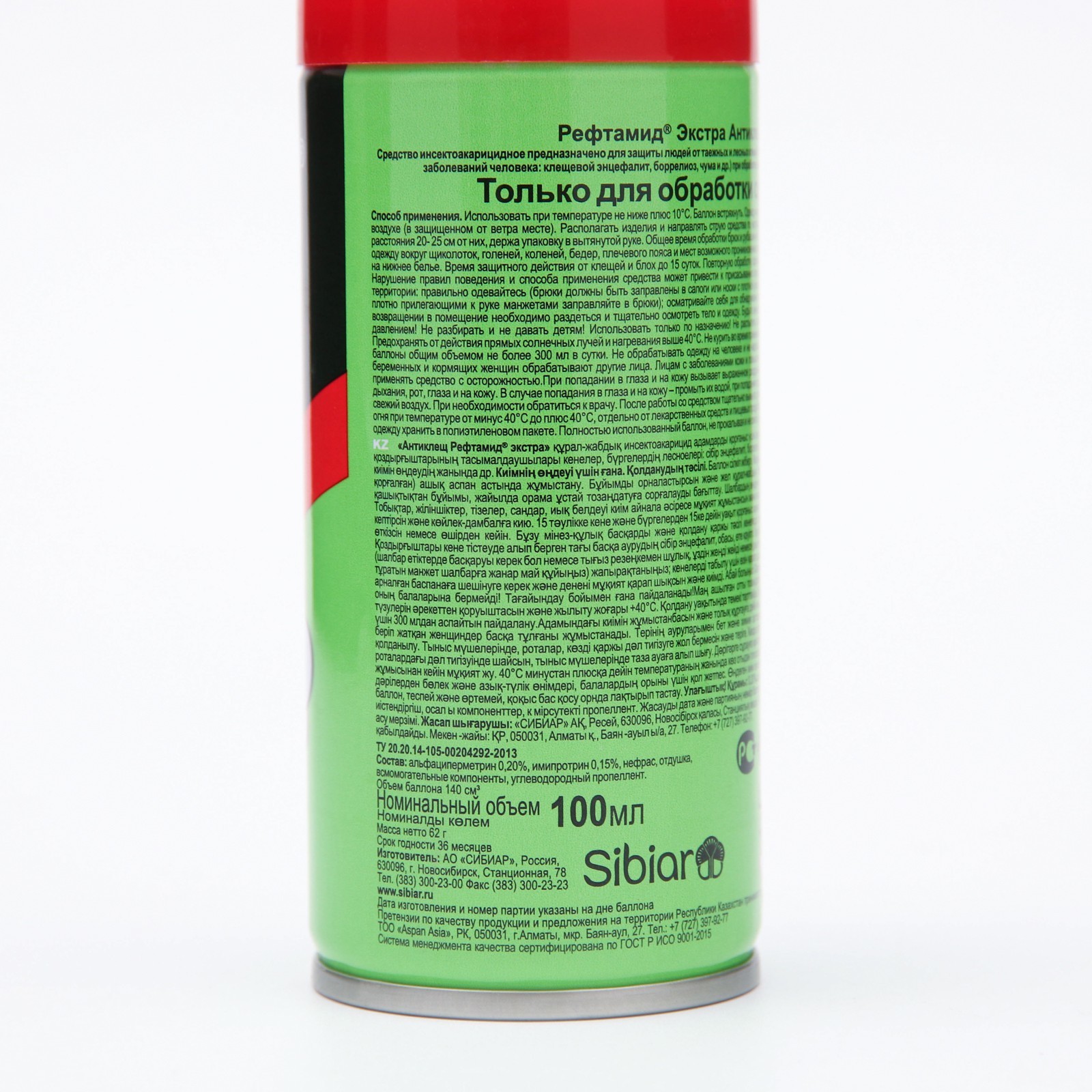 Аэрозоль "рефтамид", антиклещ, экстра, 100 мл. Рефтамид Экстра Антиклещ, Средство от лесных клещей, 100мл. Рефтамид экстра антиклещ - инсектоакарицидное средство для защиты людей от таёжных и лесных клещей, блох (переносчиков возбудителей заболеваний человека). В состав средства от клещей введено новое активнодействующее вещество, которое значительно повышает эффективность защиты от клещей в сравнении с традиционными средствами. Репеллент наносится ТОЛЬКО на одежду и снаряжение. Способ применения: перед применением баллон встряхнуть. Одежду и другие изделия из ткани обрабатывать на открытом воздухе (в защищенном от ветра месте). Средство распылять на изделия с расстояния 20–25 см. Общее время обработки брюк и рубашки не более 2 минут. Особенно тщательно обрабатывать одежду вокруг щиколоток, голеней, коленей, бедер, плечевого пояса и мест возможного проникновения клещей и блох к телу. Время защитного действия: от клещей и блох до 15 суток. Повторную обработку одежды проводить через 10–15 суток или после стирки. Если вы любите проводить время на природе или работаете в лесном хозяйстве, то Рефтамид экстра антиклещ - это незаменимый помощник в борьбе с клещами и другими насекомыми. Составальфациперметрин 0, 20%, имипротрин 0, 15%, нефрас, отдушка, вспомогательные компоненты, углеводородный пропеллент Вид средства: Аэрозоль Назначение: От клещей Тип средства: Инсектицид  развернуть описание ▼