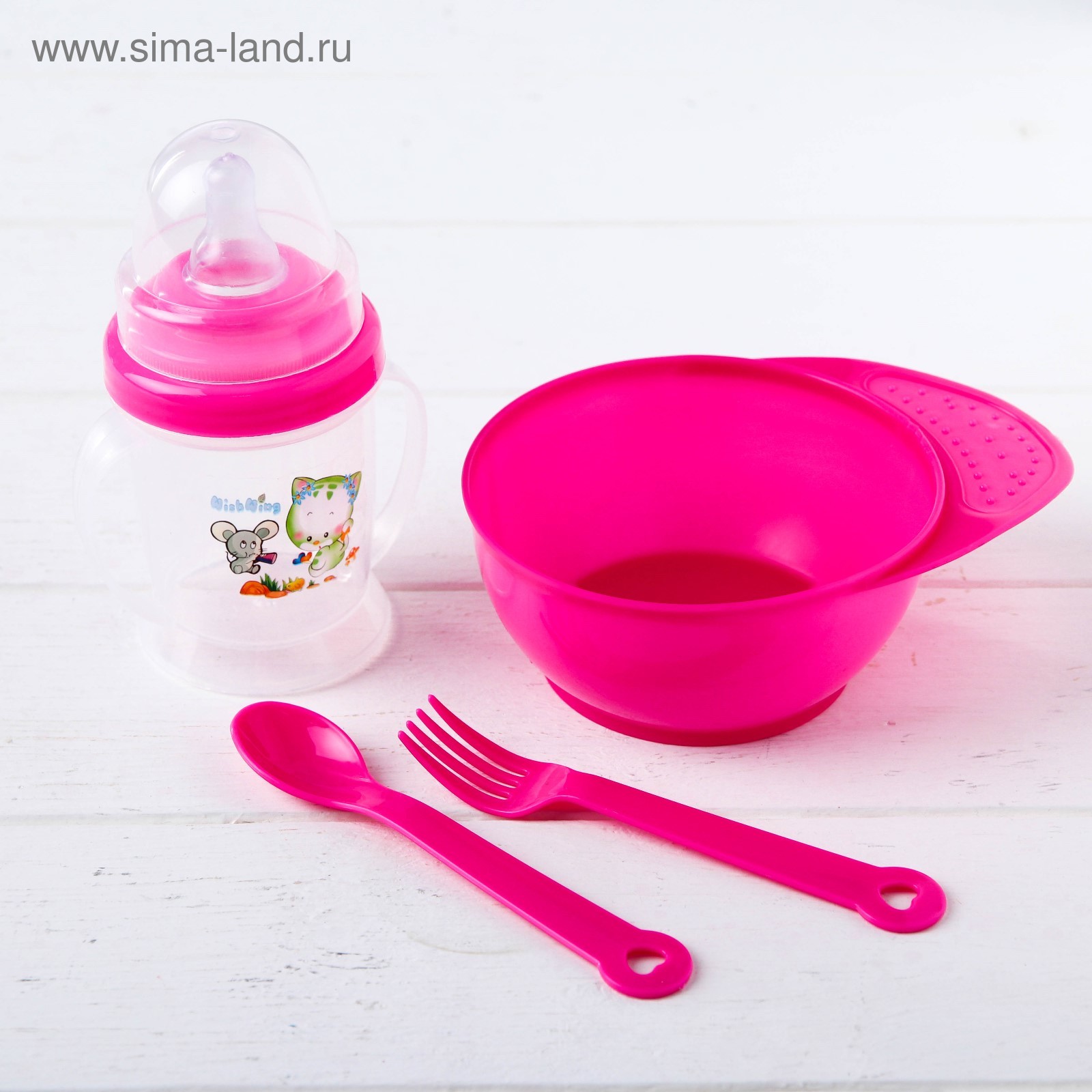 Набор детской посуды, 4 предмета: миска 300 мл, бутылочка для кормления 180 мл, ложка, вилка, цвета микс