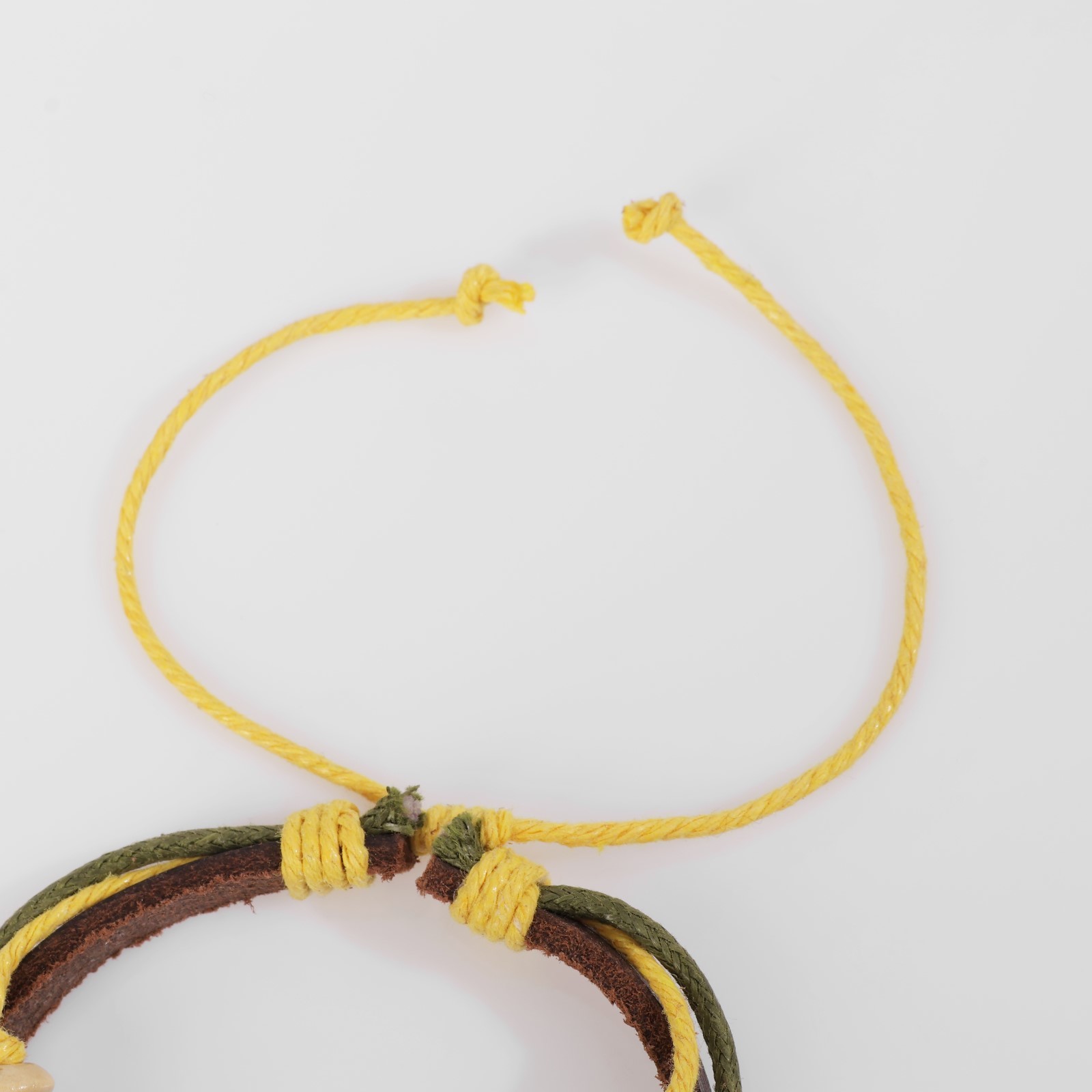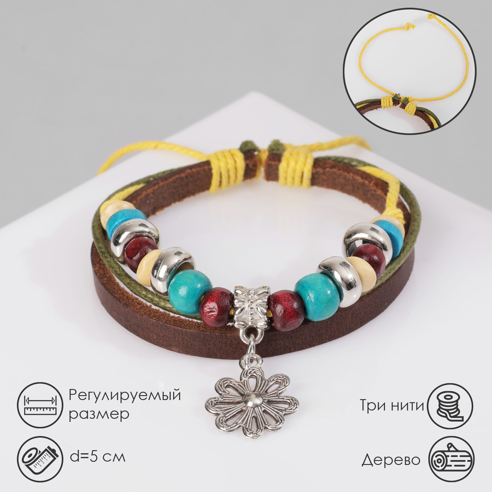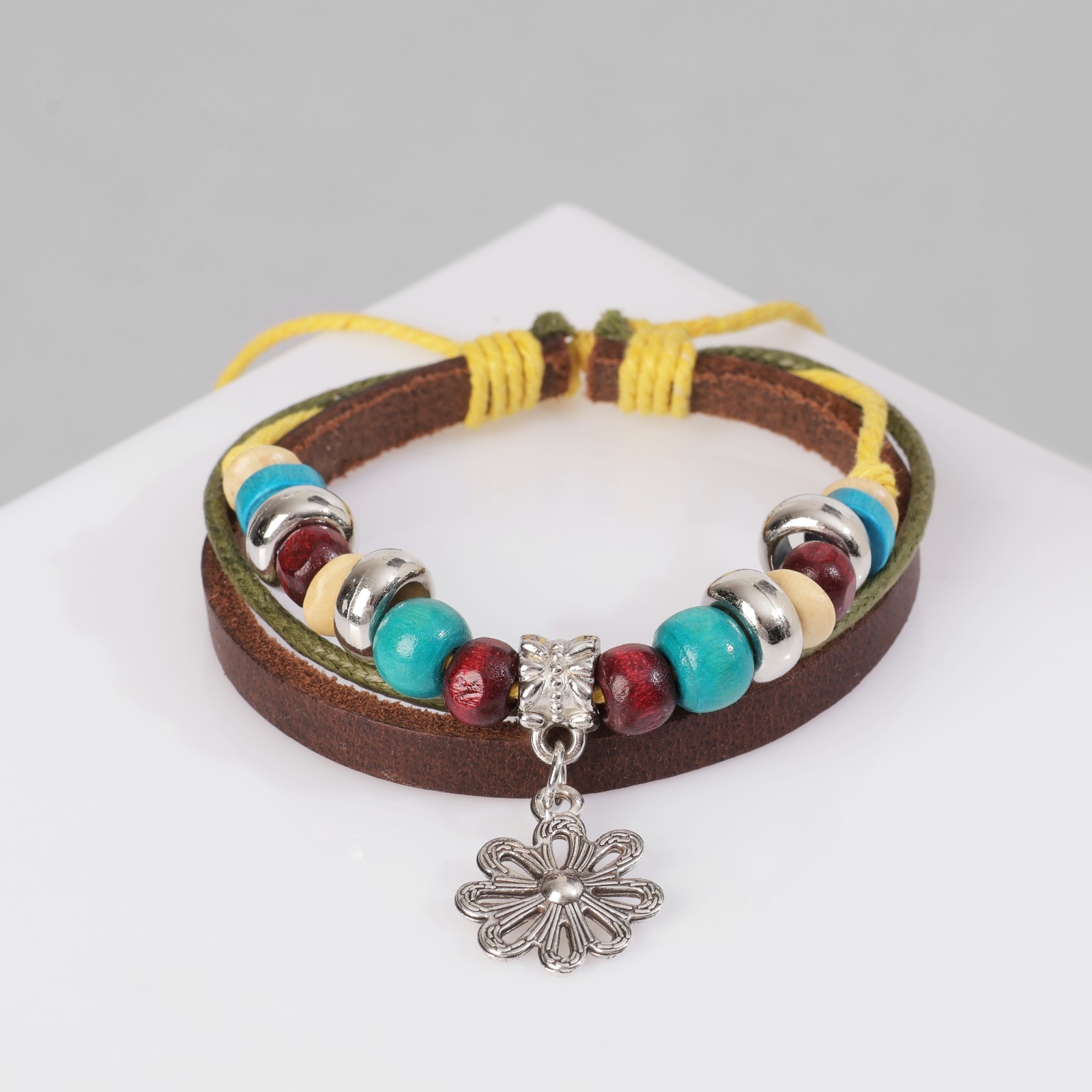 Браслет кожа «цветок» с бусинами, 3 нити, цветной, D=5 см