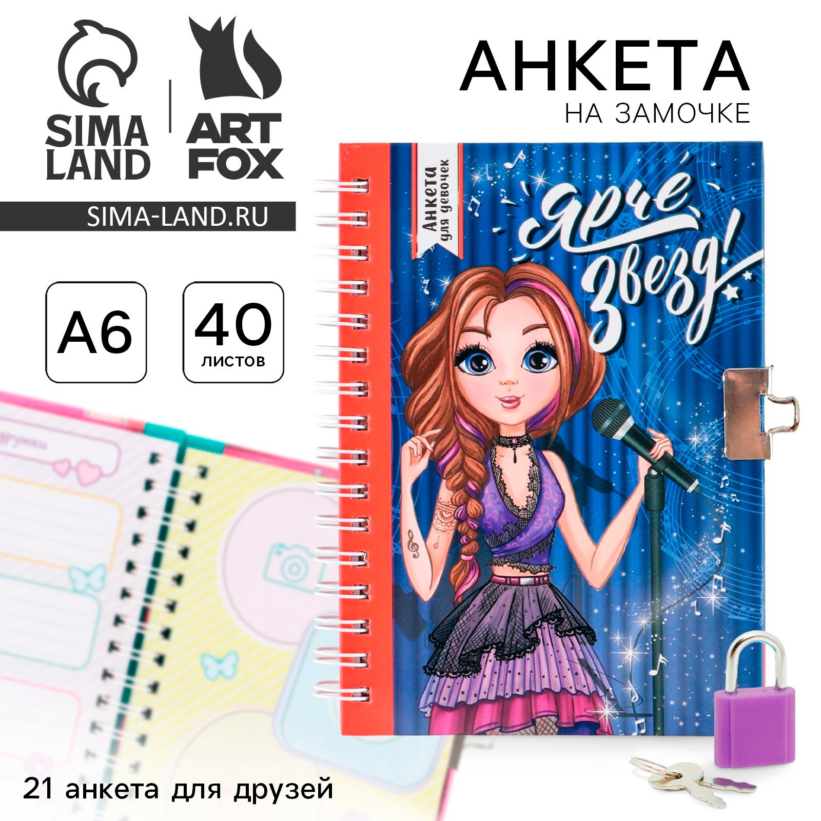 Анкета на замочке, в твердой обложке а6, 40 листов «ярче звезд». Для кого:Для девочки|Формат:А6|Тип скрепления:На гребне/спирали|Размер, см:10.5 х 14.8|Возраст:От 3 лет|Количество листов:40|Количество страниц:80|Материал обложки:Картон 7БЦ|Тематика праздника:8 Марта|Материал:Картон 7БЦ|Материал:Металл|Материал:Пластик|Материал:Бумага|Особенности:На замочке|Особенности:Дизайнерский блок|Вид обложки:Твёрдая|Страна:Китай  развернуть описание ▼