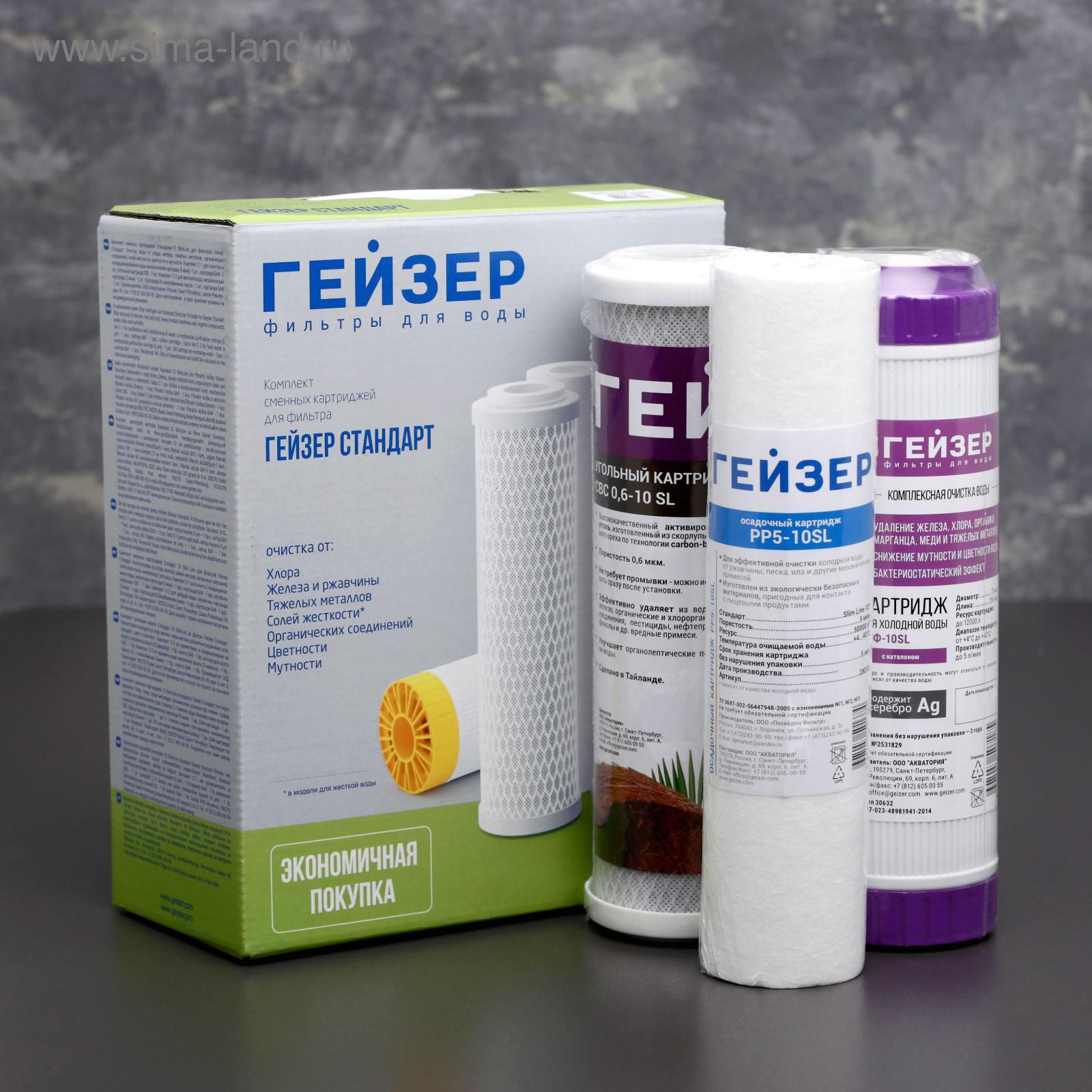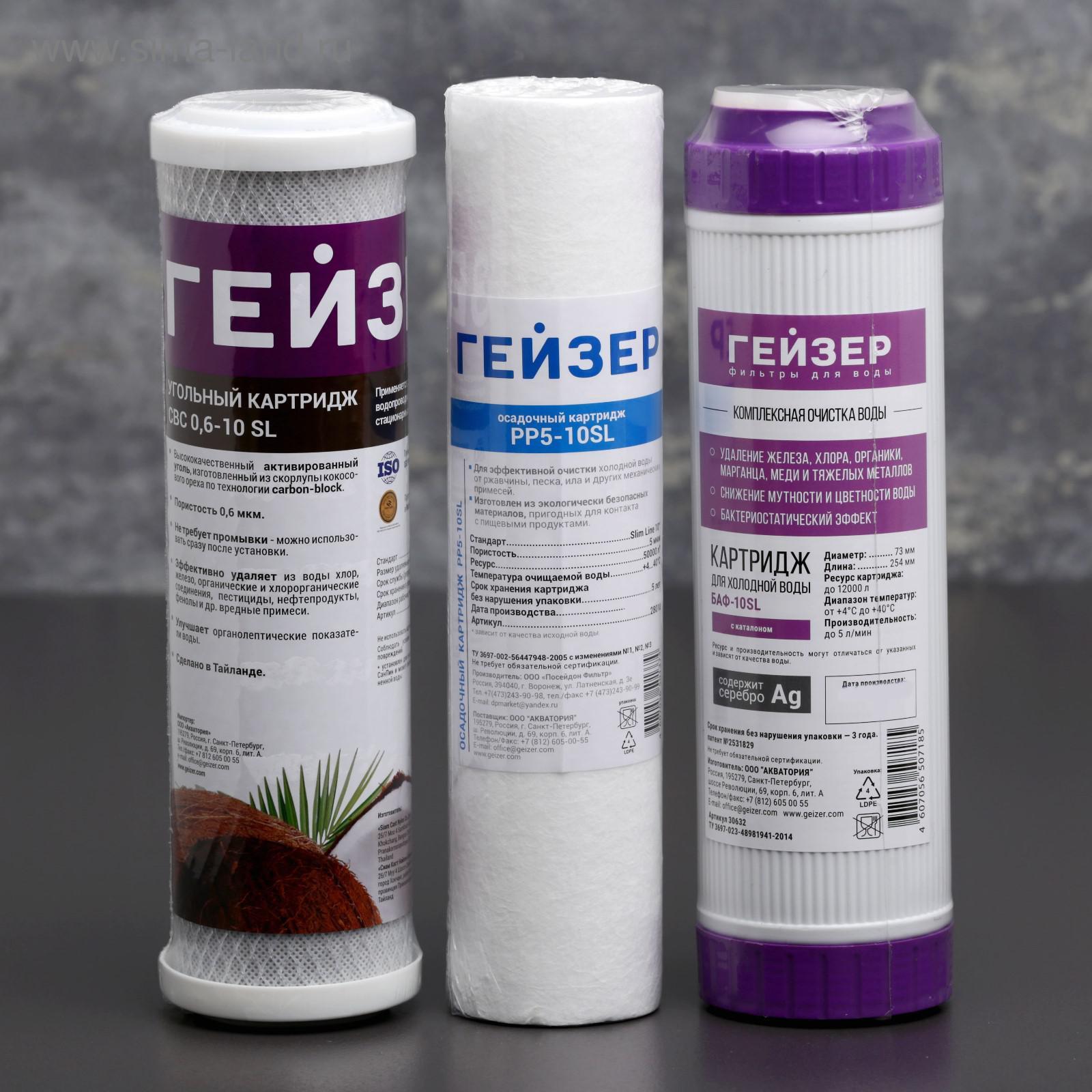 Комплект сменных картриджей с-1 к фильтру «гейзер. стандарт». Комплект С-1 используется для очистки водопроводной воды для фильтра «Гейзер. Стандарт». Комплект включает 3 картриджа: «PP5–10SL» — удаляет нерастворимые частицы размером до 5 мкм (ржавчину, взвеси). «БАФ–SL10» — универсальный картридж для удаления хлора, органических примесей, железа и тяжёлых металлов. Содержит серебро. «CBC0, 6–10SL» — для удаления хлора, запахов, органических примесей и кондиционирования воды. parts count: 0 Глубина очистки, мкм: 0.6 Глубина очистки, мкм: 5 tnved: 8421210009 Материал: Пластик Тип использования: Для холодной воды Размер картриджа: 10SL Назначение: Для магистральных фильтров Тип: Сменный картридж Рабочая температура, С°: от +5 до +35 °С  развернуть описание ▼