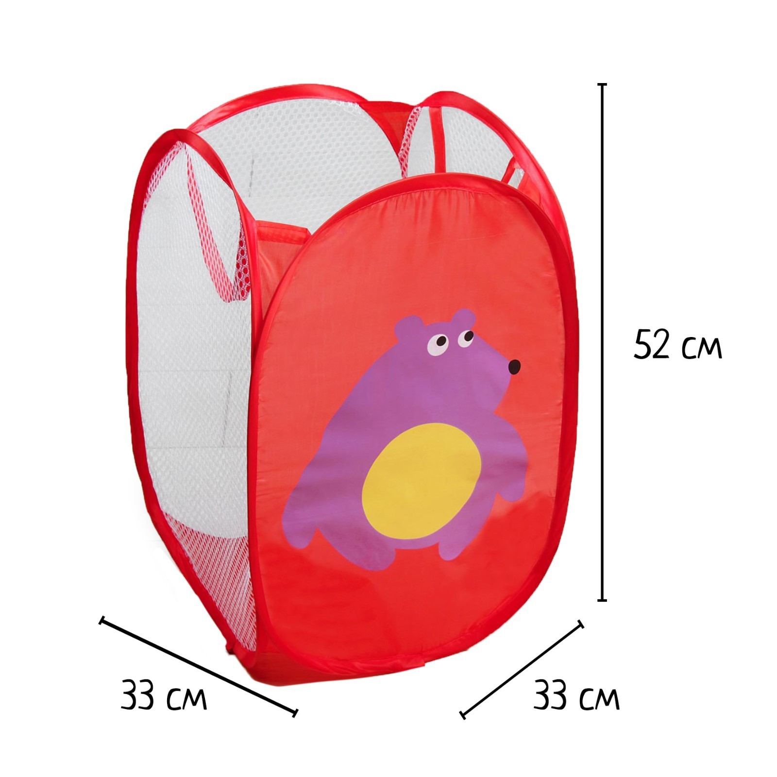 Корзина для игрушек «мишка». Данная корзина предназначена для хранения игрушек и других важных вещей малыша. Она поможет поддерживать чистоту в доме и приучить ребёнка к порядку. Отсутствие острых углов, прочные и лёгкие материалы делают предмет незаменимым в детской комнате. Благодаря сетке хорошо видно содержимое, а безопасный металлический каркас не деформируется при использовании. Такая корзина пригодится в поездках: в ней будет удобно собрать любимые игрушки, с которыми чадо не может расстаться ни на минуту. Она компактна, но вместит всё необходимое, и вещи не рассыплются в дороге. Если изделие стало ненужно, его можно сложить, так оно займёт совсем немного места. Цвет: Красный Форма: Прямоугольная Ширина, см: 33 Высота, см: 52 Глубина, см: 52 Тематика: Животный мир Крышка: Нет Материал: Текстиль Основной материал: Текстиль Форма: Прямоугольник  развернуть описание ▼