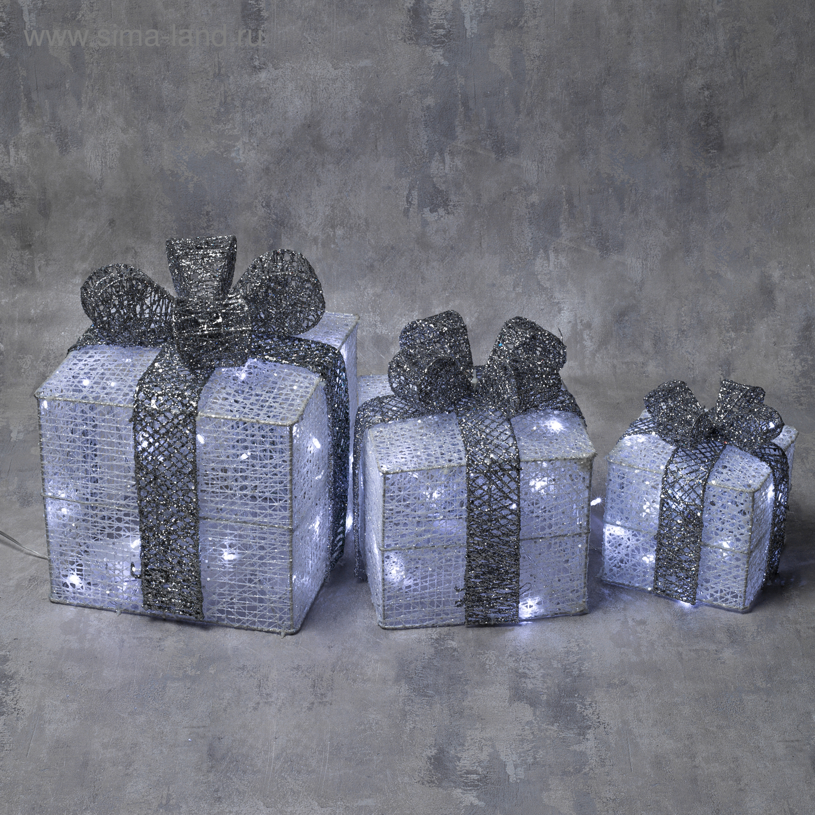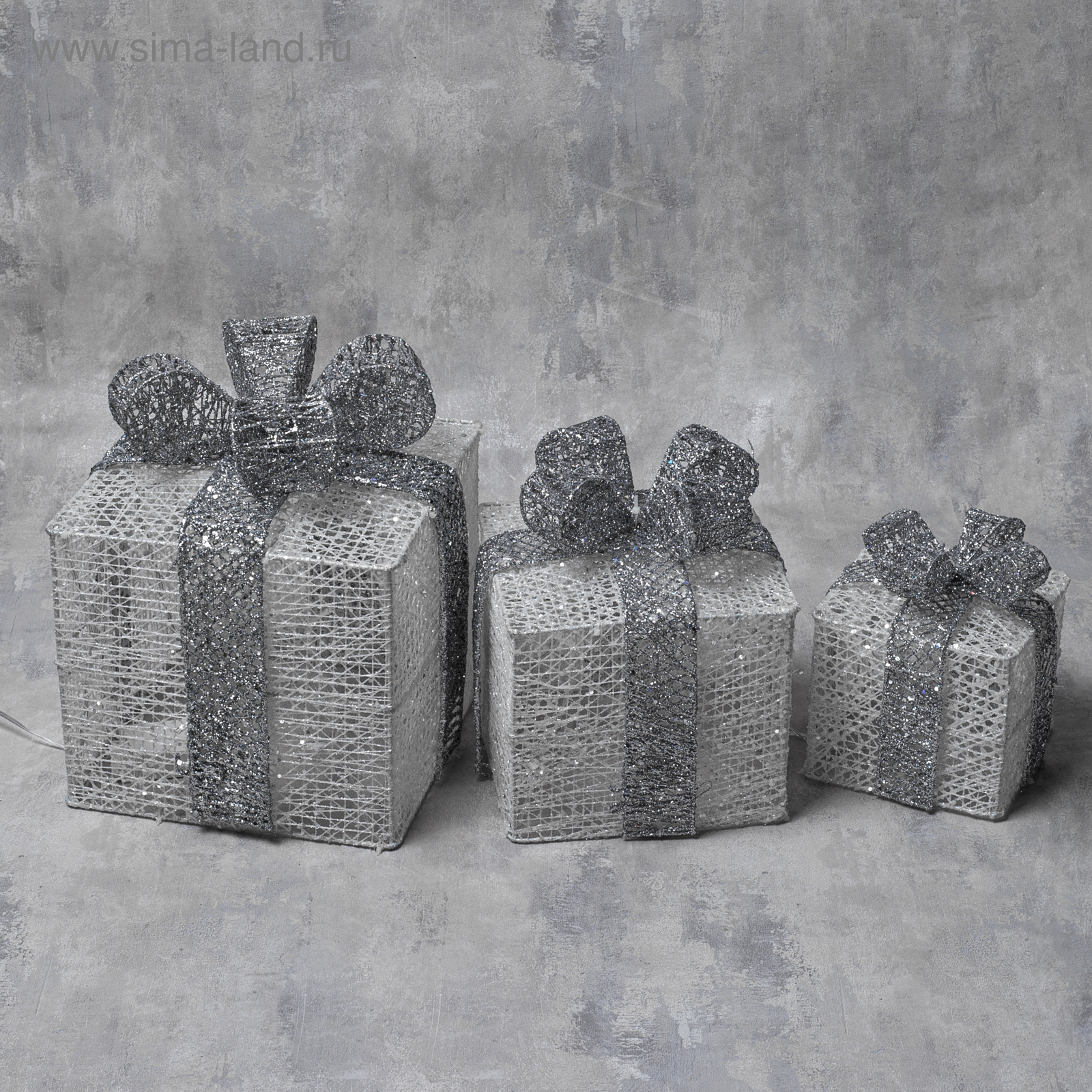 Светодиодная фигура «подарки с серой лентой» 15, 20, 25 см, текстиль, металл, 220 в, 8 режимов, свечение белое