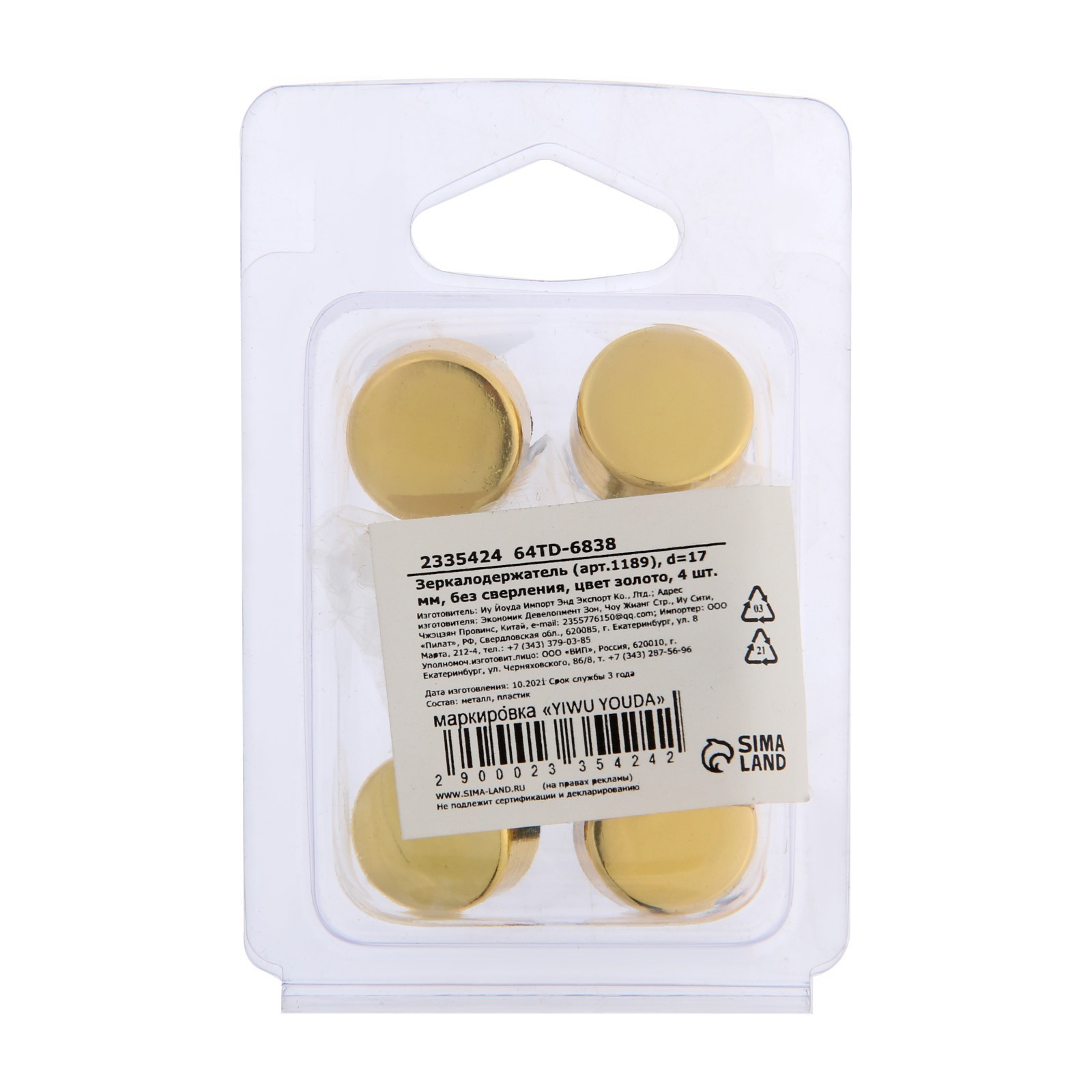 Зеркалодержатель (арт.1189), d=17 мм, без сверления, цвет золото, 4 шт.. Максимальная нагрузка на пару: бетон, полнотелый кирпич, натуральный камень - 20 кг.гипсокартон - 10 кг.Диаметр, мм:17|Гарантийный срок, мес.:6|Материал:Пластик|Материал:Металл|Цвет:Золото|Вид держателя:Держатель для зеркала|Страна:Китай  развернуть описание ▼
