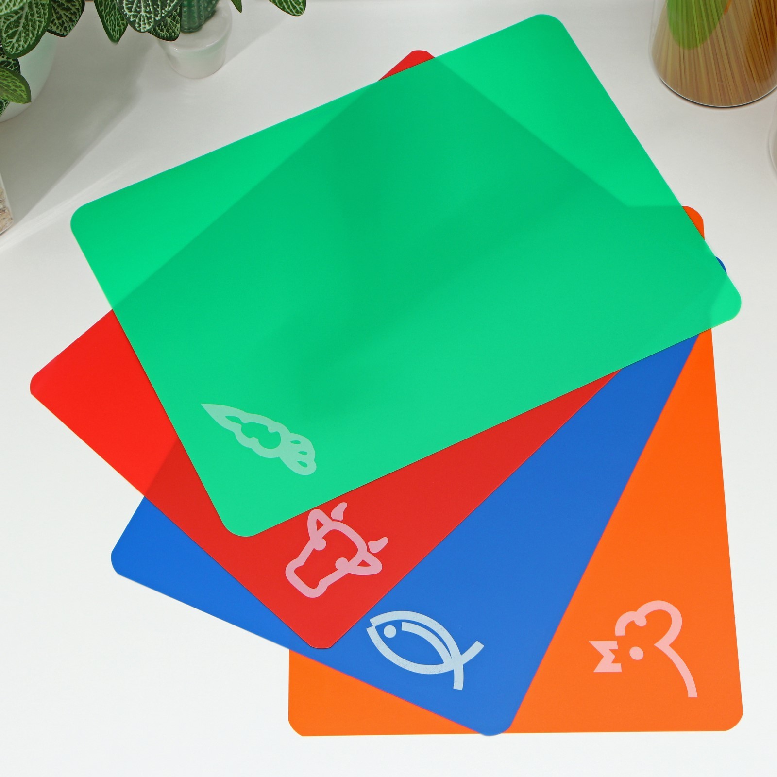 Набор досок разделочных пластиковых прямоугольных гибких доляна, 38x30 см, 4 шт, цвет микс. В приготовлении блюд разделочная доска играет не меньшую роль, чем сковорода, нож или плита. Качественная разделочная доска поможет получить от процесса приготовления пищи максимум пользы. Преимущества: Имеет оптимальный размер, многофункционально и при необходимости может заменить подставку для горячих сковород. Подойдет для разделки рыбы, мяса курицы или говядины, шашлыка, овощей, хлеба, теста, фруктов, продуктов, нарезок сыра и колбасы, картофеля, картошки. Материал легко очищается от грязи и жира, более экологичен, чем деревянное покрытие, которое впитывает запахи и влагу. Кроме того, разделочные доски можно использовать в качестве оригинального элемента сервировки стола - подать сыр к вину, фрукты, овощи, мясные закуски. Цвет: МИКС Форма: Прямоугольная Размер, см: 30 х 37 Длина, см: 37 Ширина, см: 30 В наборе, шт.: 4 Материал: Пластик Тип доски: Гибкая Тип нанесения рисунка: Термо-штамп Можно мыть в посудомоечной машине: Да Особенности: Противоскользящая  развернуть описание ▼