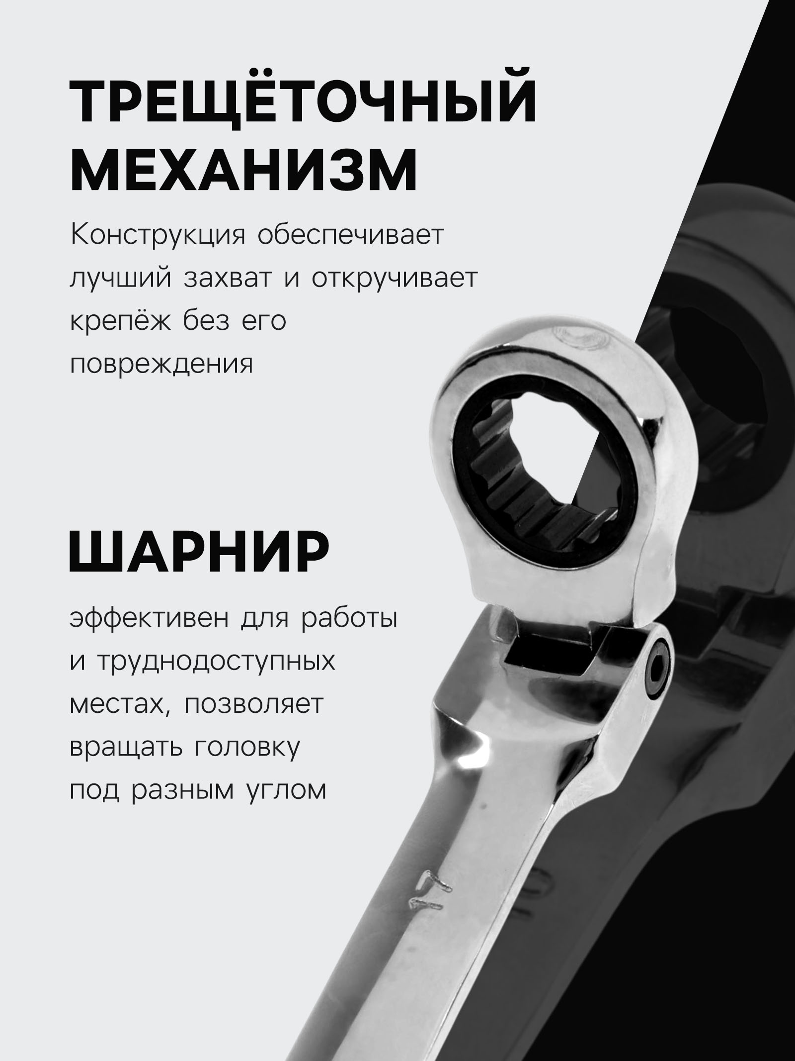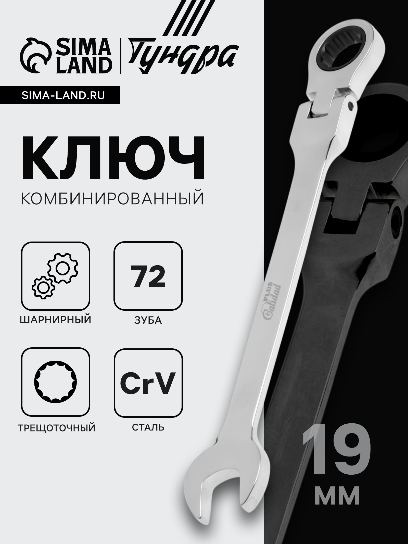 Ключ комбинированный трещоточный шарнирный тундра, Crv, полированный, 72 зуба, 19 мм
