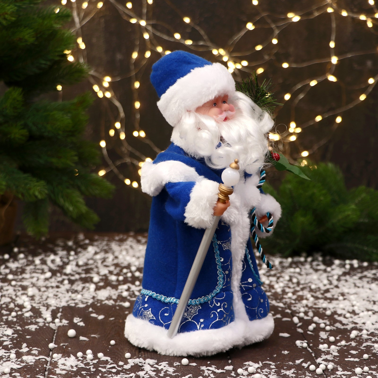 Дед мороз под ёлку «зимнее волшебство. синяя шуба, с посохом», 27 см. Фигурка Деда Мороза высотой 27 см в синей шубе с посохом — стильное украшение для новогоднего интерьера, сочетающее в себе элементы советской традиции и современного фьюжн-дизайна. Отсутствие источника питания и звуковых эффектов делает эту модель максимально простой и универсальной, что позволяет использовать её в самых разных праздничных композициях без дополнительных технических требований. Благодаря компактному размеру и продуманному образу, фигурка легко впишется как в классический, так и в современный декор, создавая атмосферу тепла и уюта. Особенности Высота 27 см — оптимальный размер для размещения под ёлкой, на полке или в праздничной витрине.Натуральные оттенки синей шубы и традиционный посох подчёркивают уникальность образа.Отсутствие подсветки и звука обеспечивает спокойный, ненавязчивый акцент в интерьере.Дизайн в стиле советского ретро с элементами фьюжн гармонично сочетается с разными стилями оформления.Подходит для всех возрастных категорий и универсален по половому признаку.Создаём праздничное настроение Эта фигурка Деда Мороза напоминает о тёплых семейных традициях и волшебстве зимних праздников. Её образ вдохновляет на создание уютной атмосферы и подчёркивает значимость каждого момента в череде новогодних событий. Простота и лаконичность исполнения способствуют органичному вписыванию в разнообразные праздничные интерьеры, помогая сделать украшение ёлки или комнаты более выразительным и запоминающимся. Тип питания:Без источника питания|Для кого:Унисекс|Для кого:Для девочки|Для кого:Для мальчика|Высота, см:27|Возраст:Для взрослых|Символ года:Нет|Тематика праздника:Новый год|Звук:Нет|Работает от сети:Нет|Свет:Нет|Особенности куклы:Без особенностей|Стиль:Фьюжн|Стиль:Советский|Страна:Китай  развернуть описание ▼
