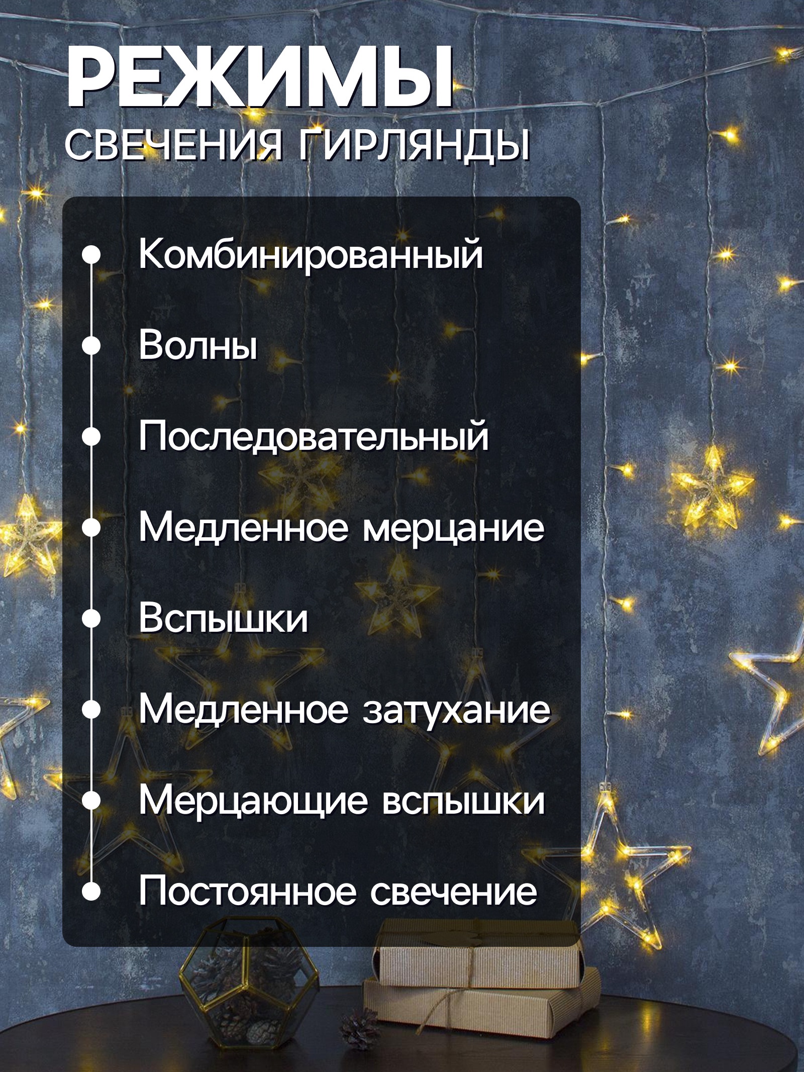 Гирлянда «бахрома» 2.4 0.9 м с насадками «звёзды», Ip20, прозрачная нить, 138 Led, свечение тёплое белое, 8 режимов, 220 в