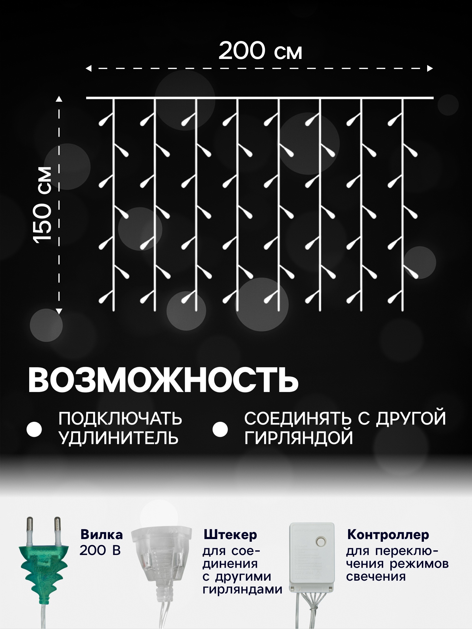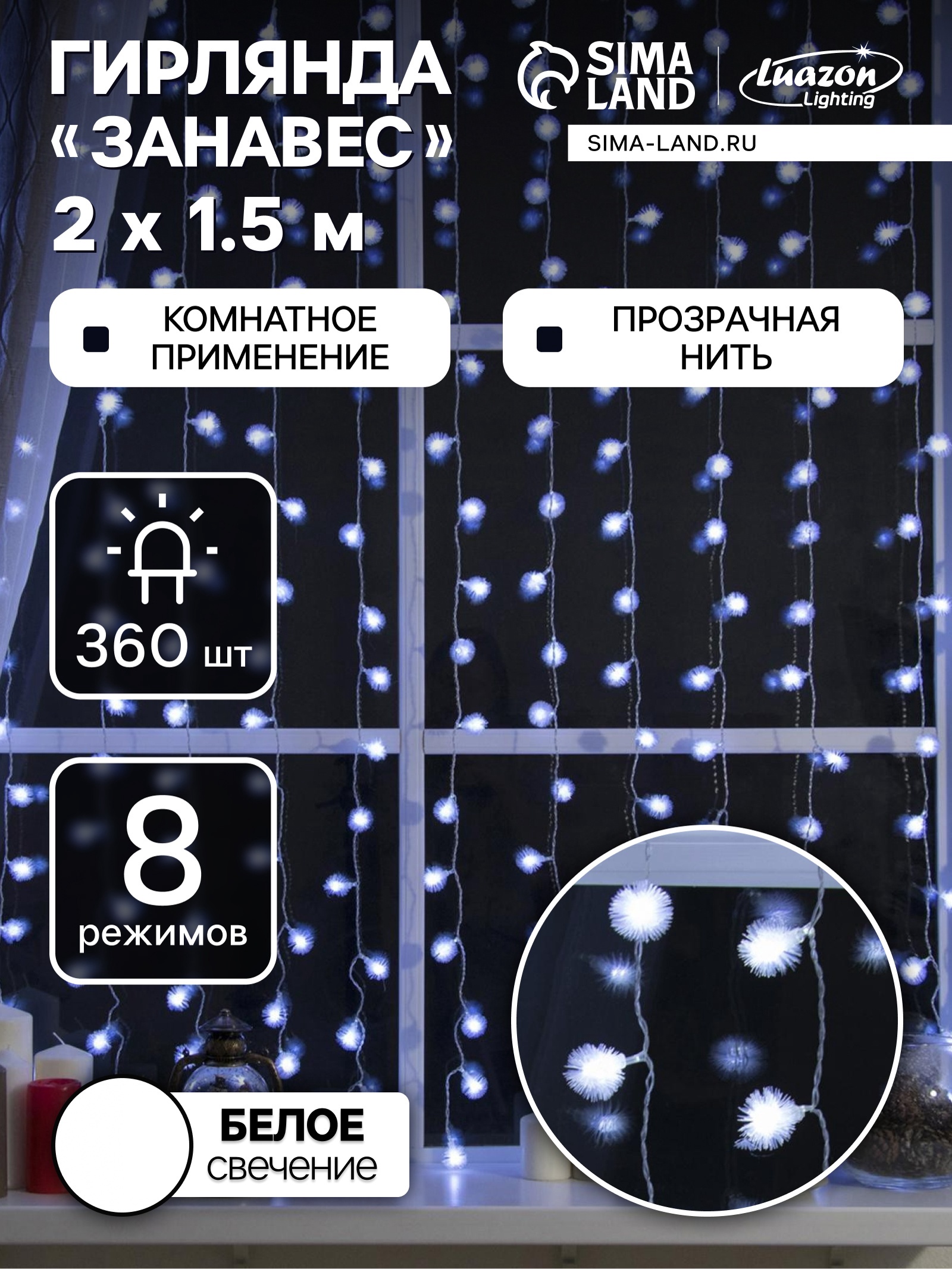 Гирлянда «занавес» 2 х 1.5 м с насадками «ёжики», Ip20, прозрачная нить, 360 Led, свечение белое, 8 режимов, 220 в