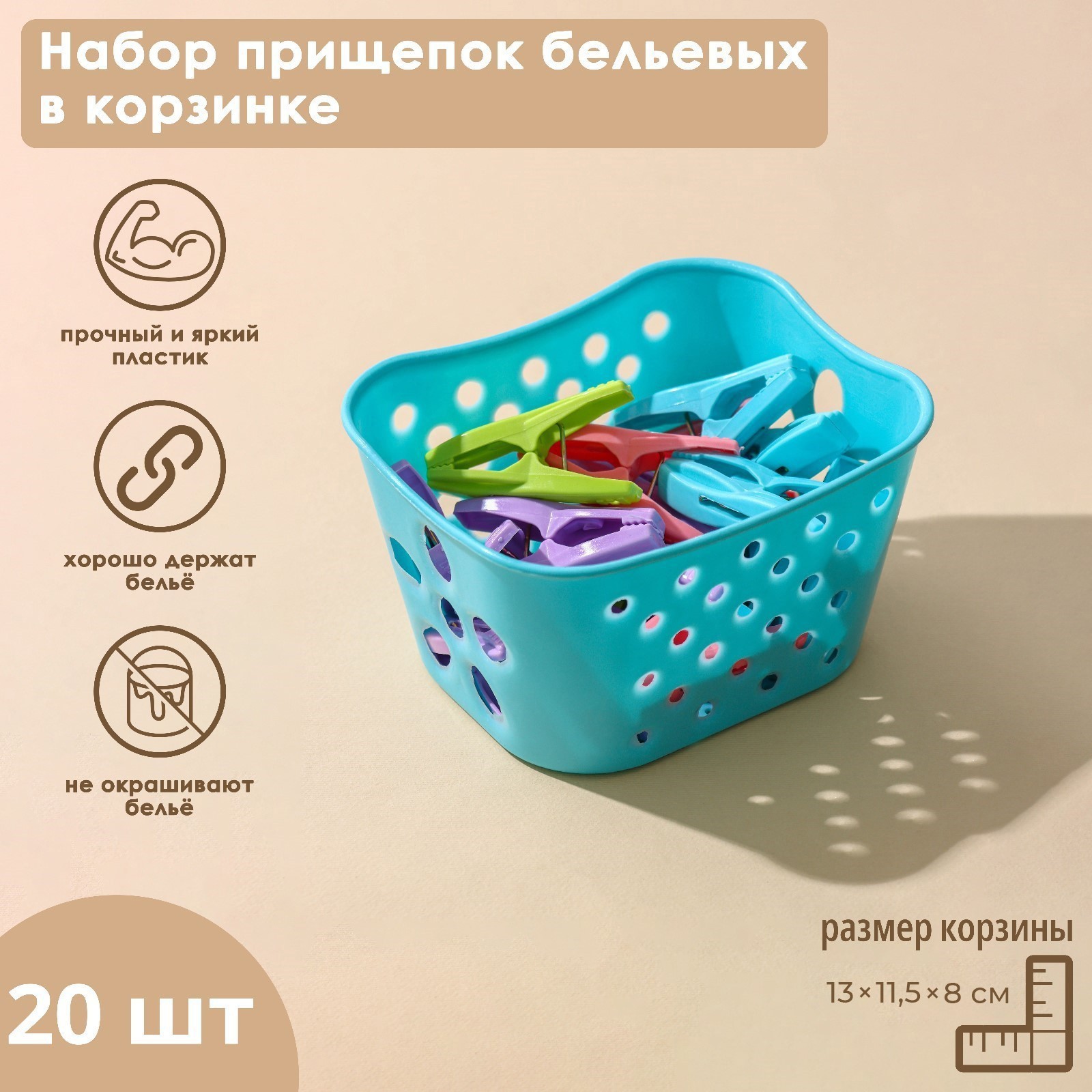 Набор прищепок бельевых в корзинке доляна, 6 см, 20 шт, цвет микс. Обычные прищепки — это всего лишь бытовой товар. Прищепки, которые предлагает наш магазин — это ещё и привлекательный аксессуар интерьера. Жёлтые, красные, синие, зелёные цвета порадуют вас и поднимут настроение. Только представьте, с какой радостью дети помогут маме, если в их маленьких ручках окажутся эти прищепки, которые выглядят как настоящие разноцветные игрушки. Кроме того, прищепки больше не будут пропадать и обнаруживаться в самых неожиданных местах: в комплект включена цветная корзинка для их хранения. Цвет: МИКС В упаковке, шт.: 20 tnved: 3924900009 Материал: Пластик  развернуть описание ▼