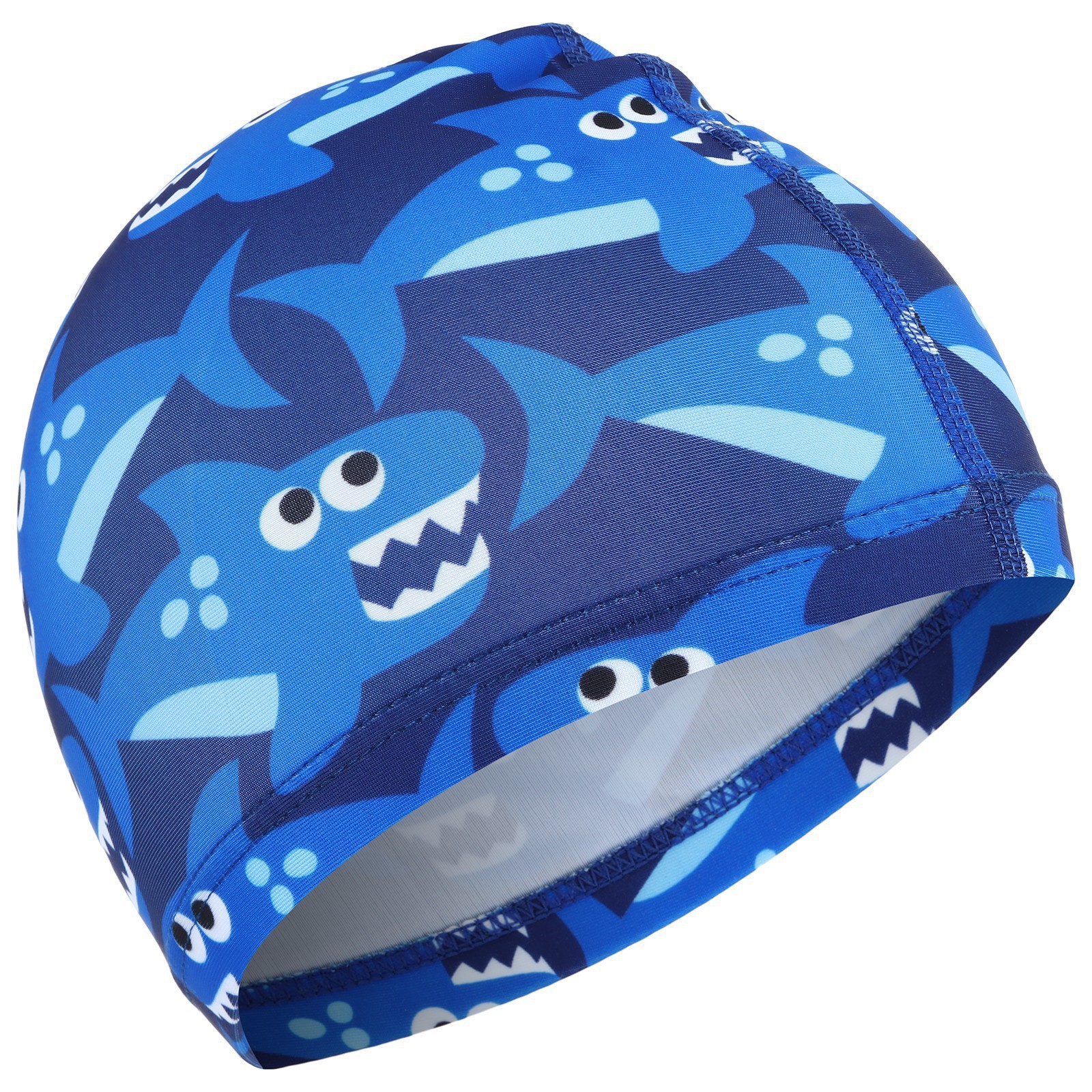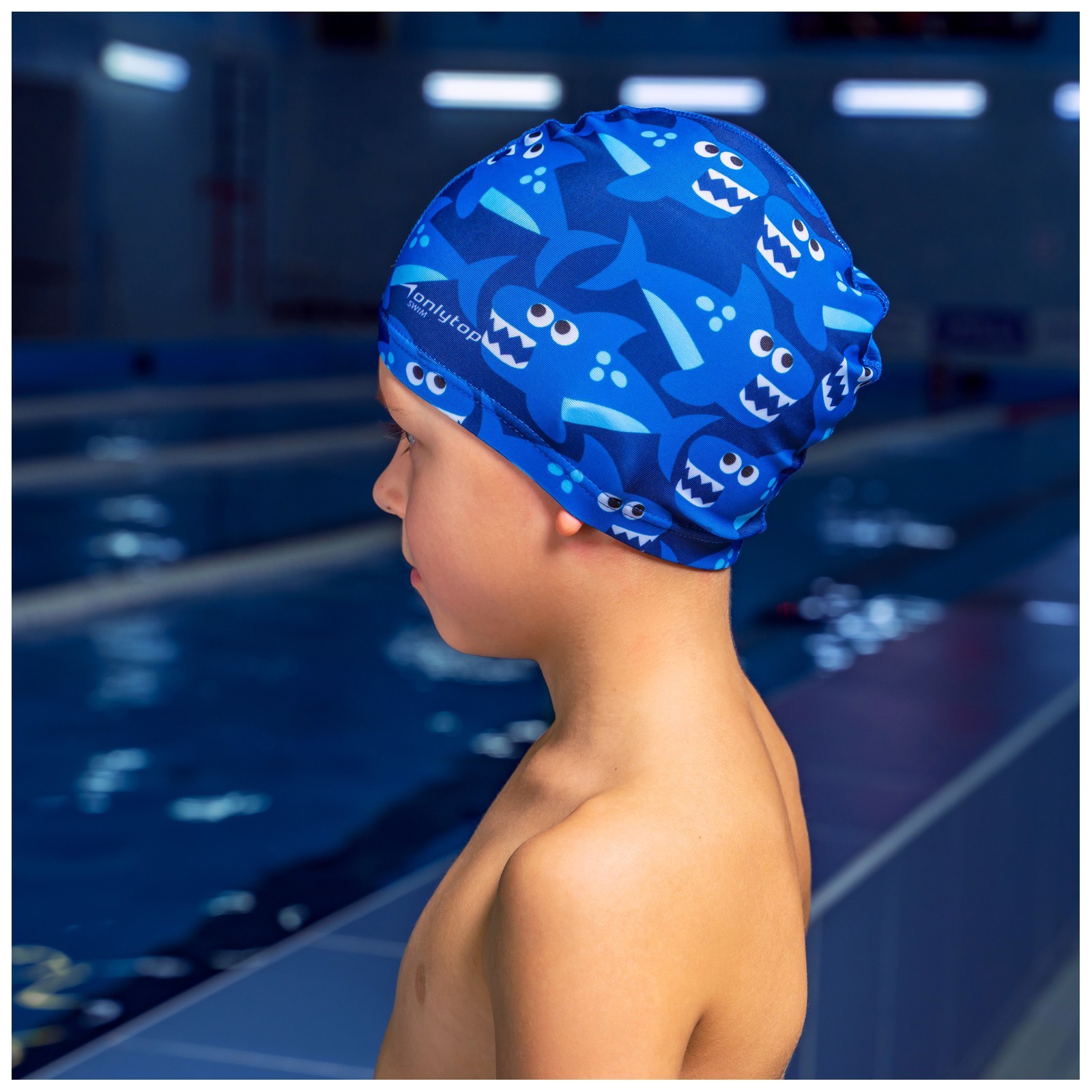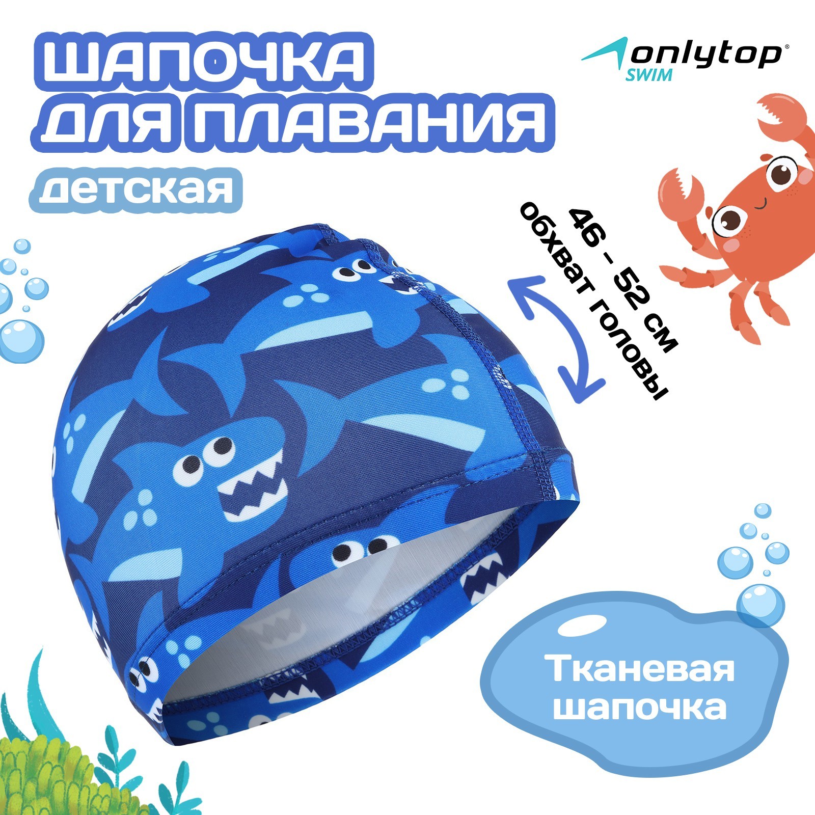 Шапочка для плавания детская onlytop swim «акулы», тканевая, обхват 46-52 см. Шапочка для плавания защищает волосы от намокания, позволяя им оставаться относительно сухими, но не обеспечивает 100% сухости при плавании с погружением головы. Защищает волосы от вредного воздействия хлорированной воды. Убранные под шапочку волосы не лезут в глаза и не отвлекают пловца. Препятствует попаданию волос в воду бассейна и в фильтры очистки, предотвращая их засорение. Уменьшает сопротивление воды, которое создают волосы и уши при активном плавании. Подходит для детей: от 3 до 6 лет. Цвет: Синий Возраст: Детский Материал: Полиэстер Материал: Эластан  развернуть описание ▼