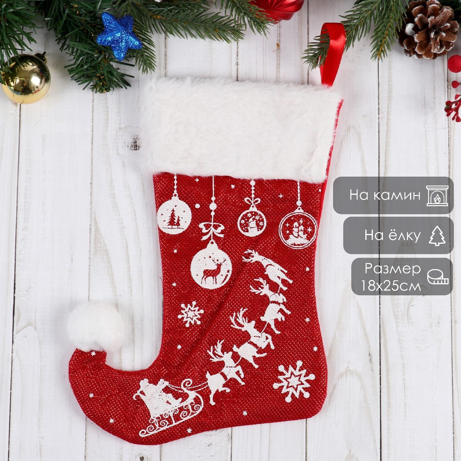Носок для подарков «волшебство. оленья упряжка», 18 25 см, красный. Праздник, который приезжает на упряжке. Новогодний носок «Оленья упряжка» — это текстильный сапожок красного цвета с рисунком животных, размером 18 25 см. Изделие выполнено в стиле новогоднего барокко, скандинавского уюта и фьюжн — сочетая традиции и современный подход к оформлению. Это не просто мешочек для подарков — он становится частью зимней сказки, которую можно повесить на ёлку, камин или поставить как декоративный акцент в уголке праздника. Красный — цвет тепла и радости: Цвет подчёркивает зимнее торжество, легко вписывается в классическое и современное новогоднее оформление.Рисунок оленьей упряжки — отсылка к зимним легендам: Мотив усиливает ощущение движения чуда и делает аксессуар узнаваемым без лишних деталей и пестроты.Текстиль — мягкость и долговечность: Материал приятен на ощупь, сохраняет форму после нескольких сезонов использования и легко чистится.Форма сапожка — связь с доброй традицией: Это не просто носок — он напоминает о том, как в детстве мы верили: если повесить его вечером, утром обязательно найдёшь подарок.Стиль — от барокко до фьюжн: Новогодний декор гармонично дополняет разные интерьерные решения, становясь частью целостной атмосферы праздника.История, которая живёт дома: Этот носок — не просто место для подарка, а символ ожидания волшебства. Он подходит тем, кто помнит детскую веру в чудо и ценит стиль без излишеств. «Оленья упряжка» — мягкий намёк: праздник уже в пути, и он начнётся там, где его ждут с открытой душой и добрым сердцем. Набор:Нет|Цвет:Красный|Размер, см:18 х 25|Тематика:Новогодняя|Рисунок:Да|Символ года:Нет|Тематика праздника:Новый год|Материал:Текстиль|Стиль:Фьюжн|Стиль:Скандинавский|Стиль:Новогоднее барокко|Страна:Китай  развернуть описание ▼