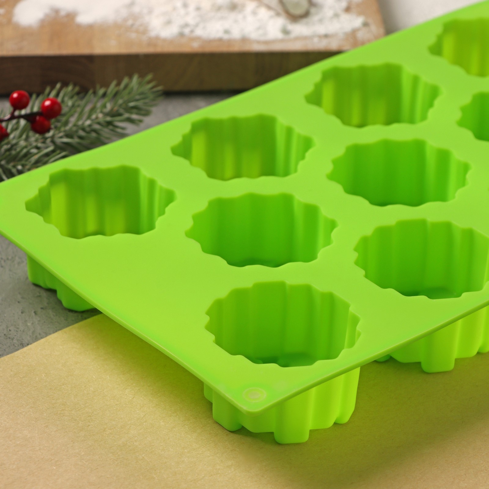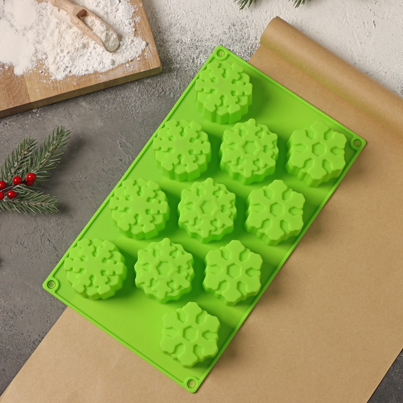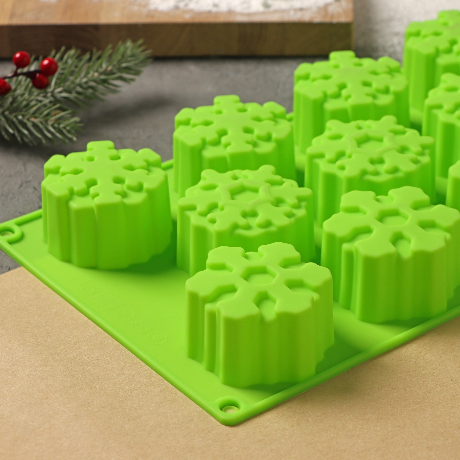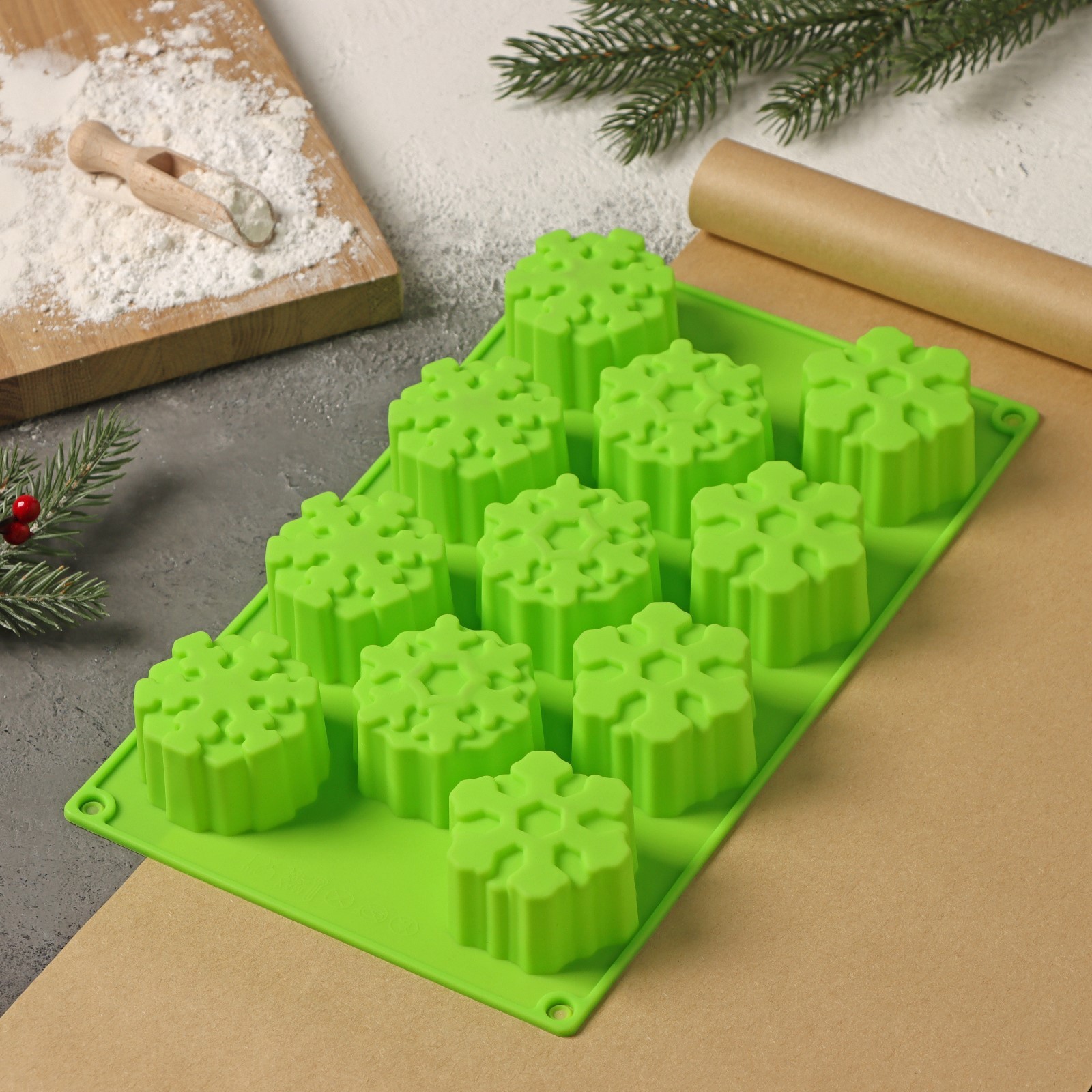 Форма силиконовая для выпечки доляна «снежинка», 30x17,5 см, 11 ячеек, цвет салатовый. Силиконовая форма подойдёт для приготовления любых блюд. Изделие обладает антипригарными свойствами, за счёт чего выпечка легко вынимается и не пригорает. Форма не прихотлива, её легко мыть и удобно хранить, выдерживает температуру –40. . . +230°С. Она не вступает в химическую реакцию с продуктами и не выделяет вредных веществ. Используйте форму в духовых шкафах, микроволновых печах и аэрогрилях. Главное, избегайте контакта с открытым огнём. Цвет: Зелёный Форма: Фигурная parts count: 0 Фасовка, шт.: 10 Количество ячеек: 11 tnved: 3924100000 Крышка: Нет Материал: Силикон Тип покрытия: Без покрытия Ячейки: Да Наличие палочек для форм: Нет Тип формы: Для печенья и пирожных Разъёмная форма: Нет Съёмное дно: Нет Тематика: Новый год Размер ячейки, см: 5 х 5 х 2.5 Можно мыть в посудомоечной машине: Да Форма: Фигурная  развернуть описание ▼