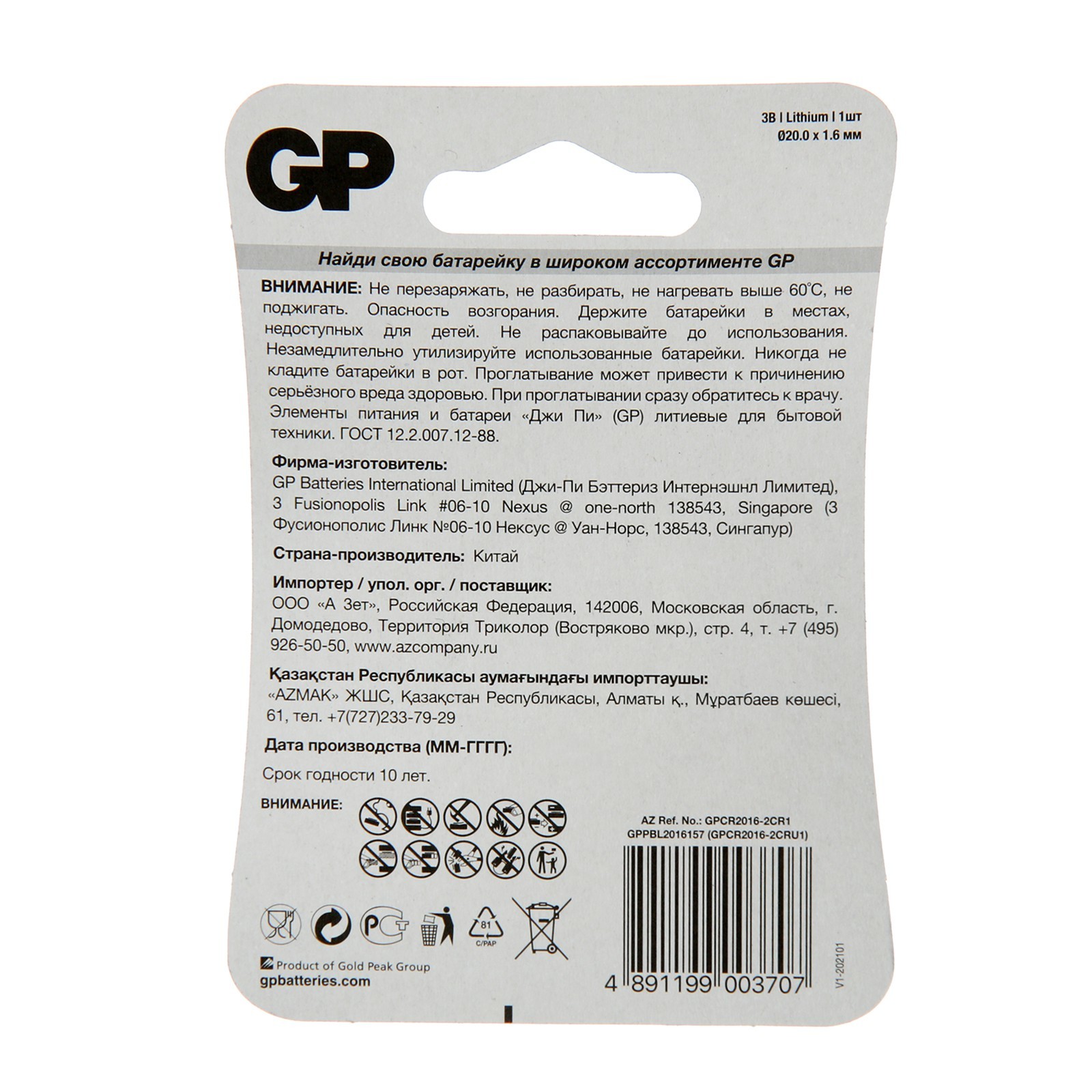 Батарейка литиевая Gp, Cr2016-1bl, 3в, блистер, 1 шт.