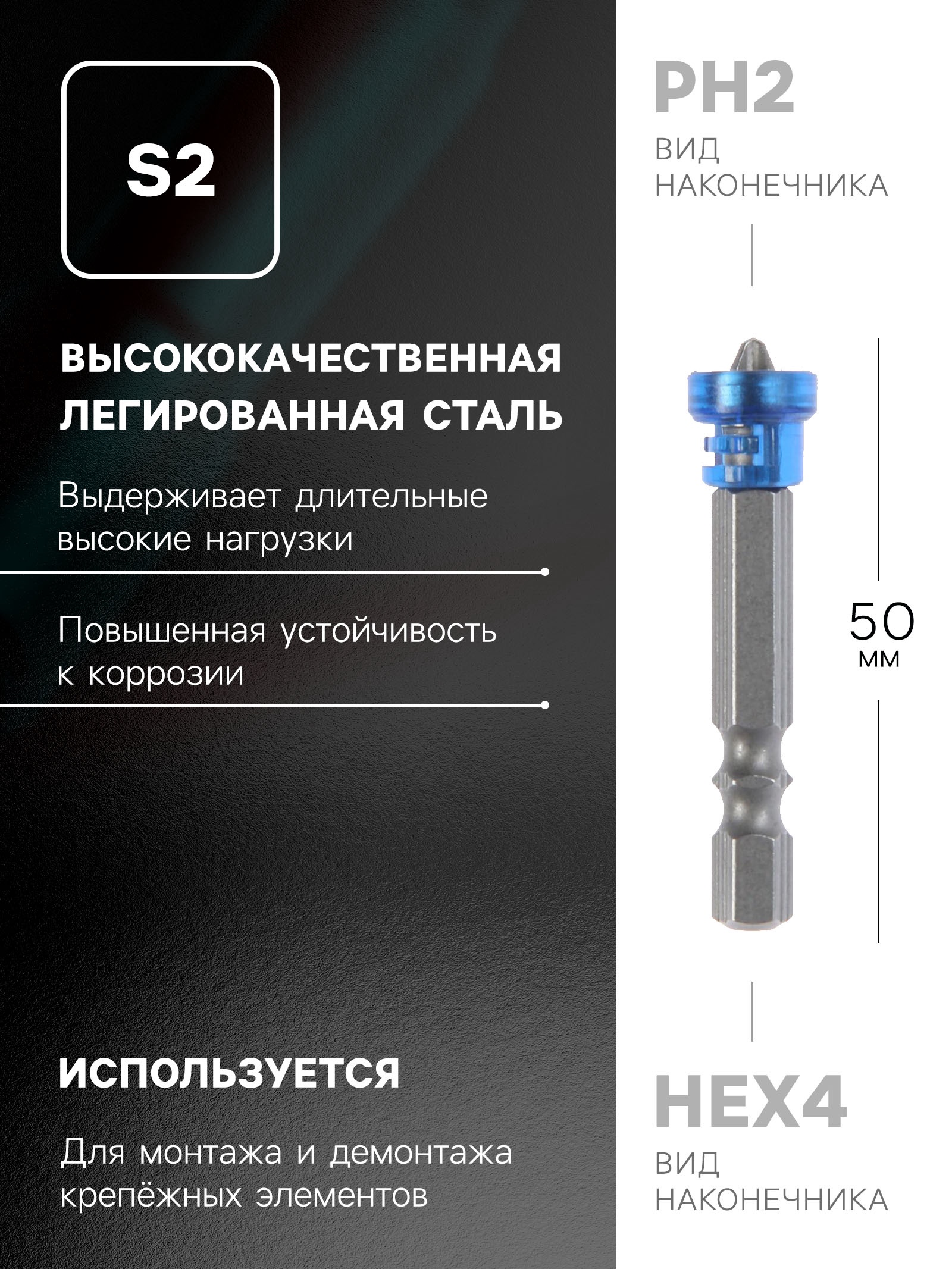 Биты тундра, намагниченные, сталь S2, круглый магнитный фиксатор, Ph2 50 мм, 2 шт.