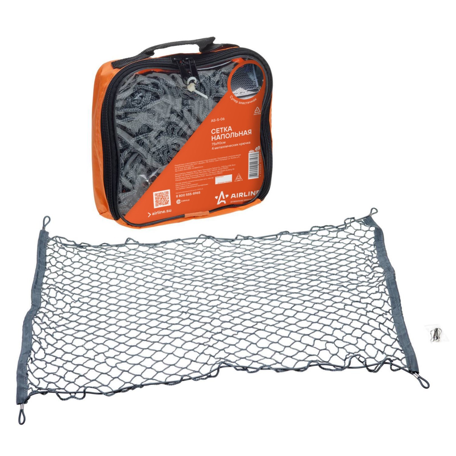 Сетка багажная для крепления груза airline as-s-06, 75х90 см, 4 металлических крючка. Сетка напольная – это доступный и бюджетный вариант для закрепления груза в багажнике автомобиля. Принцип работы сетки прост - с помощью 4 металлических крючков изделие закрепляется в багажном отделение автомобиля (в специальные встроенные крепежи) и плотно прижимает перевозимый груз к полу машины. Это позволяет не только обезопасить багаж и багажник от повреждений, но и избавиться от лишнего шума при перемещении груза во время езды. Цвет: Серый Тип крепления: Крючки Вид: Сетка  развернуть описание ▼