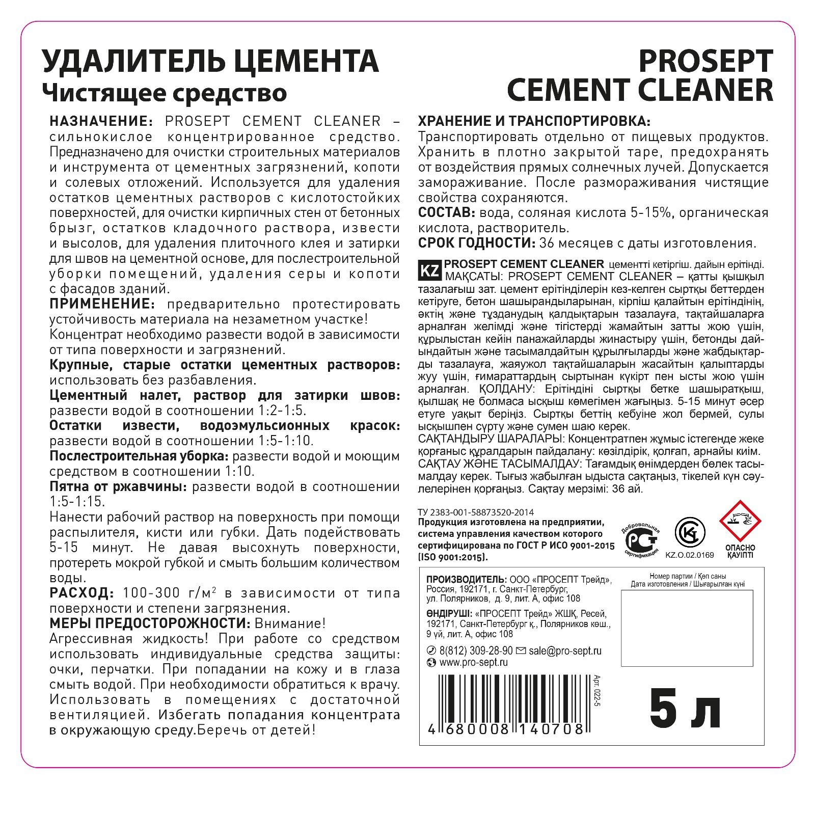 Удалитель цемента prosept cement cleaner, концентрат 1:2, 5 л. Удалитель цемента Prosept – сильнокислое концентрированное моющее средство, которое эффективно очищает строительный материал и инструменты от цементных загрязнений, копоти и солевых отложений. Преимущества: • удаляет остатки цемента с любых поверхностей; • очищает стены от бетонных брызг, извести и высолов; • удаляет остатки плиточного клея и затирки для швов; • можно использовать для мытья форм при изготовлении тротуарной плитки; • подходит для устранения серы и копоти с фасадов зданий. Способ применения: Концентрат необходимо развести водой в зависимости от типа поверхности. Крупные старые остатки цементных расворов: использовать без разбавления. Цементный налёт, раствор для затирки швов: развести водой в соотношении 1:2-1:5. Остатки извести, водоэмульсионных красок: развести водой в соотношении 1:5-1:10. Послестроительная уборка: развести водой и моющим средством в соотношении 1:10. Пятна от ржавчины: развести водой в соотношении 1:5-1:15. • Нанести рабочий раствор на поврехность при помощи распылителя, кисти или губки. • Дать подействовать 5-15 минут. • Не давая высохнуть поверхности, протереть мокрой губкой и смыть большим количеством воды. Расход: 100-300 г/м2 в зависимости от типа поверхности и степени загрязнения. Меры предосторожности: Внимание! Агрессивная жидкость! При работе со средством использовать индивидуальные средства защиты: очки, перчатки. При попадании на кожу и в глаза смыть водой. При необходимости обратиться к врачу. Использовать в помещениях с достаточной вентиляцией. Избегать попадания концентрата в окружающую среду. Беречь от детей! Объём, л: 5 Вес, кг/Объём, л: 5 Вес, г/Объём, мл: 5000 Форма выпуска: Жидкость  развернуть описание ▼