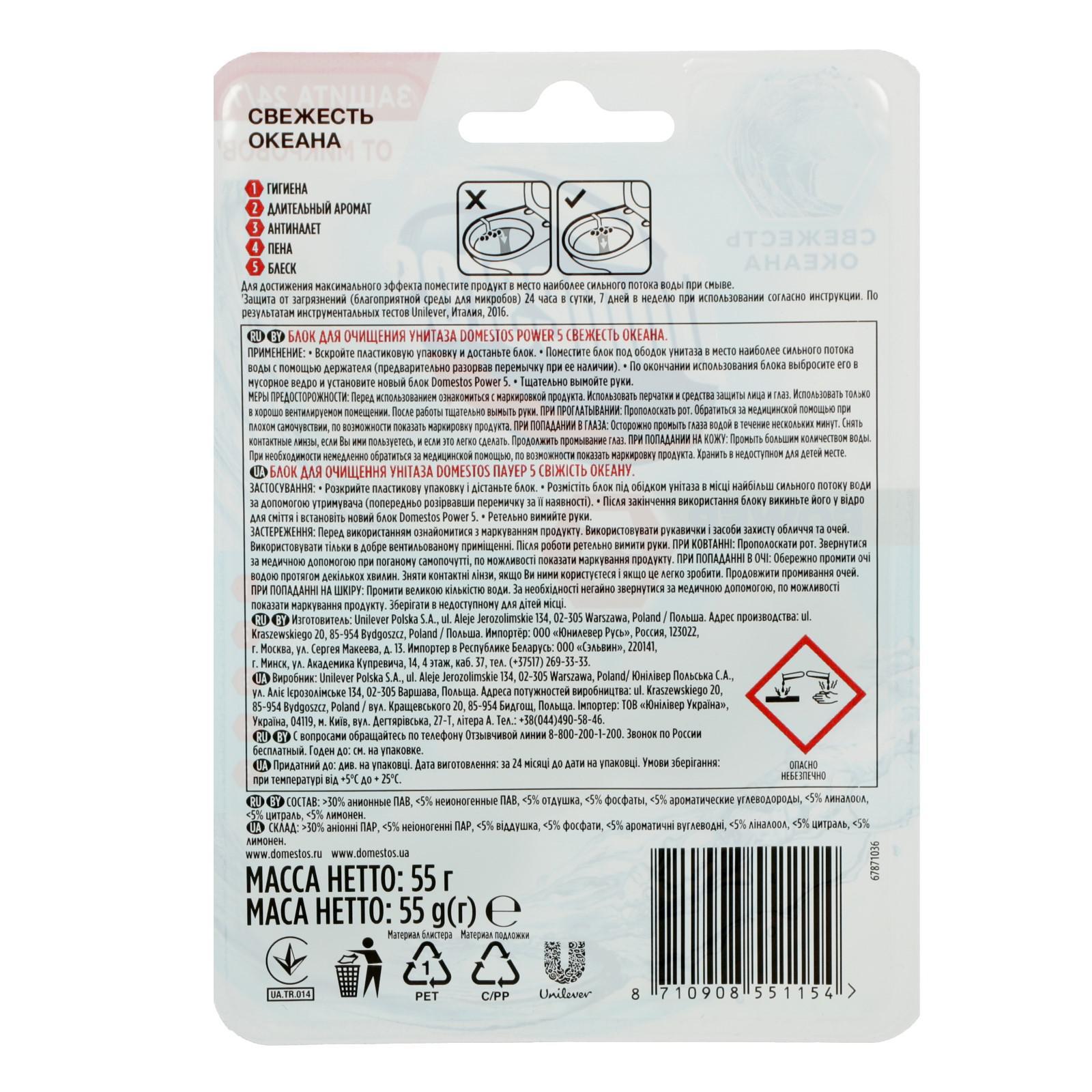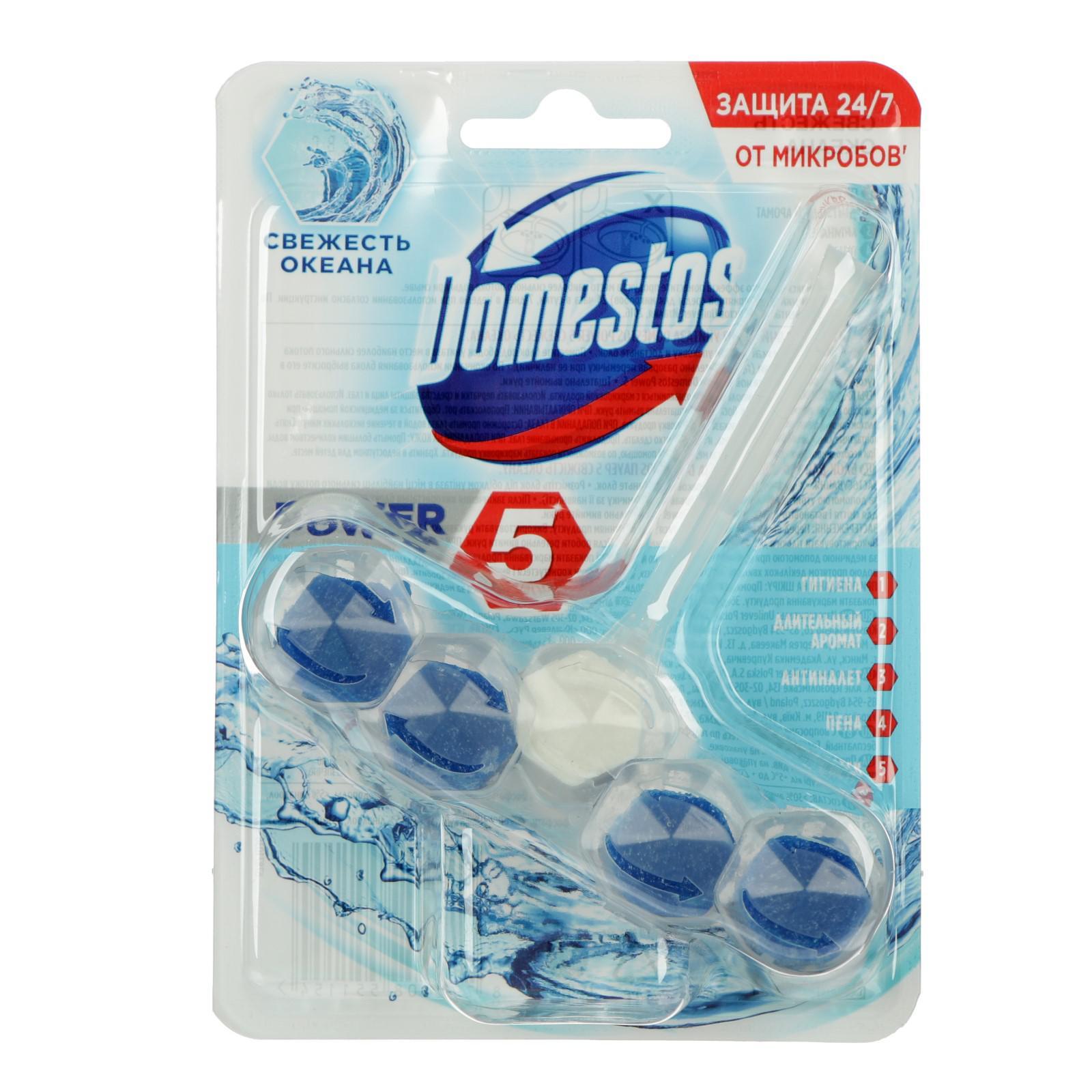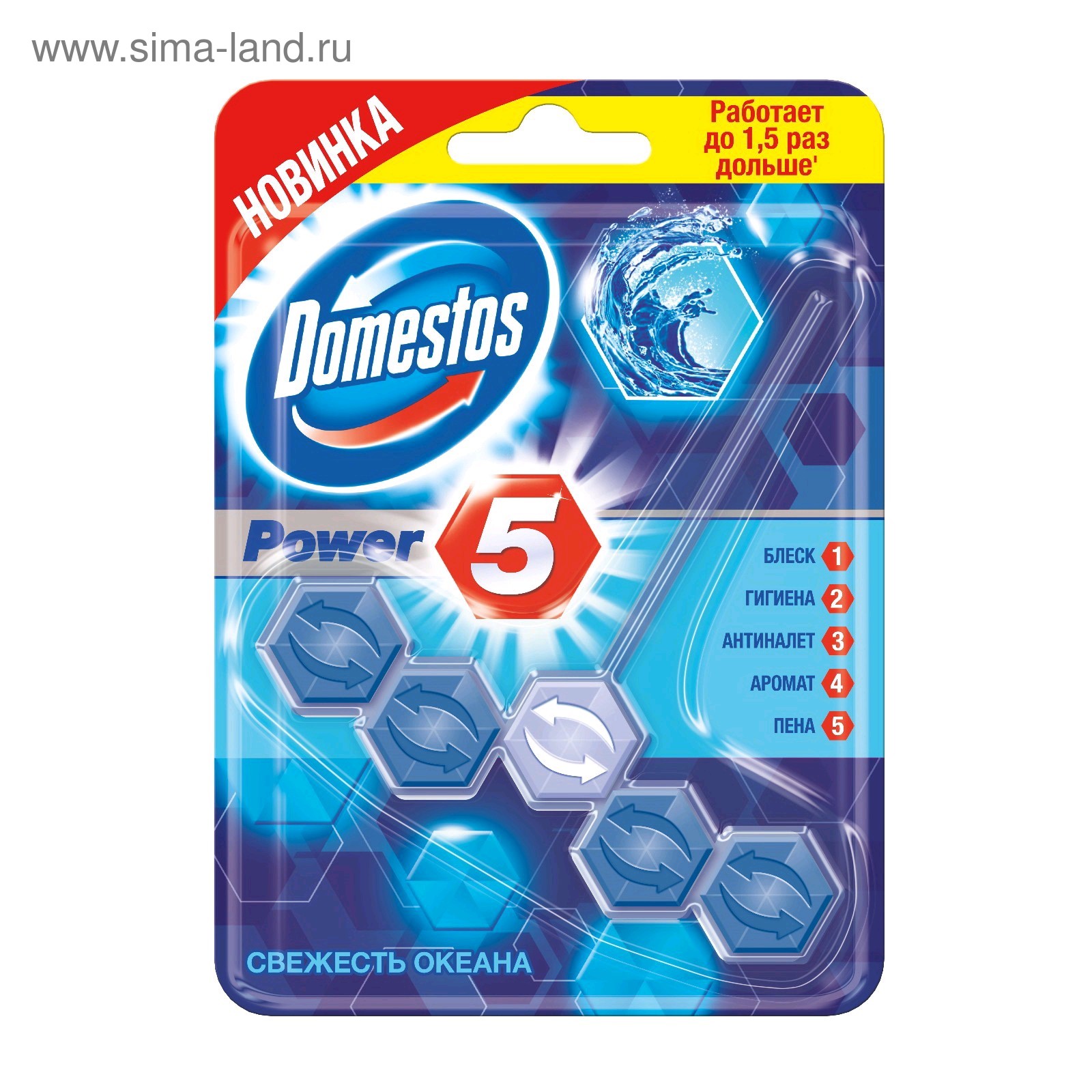 Блок для очищения унитаза domestos power 5 «океан», 55 г. Domestos Сила 5 – пять действий, которые объединились в одном эффективном средстве для интенсивного поддержания чистоты, блеска и приятного аромата в вашем туалете. Domestos Сила 5 – это эффективное средство, которое содержит в себе не один, а целых пять преимуществ, обеспечивающих защиту от загрязнений, а значит и микробов. При использовании блоков Domestos Сила 5 каждое смывание – заряд свежего аромата лайма, который остается в течение длительного времени – до 4х часов. Больше никакого налета на внутренней поверхности унитаза – блок Domestos Сила 5 успешно справляется с данной задачей. Смывание за смыванием блок оставляет обильную пену и аромат, борется с налетом, поддерживает чистоту, оставляя поверхность унитаза блестящей. С блоками Domestos Сила 5 поддержание чистоты и свежести вашего туалета стало проще. Domestos Сила 5 – на защите чистоты, гигиены, а значит и здоровья вашей семьи. Для достижения максимального эффекта поместите продукт в место наиболее сильного потока воды при смыве. Domestos Сила 5 работает до 1, 5 раз дольше. Проводите регулярную уборку Вашего дома с помощью средств Domestos: обработайте унитаз гелем Domestos, очистите различные поверхности (раковина, ванна, шкафчики, полки и другие) с помощью универсального спрея для максимальной дезинфекции, используйте блок для унитаза для поддержания чистоты в Вашем туалете. Вес, г/Объём, мл: 55 Аромат: Океанская свежесть Вид средства: Сменный блок  развернуть описание ▼