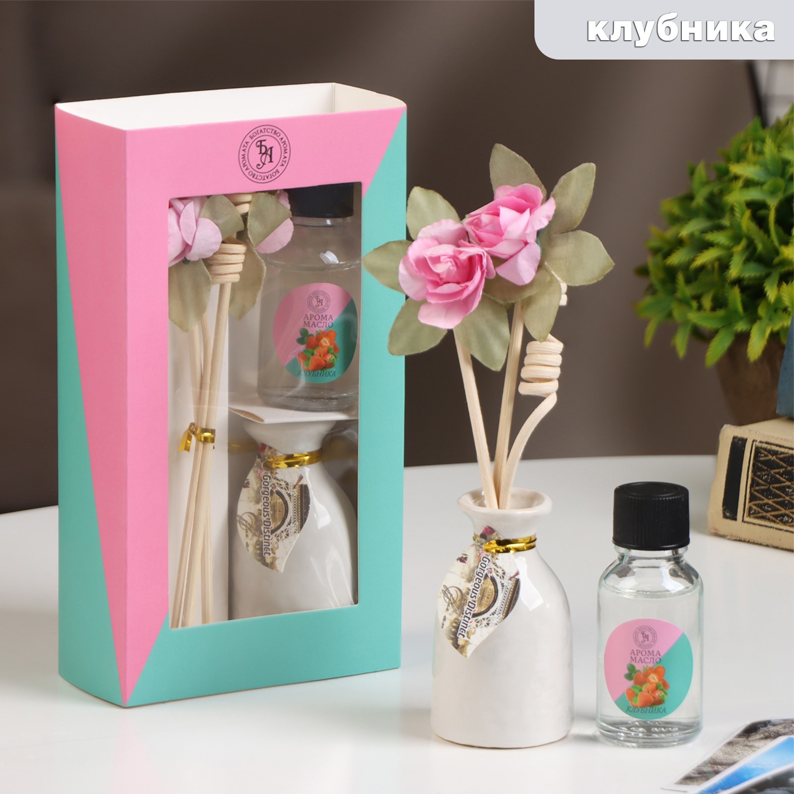Набор подарочный с диффузором "ваза с цветком" клубника, "богатство аромата". Для кого: Унисекс В наборе, шт.: 3 Объём, мл: 15 Вид упаковки: Коробка Адресат: Без адресата Вид ароматизатора: Диффузор Аромат: Клубника Составляющие набора: Декор Составляющие набора: Ваза Составляющие набора: Аромамасло Возраст: Для взрослых Тематика подарка: Интерьер  развернуть описание ▼
