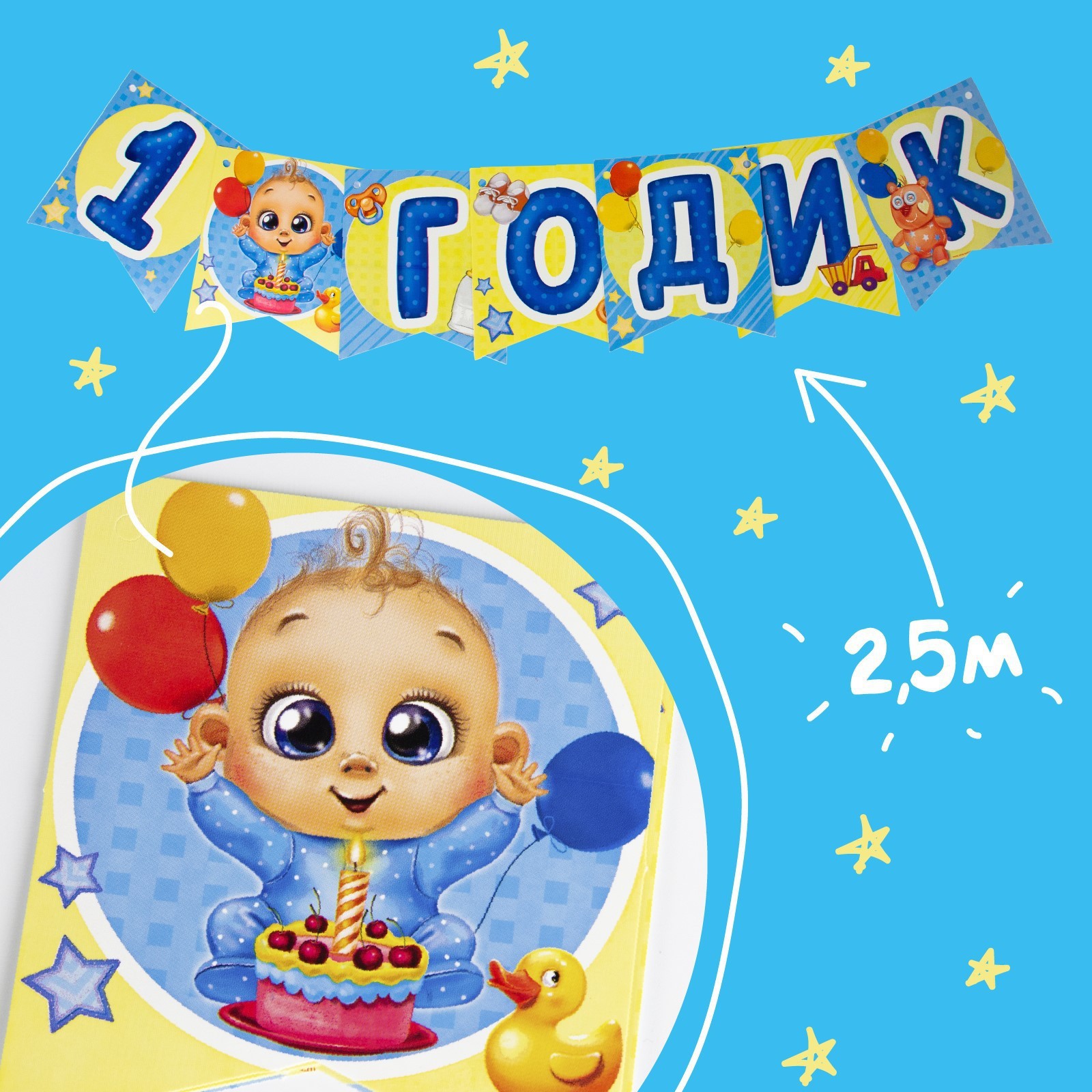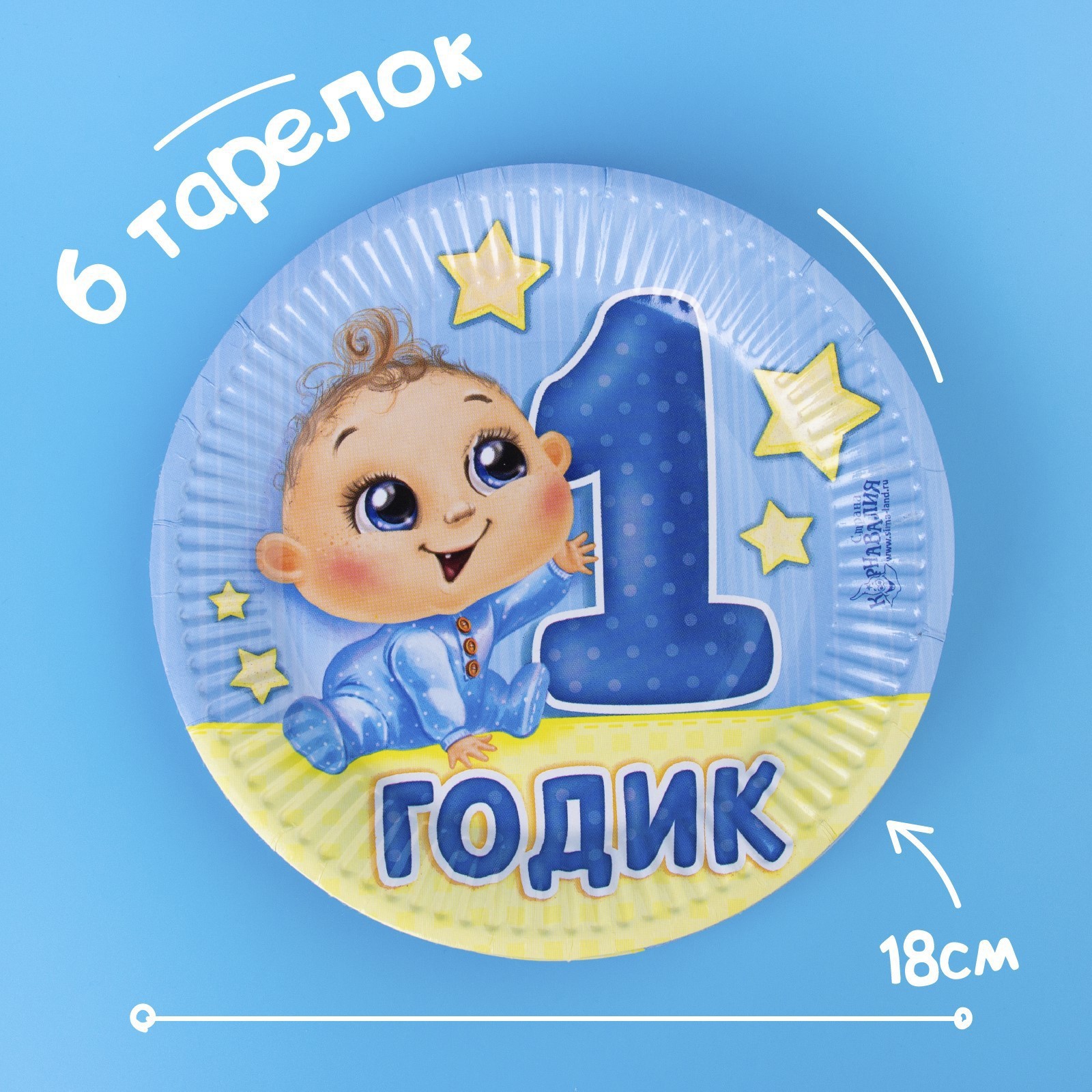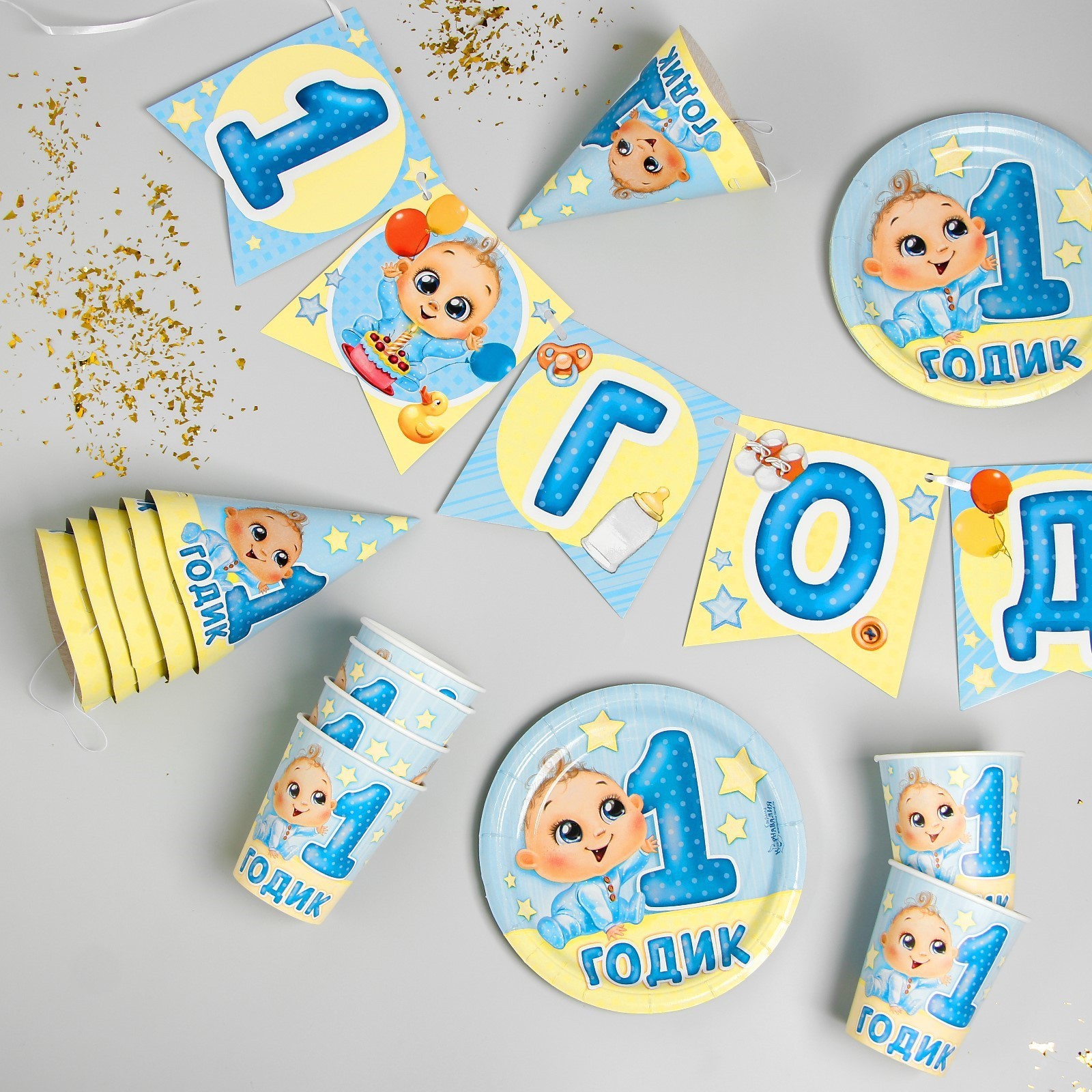 Набор бумажной посуды одноразовый с днём рождения. 1 годик», 6 тарелок, 6 стаканов, 6 колпаков, 1 гирлянда, цвет голубой