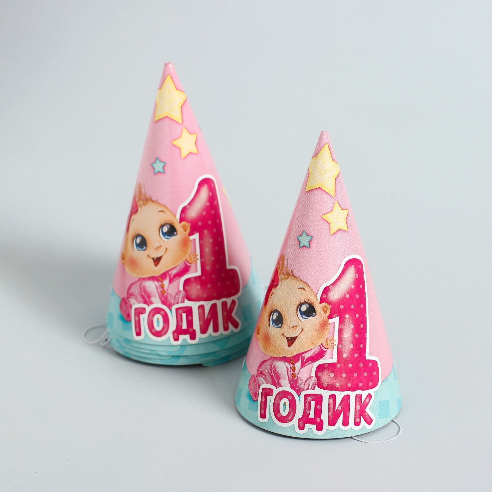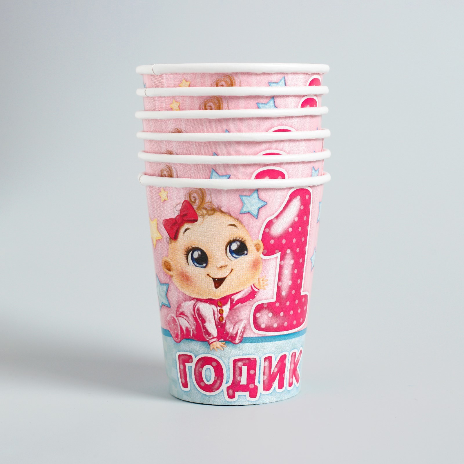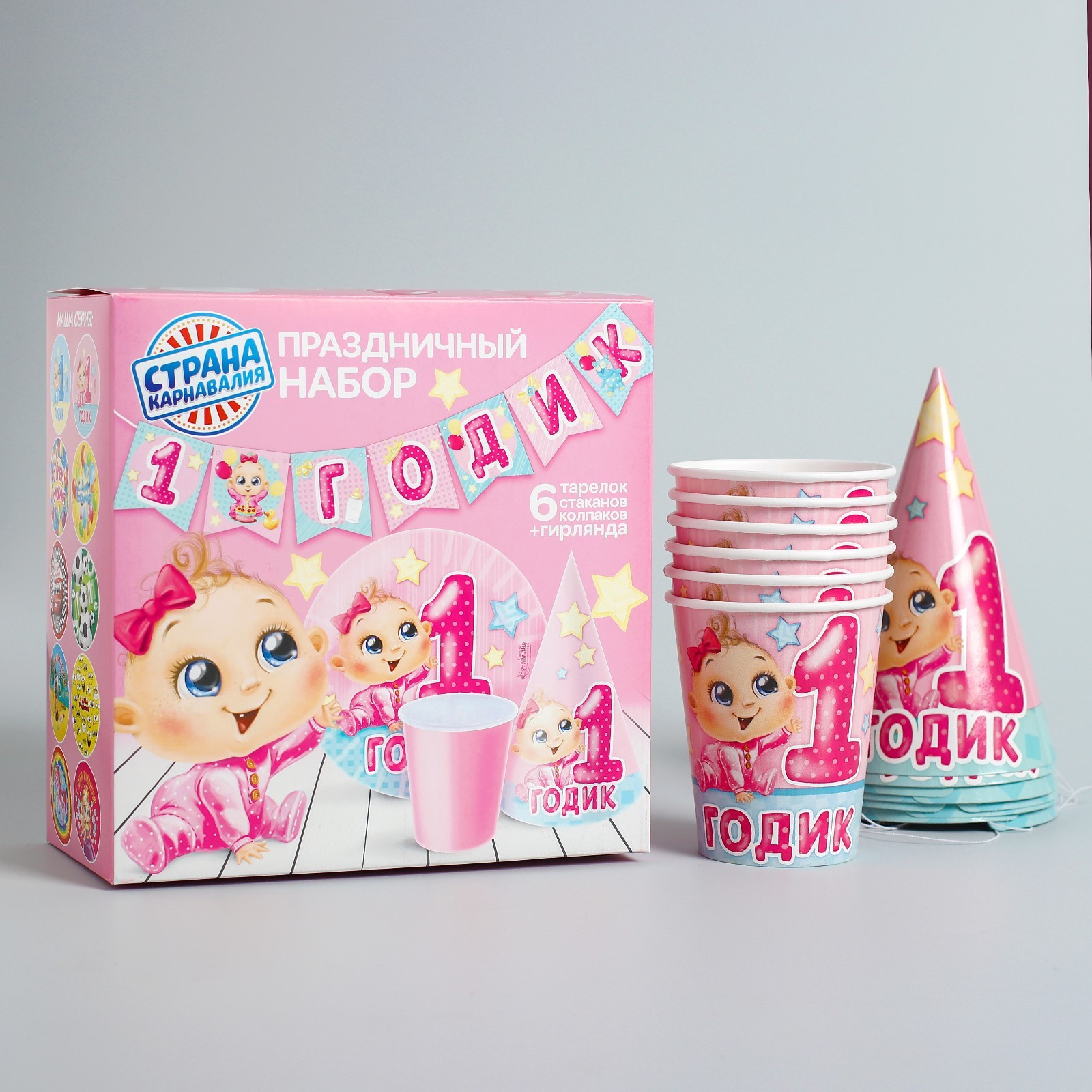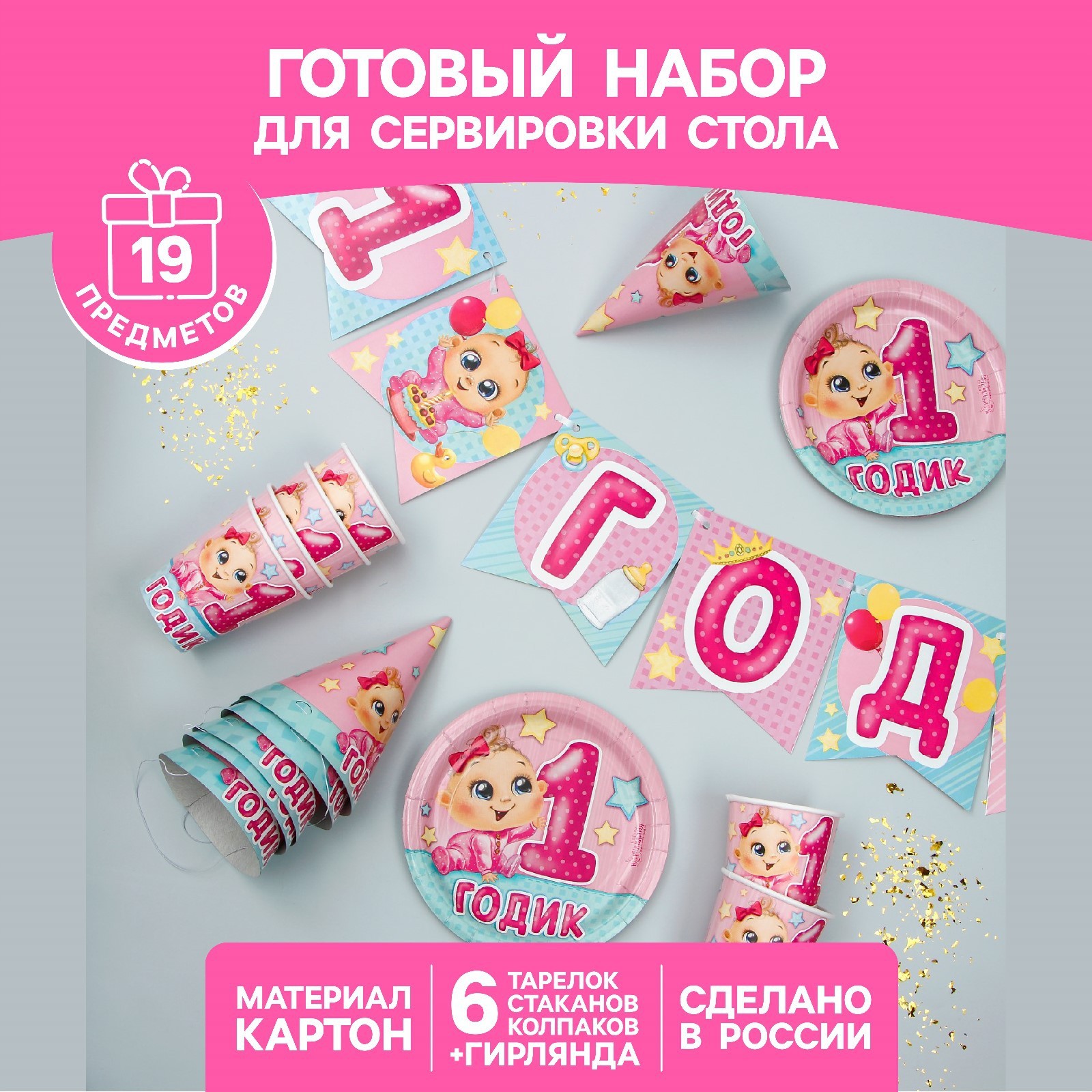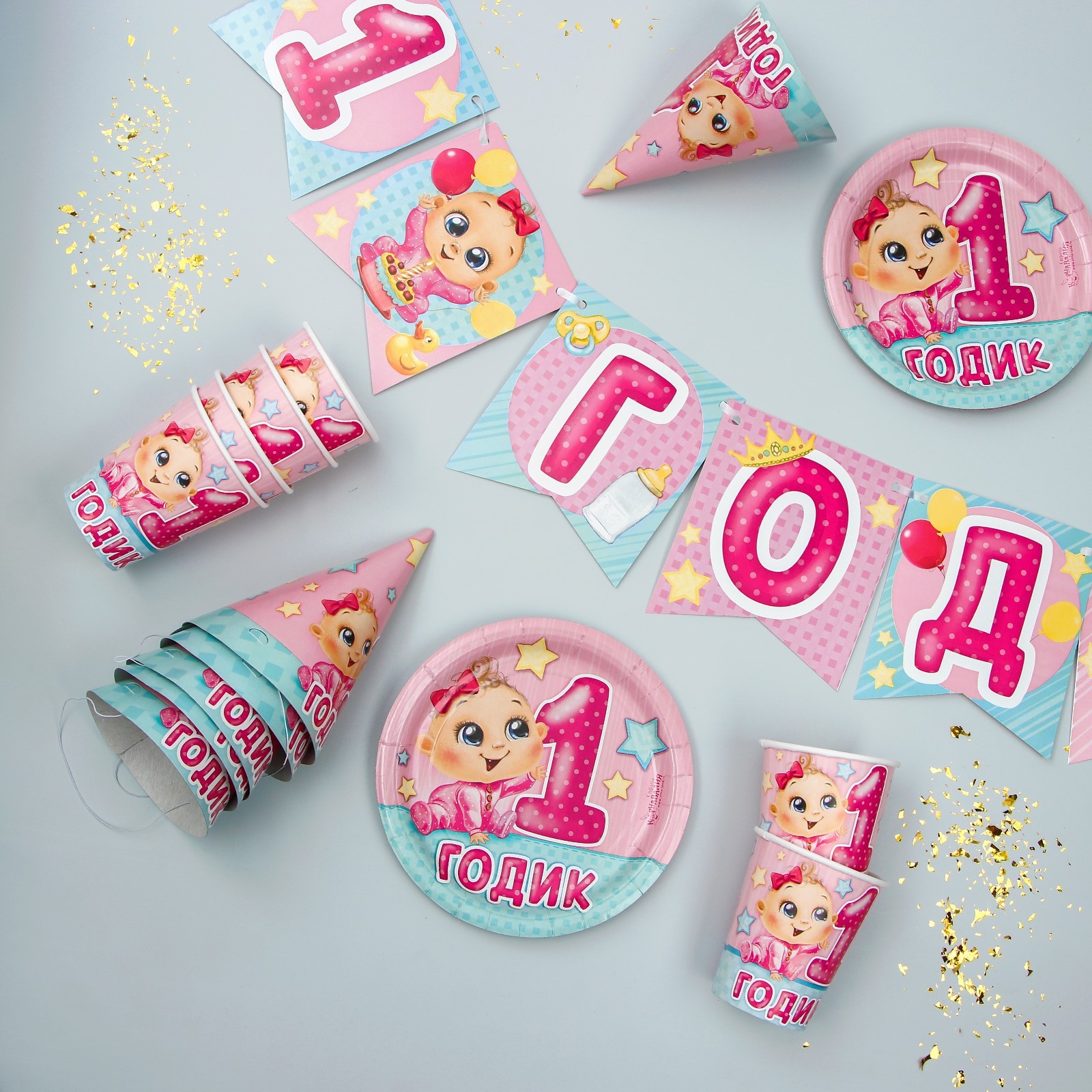 Набор бумажной посуды одноразовый с днём рождения. 1 годик», 6 тарелок, 6 стаканов, 6 колпаков, 1 гирлянда, цвет розовый