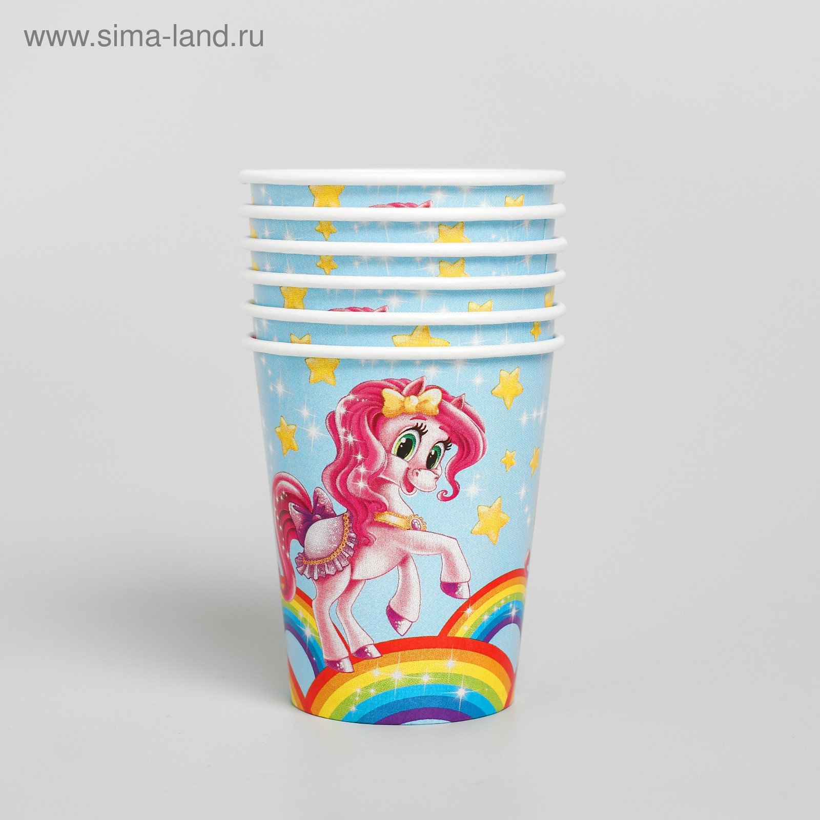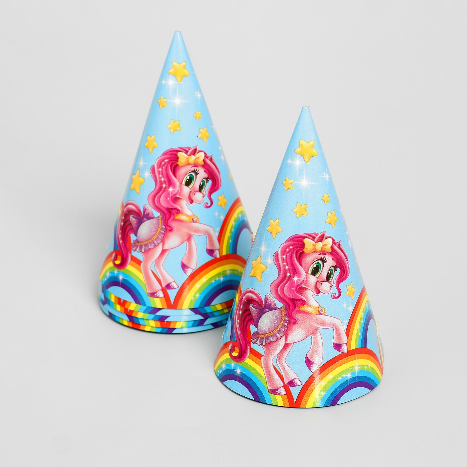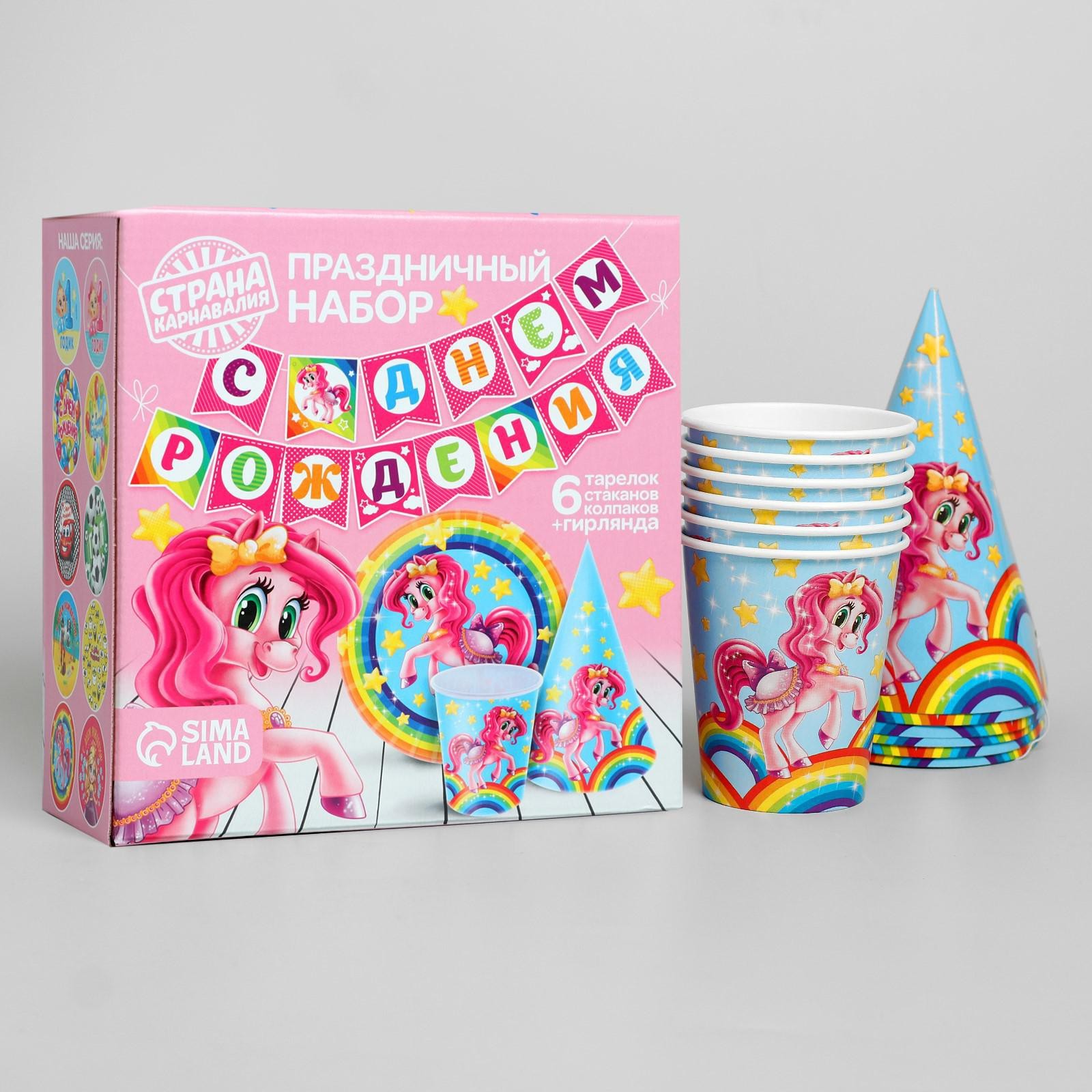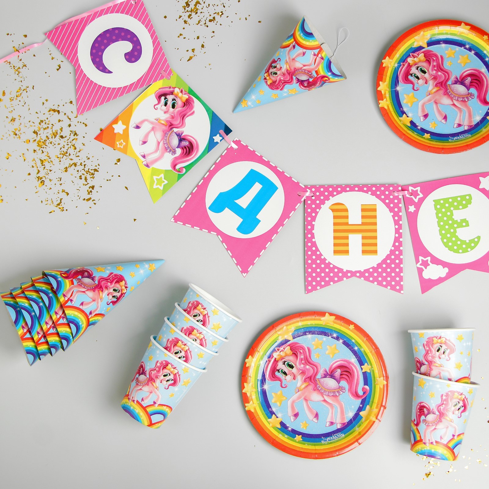 Набор бумажной посуды одноразовый красавица пони», 6 тарелок, 6 стаканов, 6 колпаков, 1 гирлянда