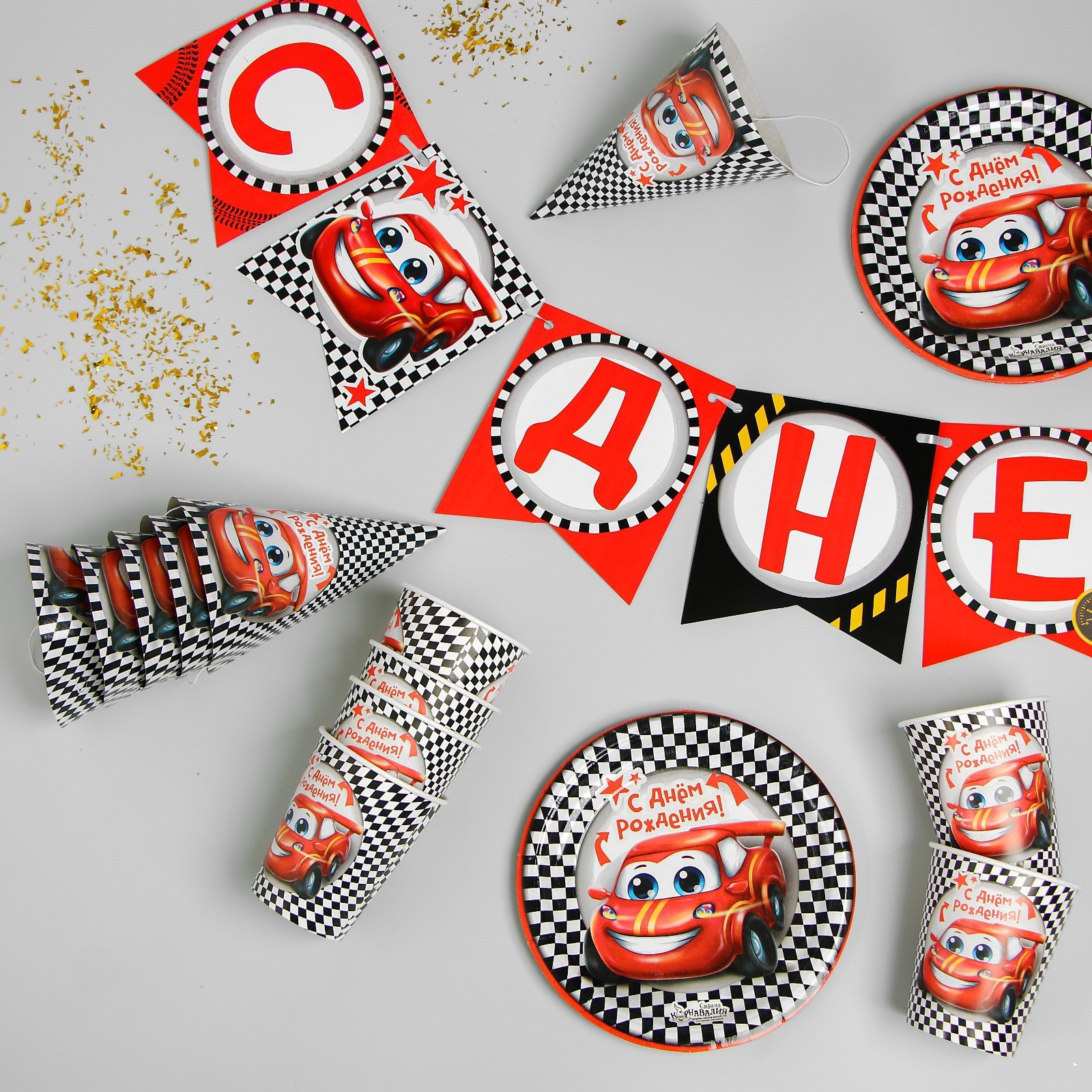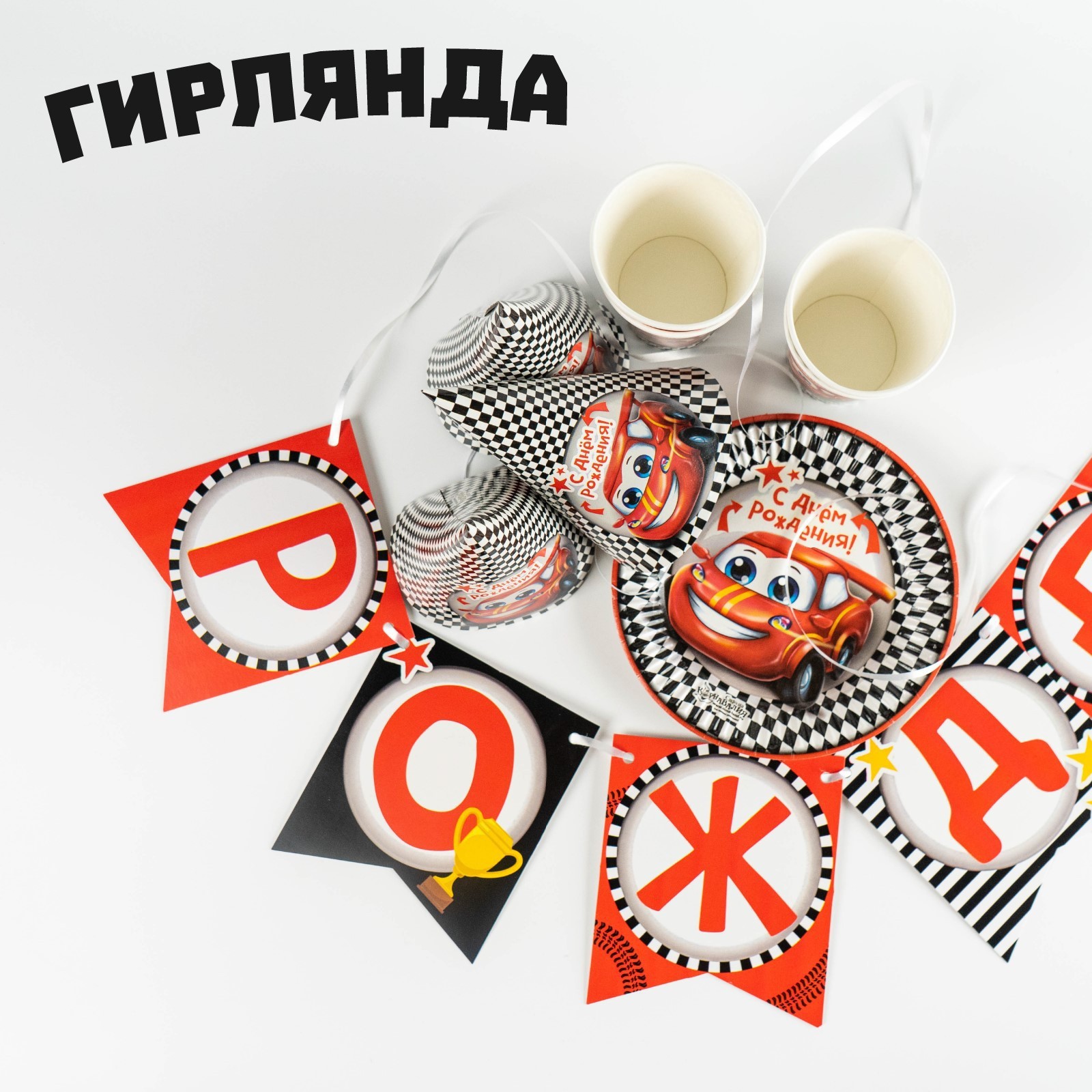 Набор бумажной посуды одноразовый с днём рождения. тачка», 6 тарелок, 6 стаканов, 6 колпаков, 1 гирлянда