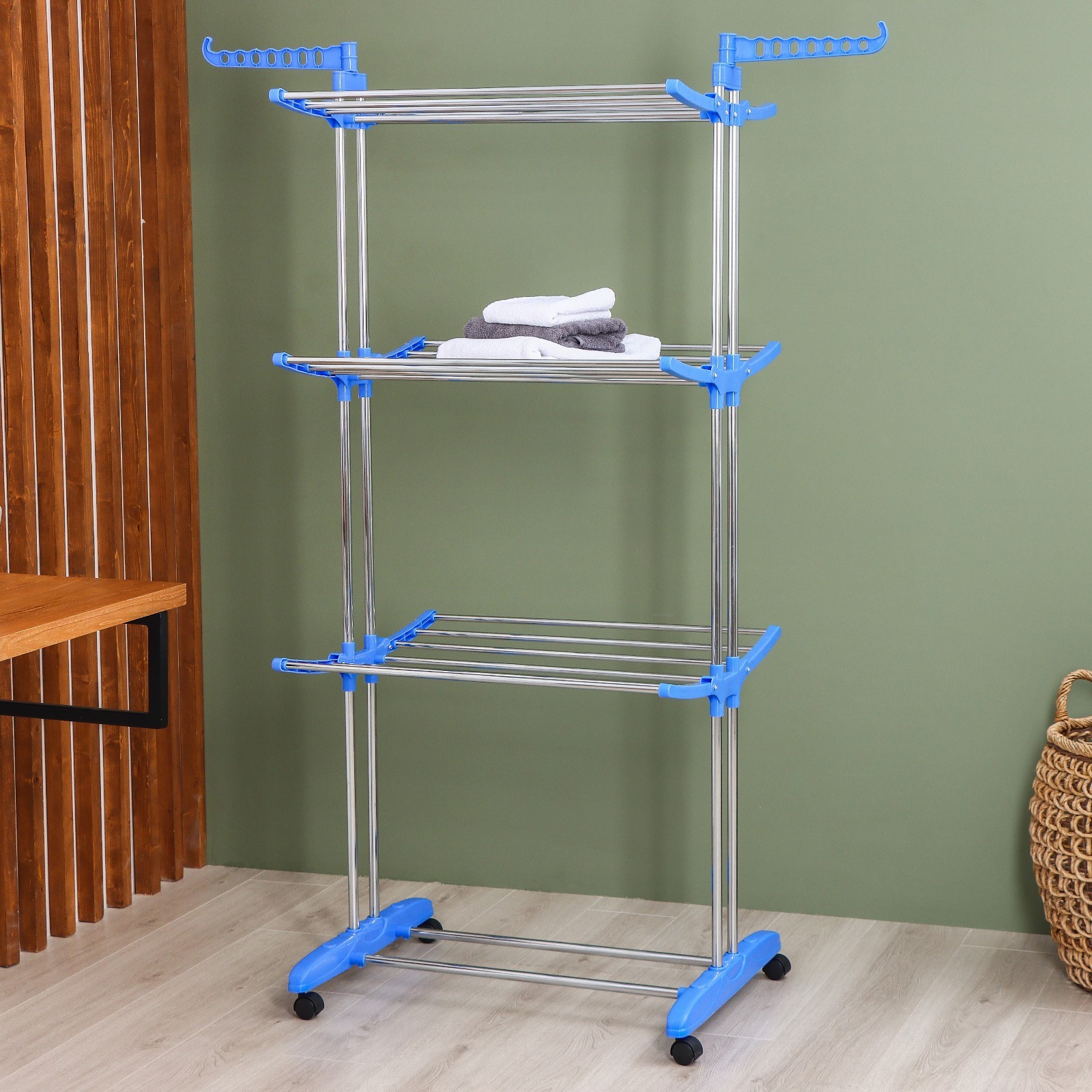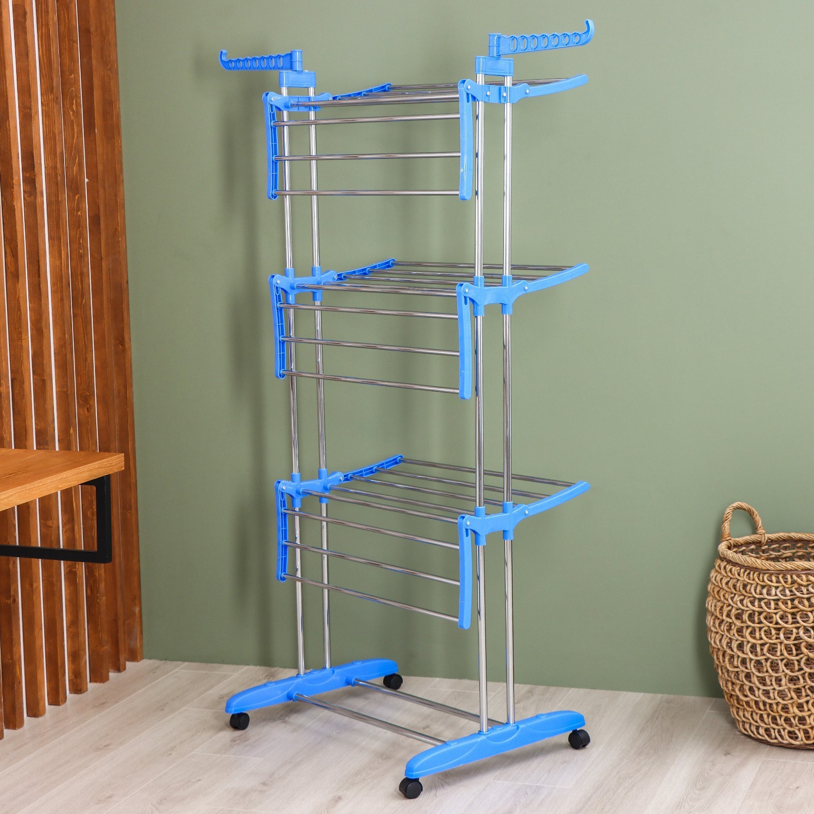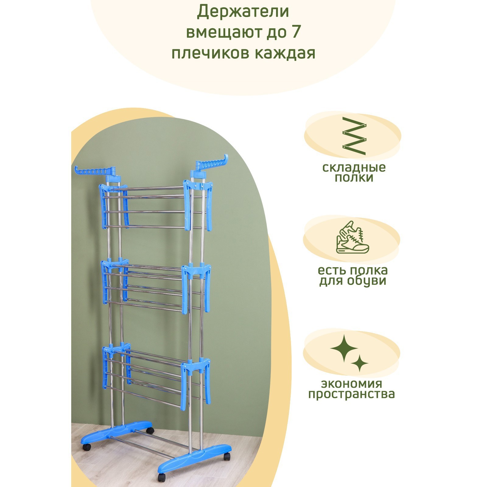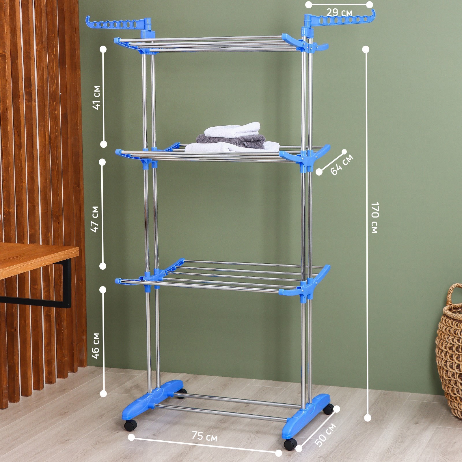 Сушилка для белья напольная 3-х уровневая доляна, 75(126)x64x170 см, рабочая длина 16 м, на колёсах, нержавеющая сталь