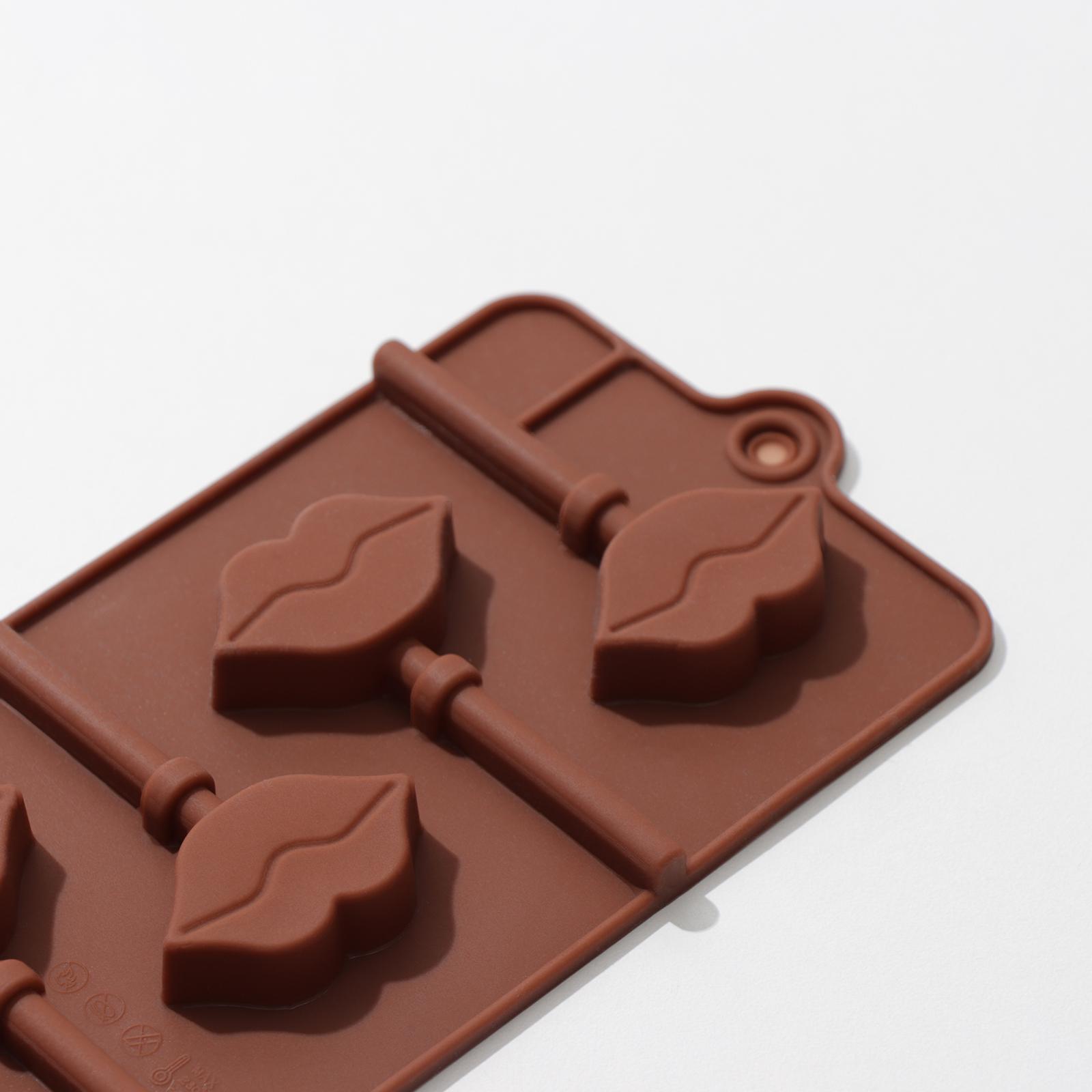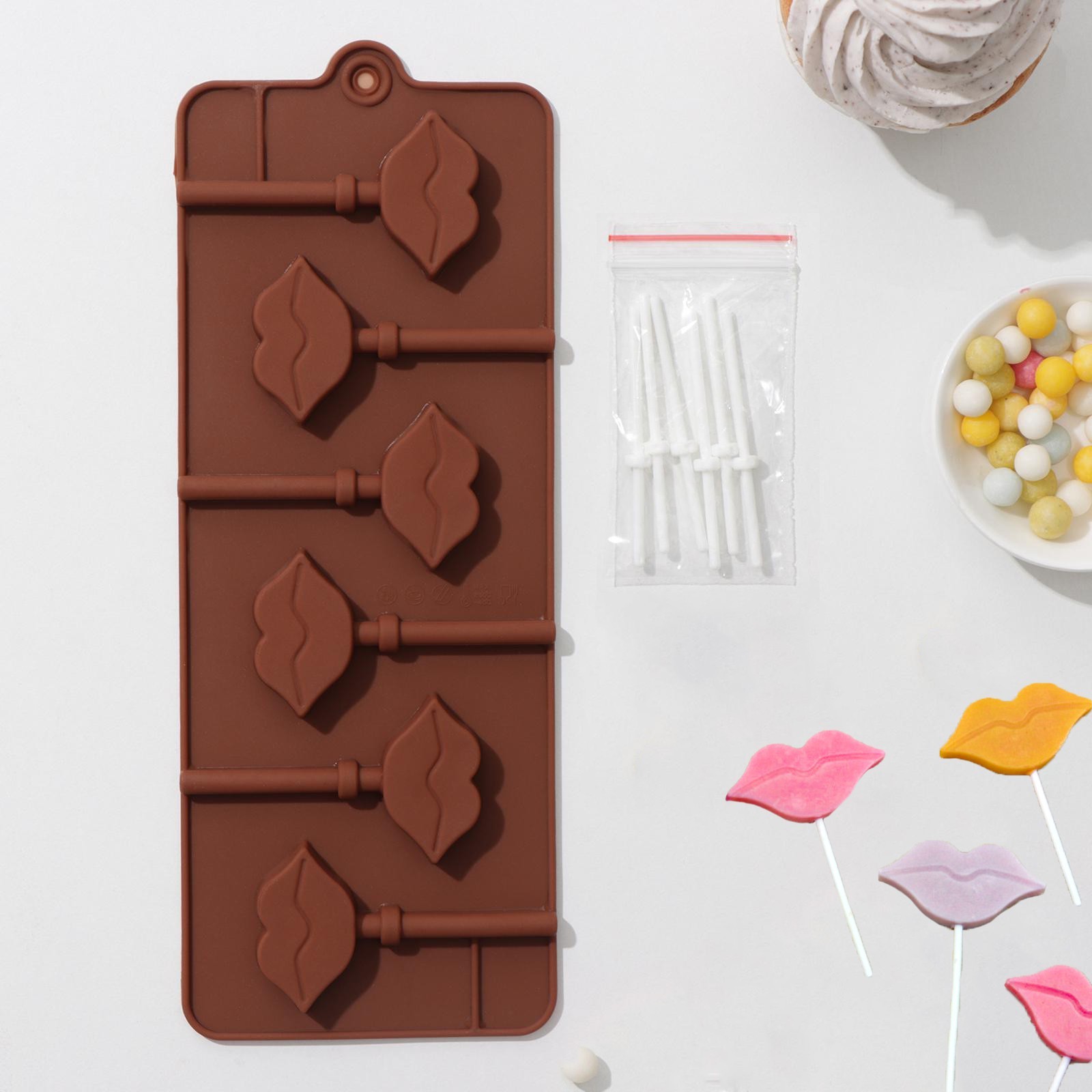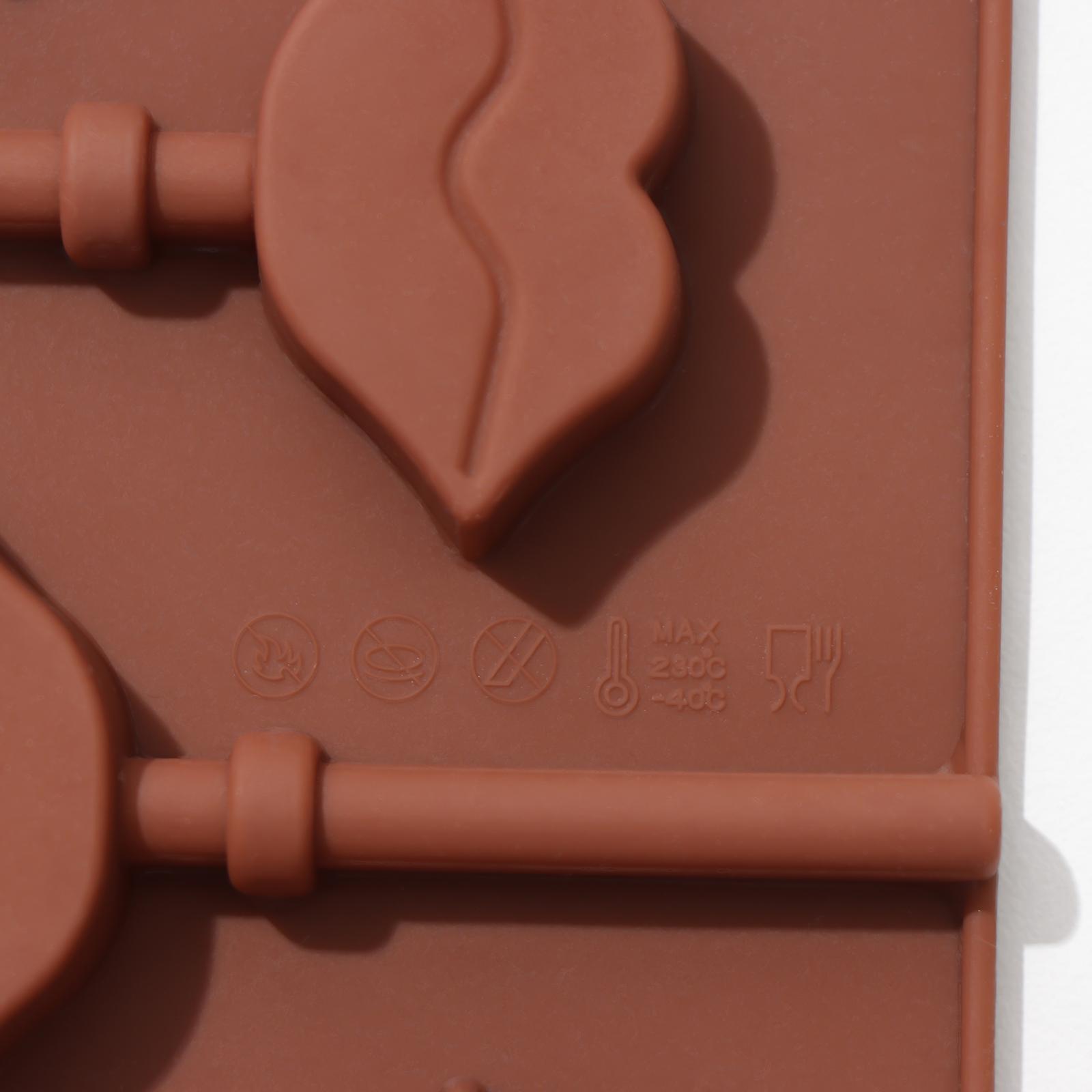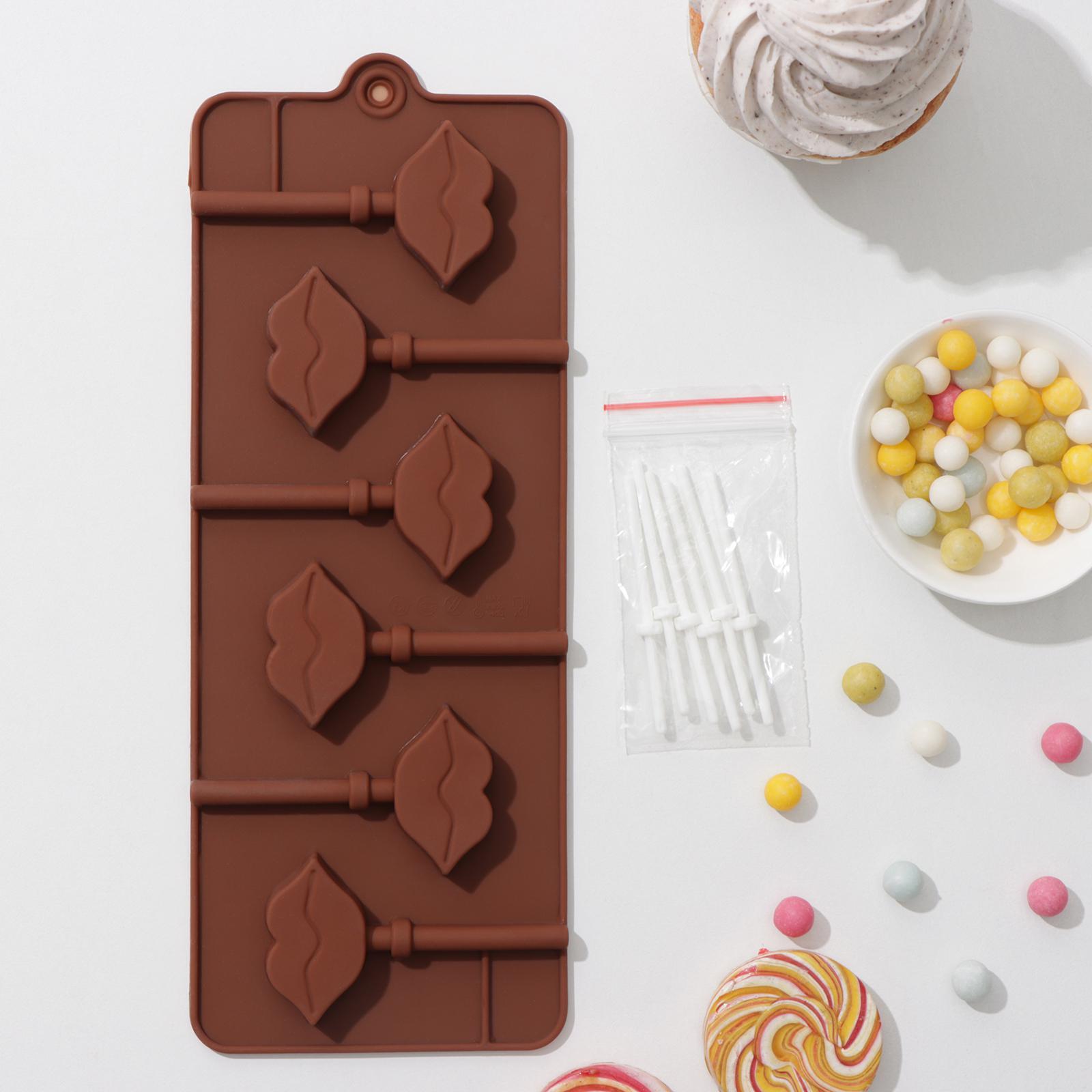 Форма силиконовая для леденцов доляна «поцелуй», 24x9,4x1,5 см, 6 ячеек (4x2,4 см), с палочками, цвет коричневый