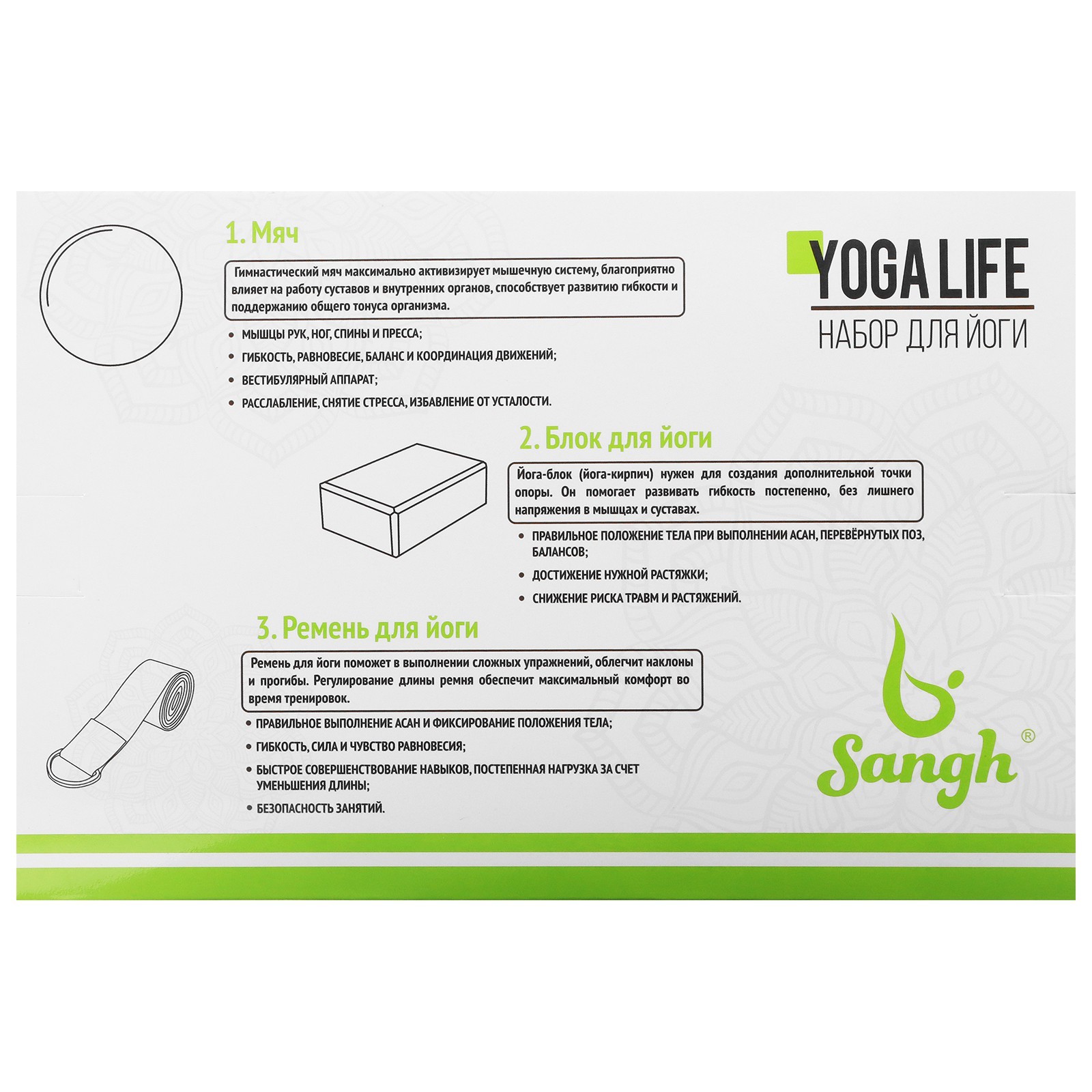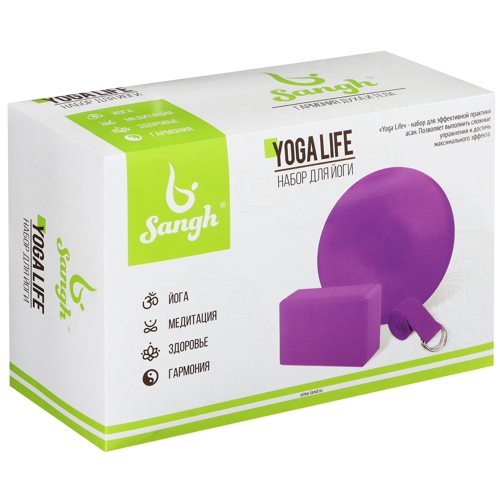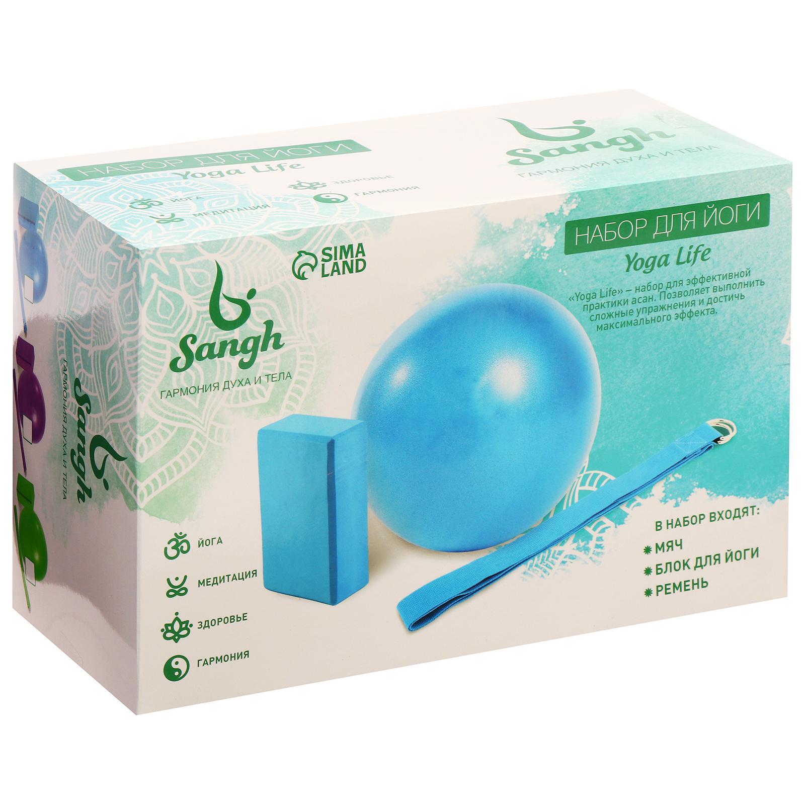 Набор для йоги sangh: блок, ремень, мяч, цвет фиолетовый. Комплект для йоги, который включает в себя блок, ремень и гимнастический мяч. Гимнастический мяч максимально активизирует мышечную систему, благоприятно влияет на работу суставов и внутренних органов, способствует развитию гибкости и поддержанию общего тонуса организма. Йога-блок нужен для создания дополнительной точки опоры. Постепенно он помогает развивать гибкость, без лишнего напряжения в мышцах и суставах. Ремень для йоги поможет в выполнении сложных упражнений, облегчит наклоны и прогибы. Регулирование длины ремня обеспечит максимальный комфорт во время тренировок. Размеры: мяч: 30 см;ремень: 180 х 4 см;блок для йоги: 23 х 15 х 8 см. Цвет: Фиолетовый parts count: 0 Возраст: Взрослый Состав набора: Блок Состав набора: Ремень Состав набора: Мяч  развернуть описание ▼