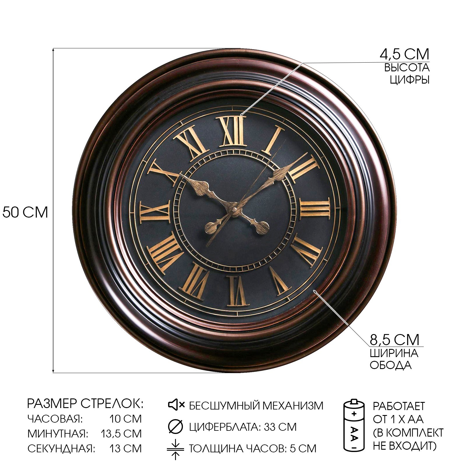 Часы настенные сандал, d-50 см, циферблат 33.5 см. Часы настенные Сандал станут настоящим украшением и дополнением вашего интерьера. Модель можно разместить дома в гостиной, спальне, кухне или в офисе. Интересный дизайн и использованная цветовая гамма изделия придадут любому помещению нотки уюта и гармонии. Стильные необычные часы удачно оформят любой интерьер от современного до детского. Наши часы идеально подойдут в качестве подарка детям и друзьям. Не рекомендуем использовать часы при минусовой температуреЦвет:Коричневый|Форма:Круглая|Размер, см:50 х 50|Ширина, см:50|Высота, см:50|Тематика:Интерьер|Тип индикации:Римские цифры|Тип механизма:Кварцевый|Цвет циферблата:Чёрный|Материал:Стекло|Материал:Пластик|Цвет корпуса:Коричневый|Страна:Китай  развернуть описание ▼
