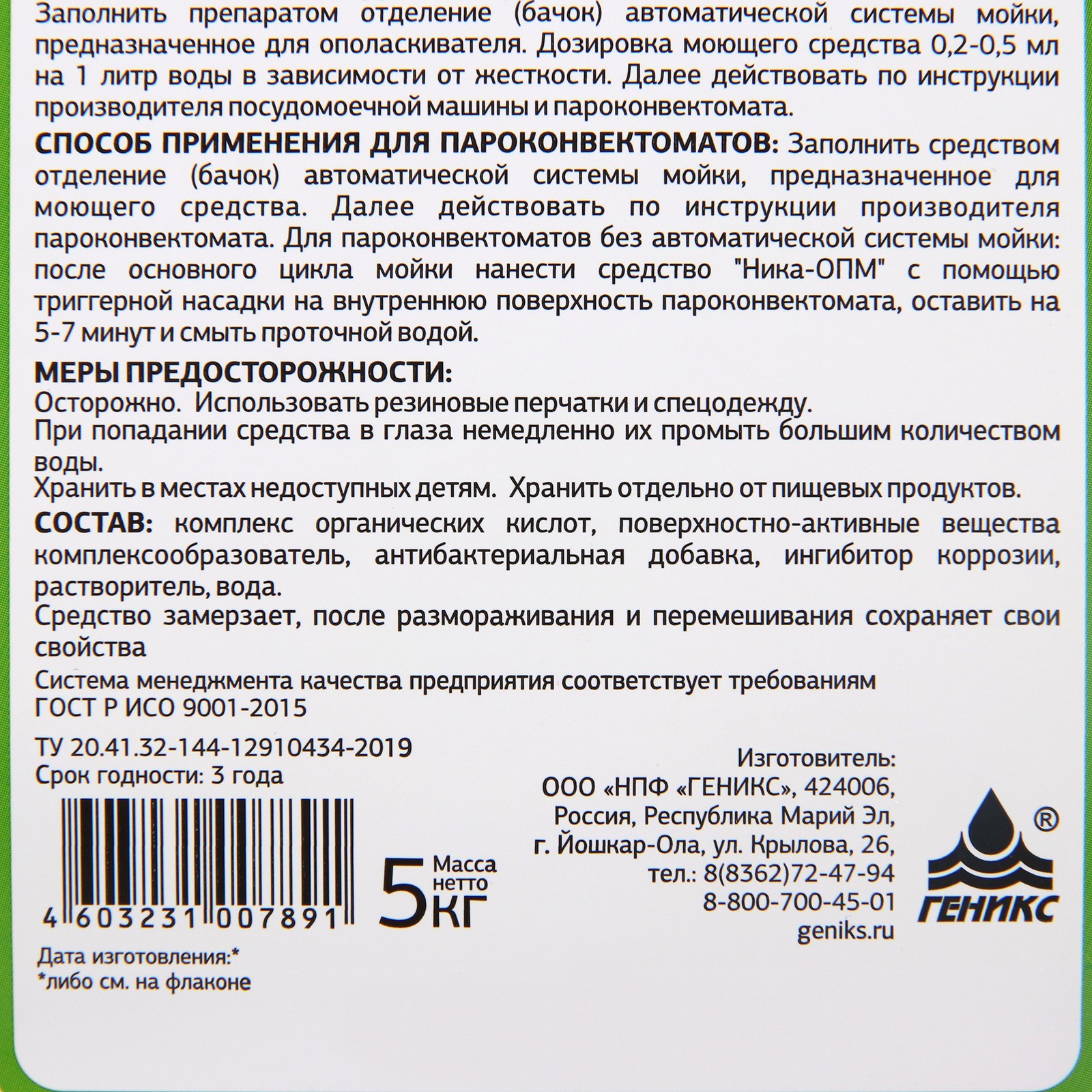 Ополаскиватель для посудомоечных машин и пароконвектоматов "ника-опм", 5 л. Средство предназначено для мойки в профессиональных машинах всех типов посуды, а также для очищения внутренних поверхностей пароконвектоматов в воде любой жёсткости. Области применения: предприятия общественного питания; пищеблоки, включая ЛПУ; санаторно-курортные учреждения; детские, дошкольные, школьные учреждения. Особенности средства: экономичен в применении; эффективно устраняет различные загрязнения; удаляет жир; содержит антикоррозийные добавки; эффективен даже в жёсткой воде; не содержит активный хлор, фосфаты. Способ применения Для посудомоечных машин: залейте средство в специальный резервуар из расчета 0, 8–1, 8 мл на 1 литр воды в зависимости от её жёсткости. Посуду с пригоревшим жиром рекомендуется предварительно замочить в ванне в растворе средства объёмом 1–3 мл/л при температуре воды 50–70 °C. parts count: 0 Объём, л: 5  развернуть описание ▼