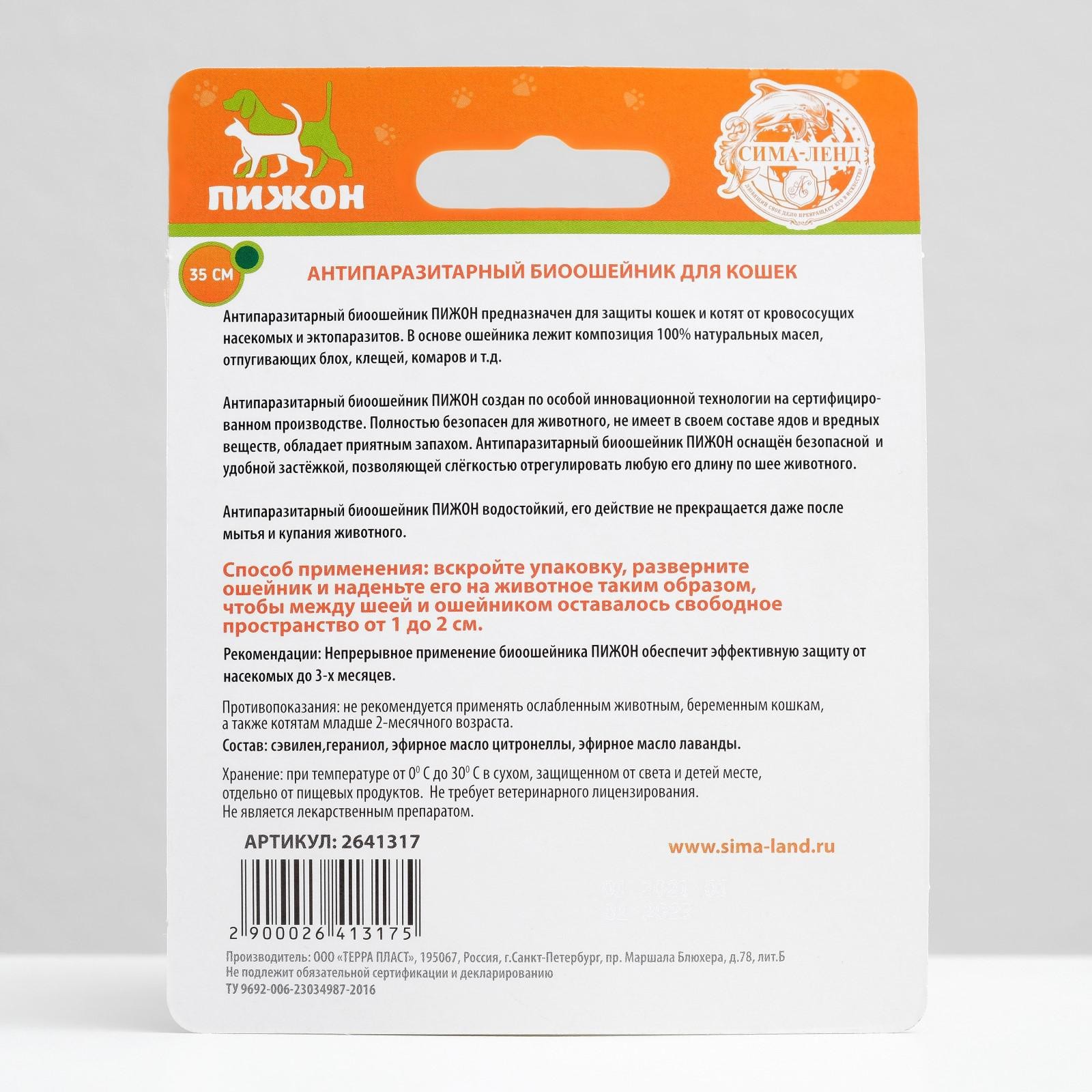 Биоошейник от паразитов «пижон» для кошек от блох и клещей, зеленый, 35 см