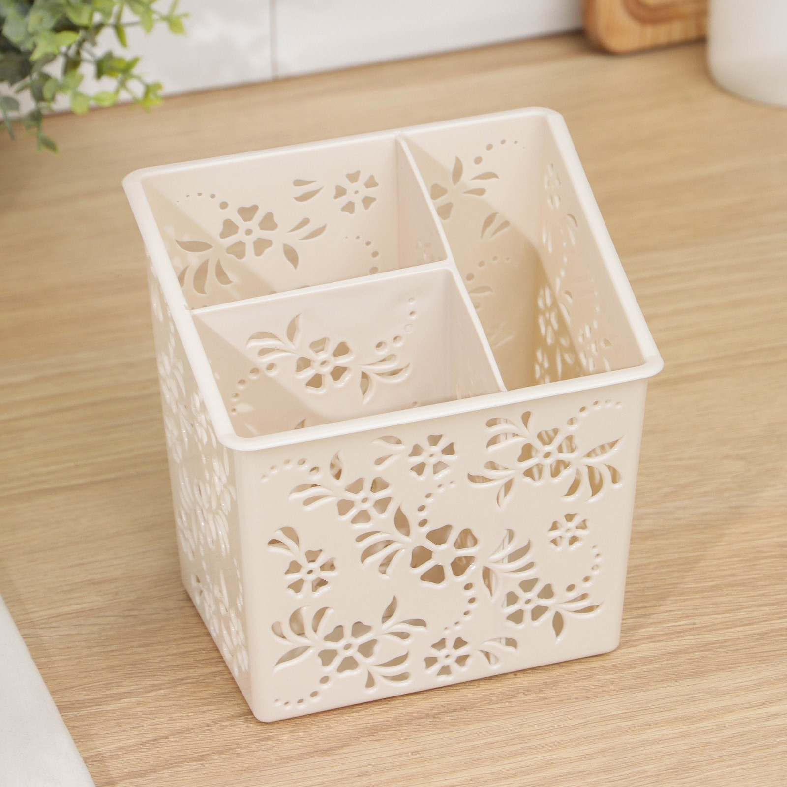 Подставка универсальная, цвет бежевый. Всё, что может понадобиться хозяйке во время приготовления еды: от лопатки до половника, от венчика до кисти, эстетично разместится в кухонной подставке. Компактный размер позволяет подставке не занимать много пространства на рабочей поверхности или в кухонном шкафу. Преимущества:Подставка устойчива к воздействию влаги;Не впитывает запахи;Удобная и функциональная подставка поможет Вам аккуратно и красиво хранить столовые принадлежности прямо на рабочей поверхности. Цвет: Бежевый parts count: 0 tnved: 3924900009 Материал: Пластик С поддоном: Нет  развернуть описание ▼