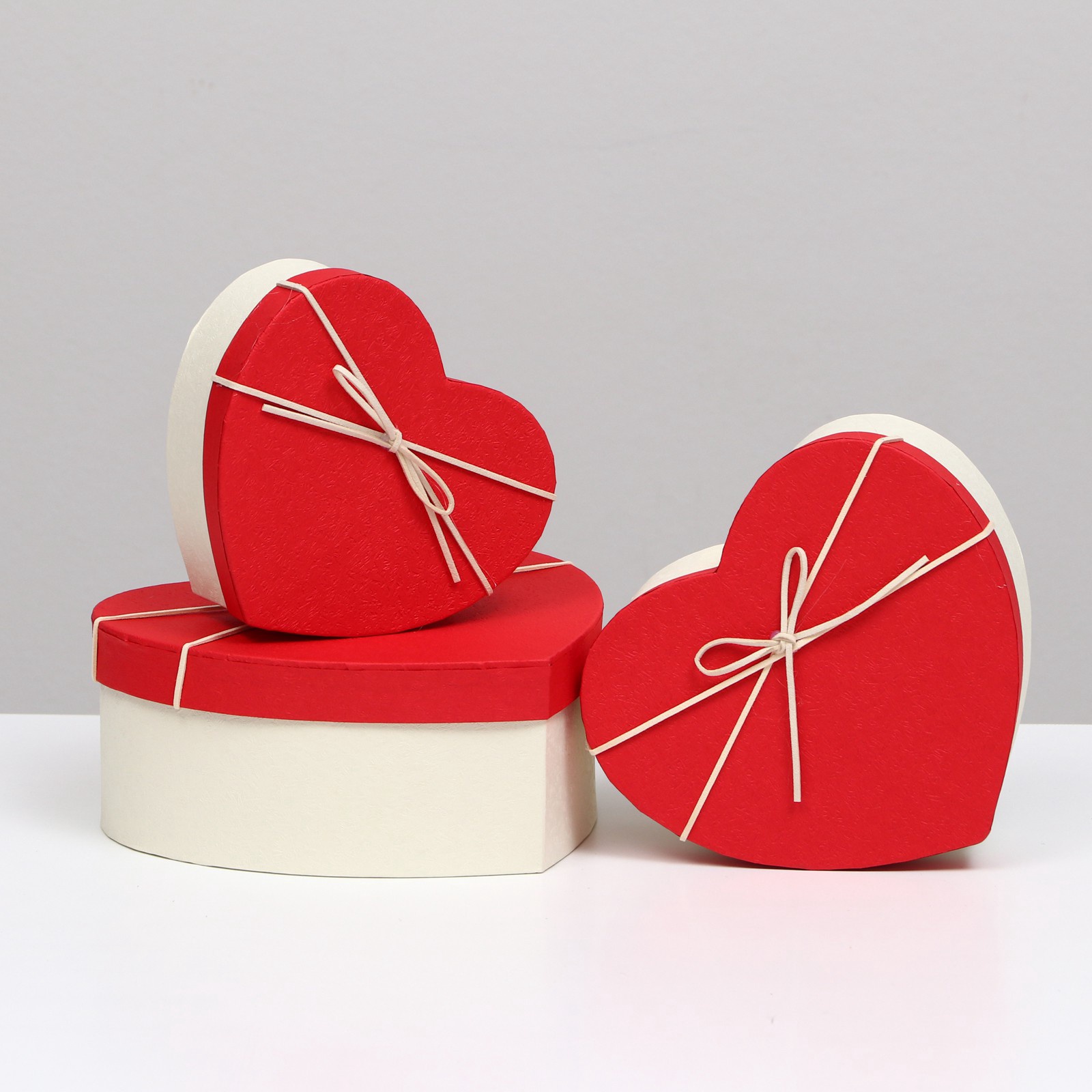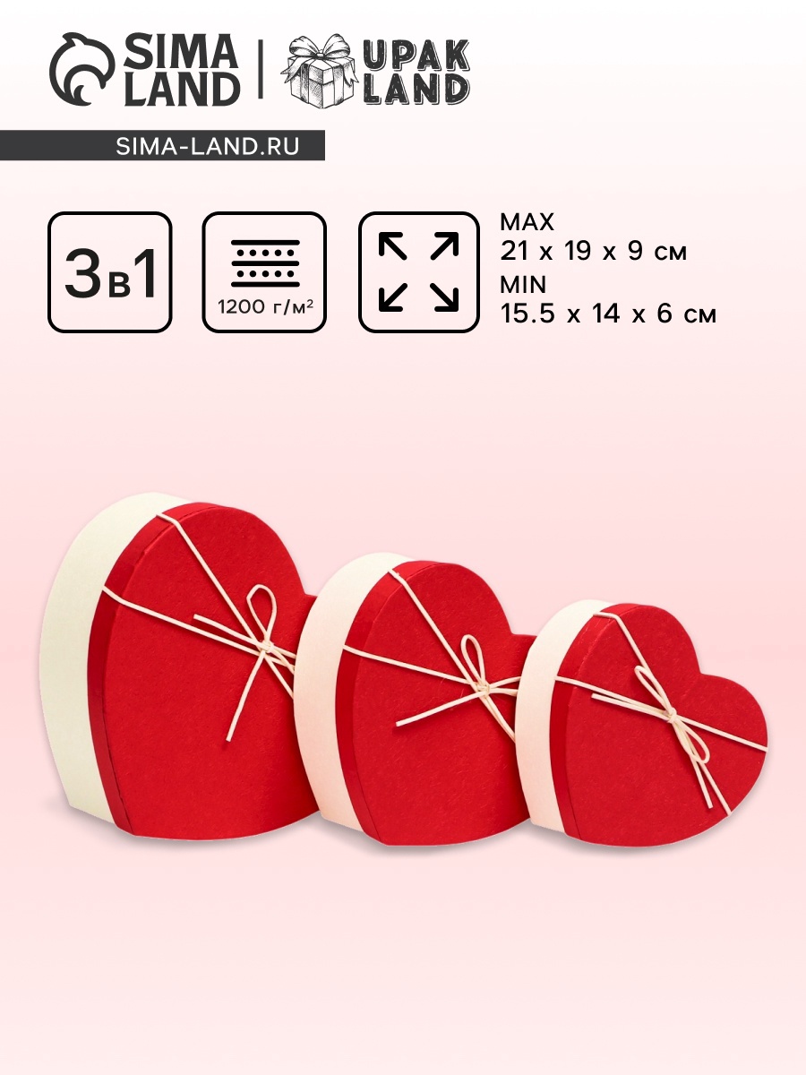 Набор подарочных коробок сердце 3 в 1,, белый - красный, 21 19 9 - 15.5 14 6 см. Подарочные коробки - идеальное решение для упаковки вашего подарка на 8 марта, 23 февраля, 14 февраля, Новый год, Рождество, день рождения и другие праздники. Во-первых, подарочная упаковка смотрится стильно благодаря красивому дизайну. Во-вторых, очень практично и можно поместить сразу несколько презентов. В-третьих, создаёт интригу для человека, которому приготовили подарок. Так же коробки можно использовать для хранения аксессуаров дома. Набор:Да|Цвет:Бежевый|Цвет:Красный|Форма:Сердце|Плотность, г/м :1200|Количество вложений в наборе :3 в 1|Высота большей коробки, см:9|Ширина большей коробки, см:21|Длина большей коробки, см:22|Тематика:Однотонная|Тематика:Банты|Рисунок:Нет|Тематика праздника:Свадьба|Тематика праздника:8 Марта|Тематика праздника:14 Февраля|Материал:Картон|Декоративные элементы:Бантик|Вид:Наборы коробок|Вид:Фигурные|Вид:Жёсткие (крышка+дно)|Размер:Средний (18-24 см)|Страна:Китай  развернуть описание ▼
