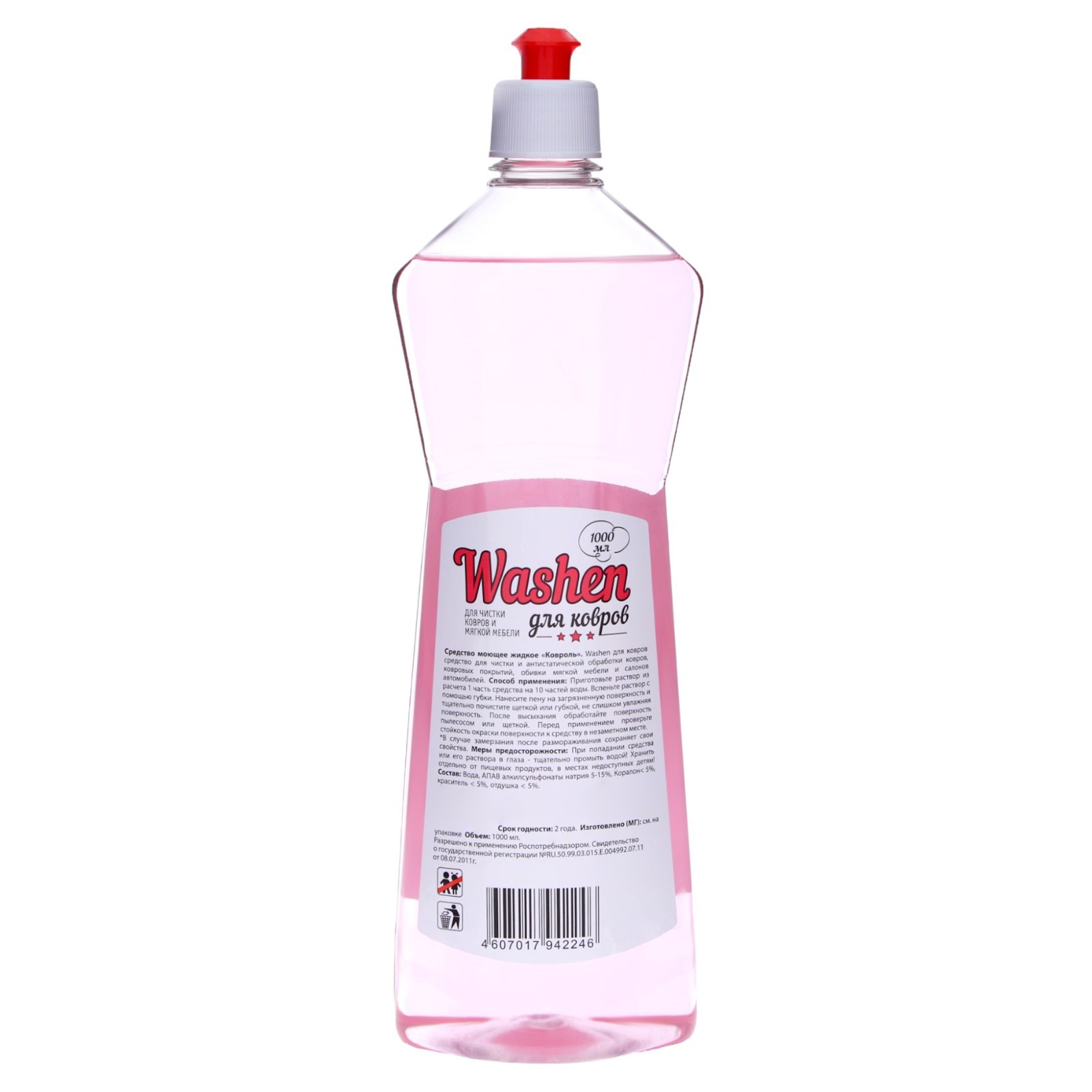 Средство для чистки ковров и мягкой мебели washen, 1 л.   Средство моющее жидкое «Ковроль». Washen для ковров средство для чистки и антистатической обработки ковров, ковровых покрытий, обивки мягкой мебели и салонов автомобилей.  Способ применения: Приготовьте раствор из расчета 1 часть средства на 10 частей воды. Вспеньте раствор с помощью губки. Нанесите пену на загрязненную поверхность и тщательно почистите щеткой или губкой, не слишком увлажняя поверхность. После высыхания обработайте поверхность пылесосом или щеткой. Перед применением проверьте стойкость окраски поверхности к средству в незаметном месте.  Меры предосторожности: При попадании средства или его раствора в глаза - тщательно промыть водой! Хранить отдельно от пищевых продуктов, в местах недоступных детям! Состав: вода, АПАВ алкилсульфонаты натрия 5-15%, Коралон< 5%, краситель < 5%, отдушка < 5%.  Вес, г/Объём, мл: 1000 Форма выпуска: Жидкость Вид: Моющее средство  развернуть описание ▼