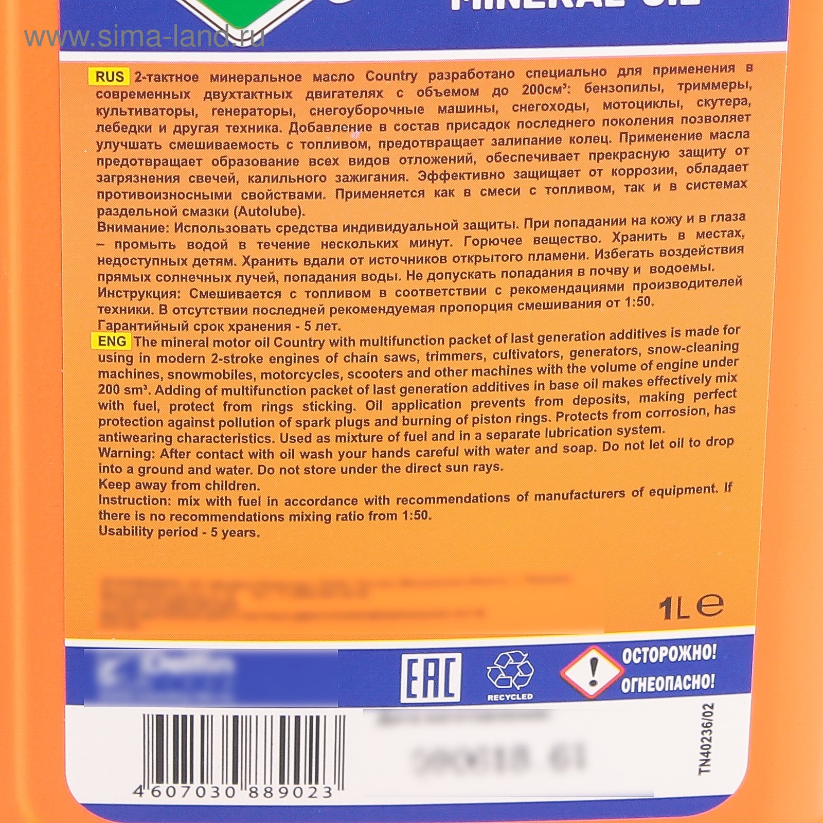 Масло двухтактное country минеральное тв st-501, 1 л. Объём, л: 1 Вес, г/Объём, мл: 1000 Вид масла: Моторное Тип двигателя: Бензиновый Тактность двигателя: Двухтактный Тип масла: Минеральное Назначение: Для мотоциклов Назначение: Для квадроциклов Назначение: Для скутеров Назначение: Для снегоходов Назначение: Для садовой техники и инструмента Вид: Масла  развернуть описание ▼