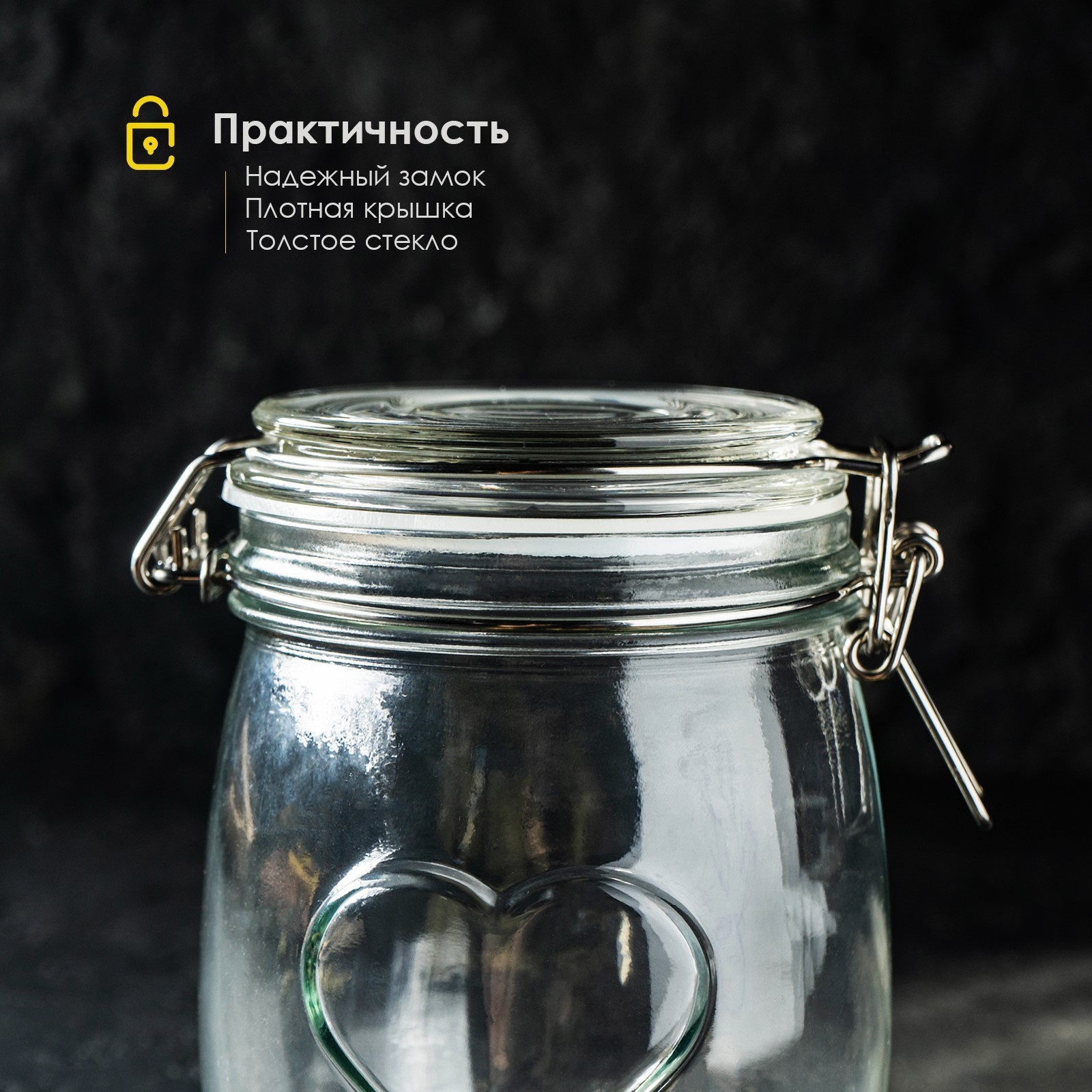 Банка стеклянная для сыпучих продуктов с бугельным замком доляна «сердце», 850 мл, 11x14 см.