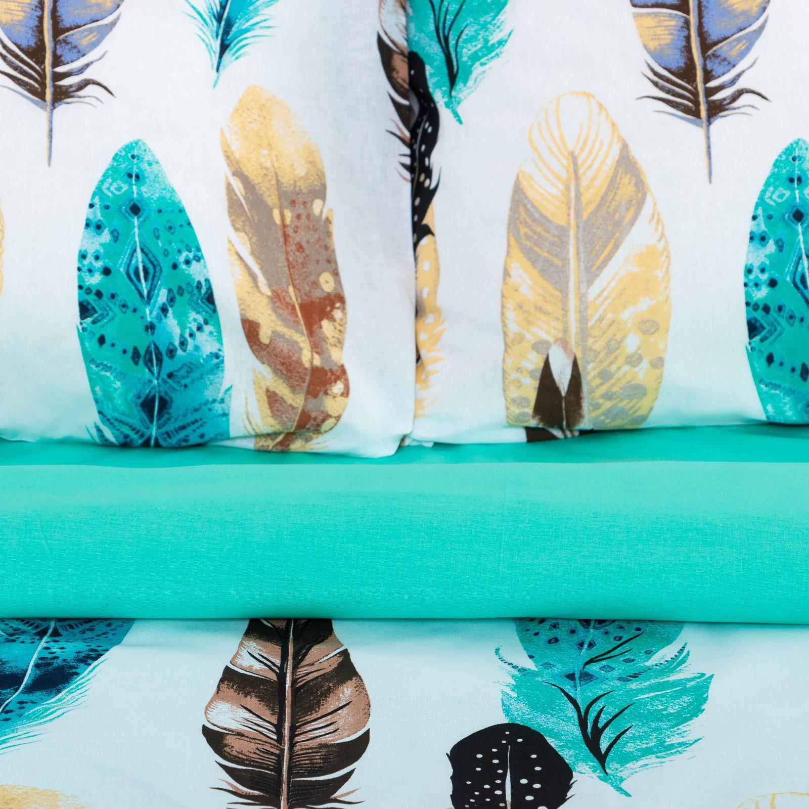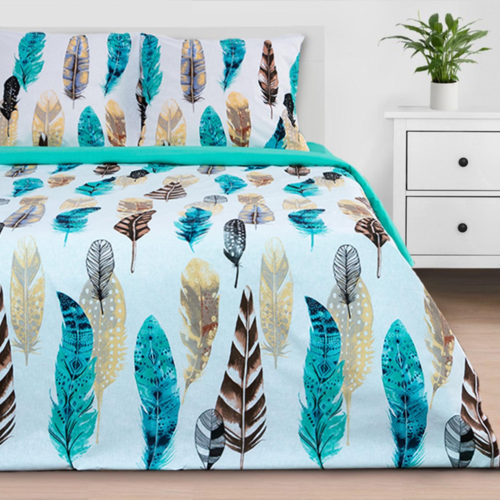Постельное бельё 2-спальное «этель. перья», поплин. Постельное бельё «Этель: поплин» создано специально для тех, кто привык окружать себя комфортом и стремится внести в свою жизнь как можно больше ярких красок. Чем хорош поплинx Данный материал — удивительно мягкая, тонкая и одновременно очень прочная ткань. Он отличается благородным матовым блеском, который достигается за счёт особой технологии производства: в качестве основы выступают тончайшие хлопковые нити, а горизонтальные берутся в два раза толще. Постельное бельё из поплина отлично поддаётся окрашиванию, а потому сохраняет насыщенность цвета долгое время. Кроме того, оно хорошо пропускает воздух, легко стирается и разглаживается. Особенности постельного белья Изделия изготовлены из 100 % натурального экологически чистого хлопка. Плотность ткани составляет 125 г/м .Для нанесения рисунков использовались качественные европейские красители, а потому аллергия и раздражения пройдут мимо. Простыня без поперечного шва! Все внутренние швы дополнительно обработаны оверлоком, чтобы избежать естественного осыпания края. В комплекте: Наволочки с клапанами — 2 шт. Пододеяльник — 1 шт. Простыня — 1 шт. Рекомендации по уходу за изделиями: стирка при температуре не выше 40 °C без использования отбеливающих средств. Цвет:Белый|Цвет:Бирюзовый|Размер наволочки, см:70 х 70|Ткань:Поплин|Плотность, г/м :125|Размер:2-спальное|На молнии:Нет|На резинке:Нет|Тематика:Перья|Вид упаковки:PVC-пакет|Тематика праздника:8 Марта|Декоративные элементы:Без элементов|Рекомендации по уходу:Не отбеливать|Рекомендации по уходу:Стирка при 40 °С|Рекомендации по уходу:Бережный режим глажки|Состав ткани:Хлопок|Количество наволочек:2|Режим стирки:При 40 градусах|Вид простыни:Стандартная|Отделка:Без отделки|Размер пододеяльника, см:175 х 215|Размер простыни, см:200 х 220|Простыня в комплекте:Да|Особенности простыни:Стандартная|Вид застёжки наволочки:Клапан|Вид застёжки пододеяльника:Клапан|Страна:Россия  развернуть описание ▼