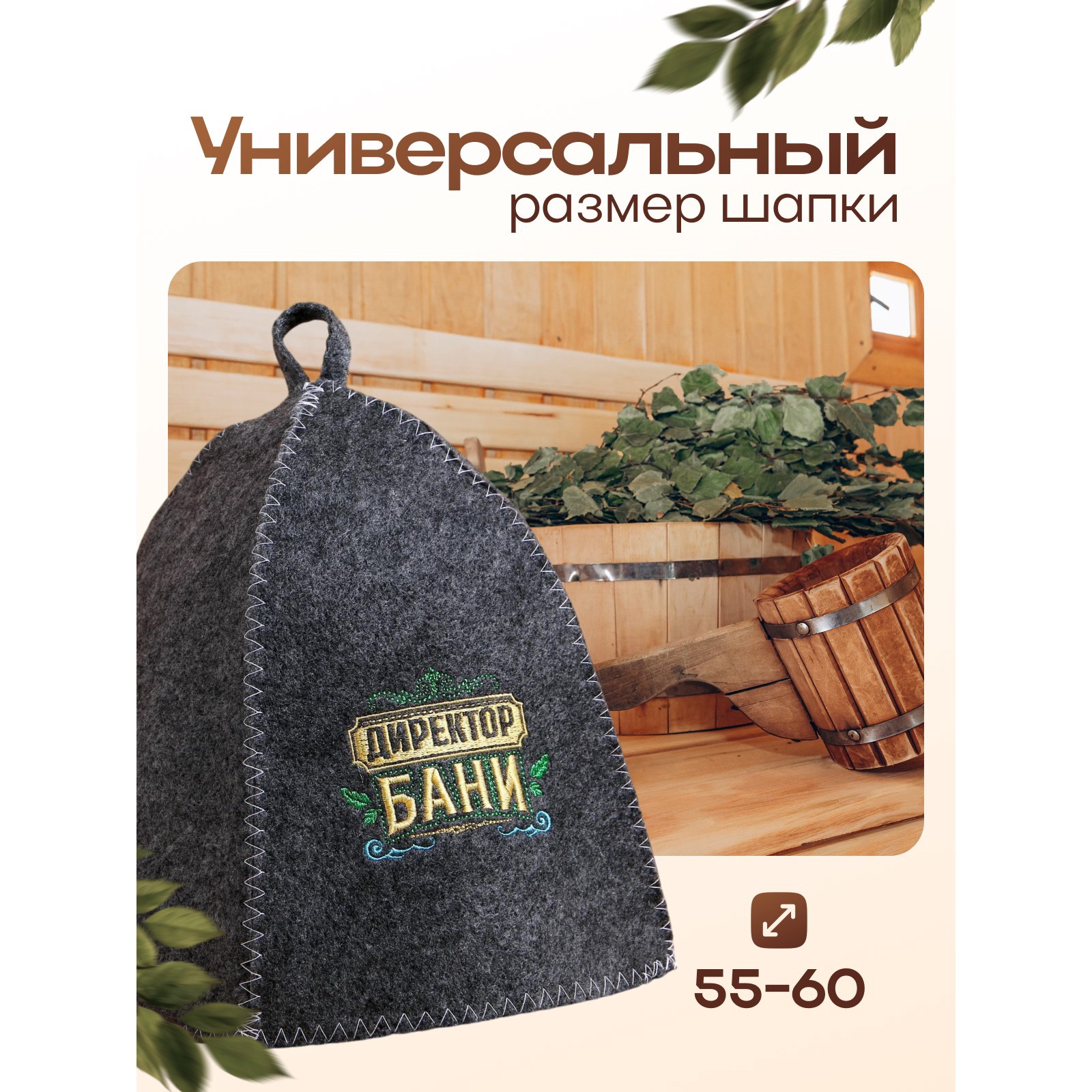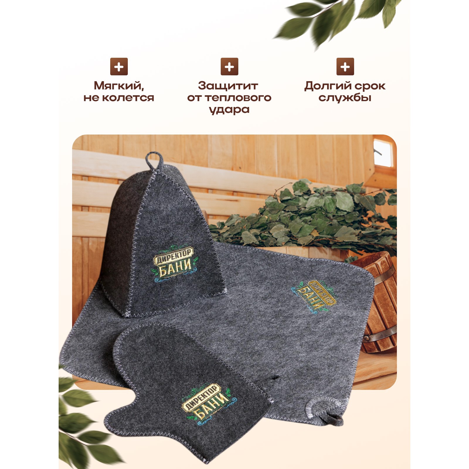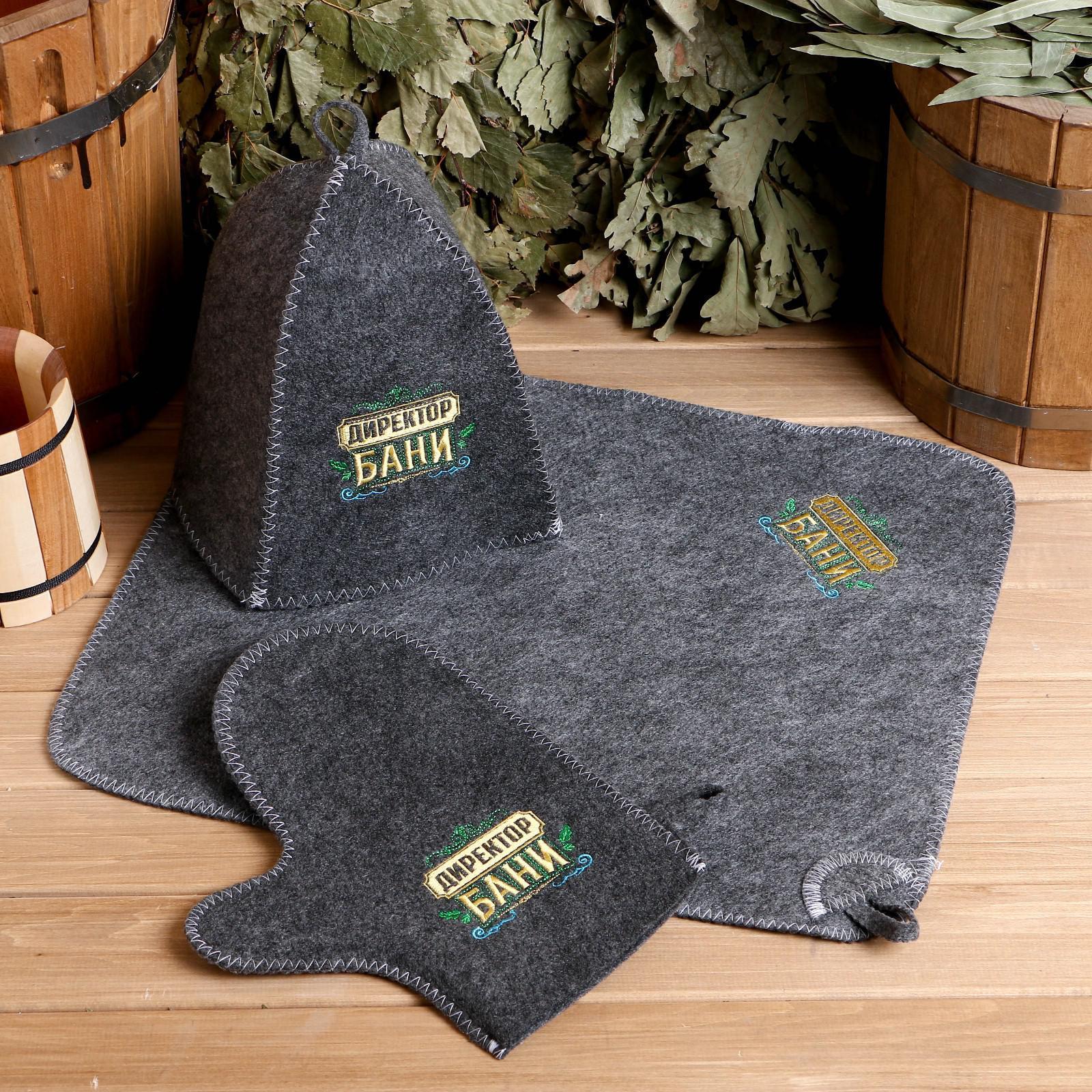 Набор для бани директору бани! горячего пара вышивка шапка, коврик и рукавица. Для комфортного отдыха в парной возьмите с собой набор банных принадлежностей. Предметы из этого комплекта предохраняют тело от перегрева и являются средствами индивидуального пользования. Влажные изделия рекомендуется сушить в расправленном виде на горизонтальной поверхности. Принадлежности из войлока и фетра стирайте вручную при температуре воды 30 °C. Набор:Да|Цвет:Коричневый|Для кого:Для мужчины|В наборе, шт.:3|Вид упаковки:Пакет с клапаном|Тематика праздника:23 Февраля|Адресат:Мужчине|Возраст:Взрослый|Материал:Войлок|Тип рисунка:Вышивка|Содержание шерсти:30%|Вид шапки:С рисунком|Составляющие набора:Шапка|Составляющие набора:Рукавица|Составляющие набора:Коврик|Возраст:Для взрослых|Страна:Россия  развернуть описание ▼