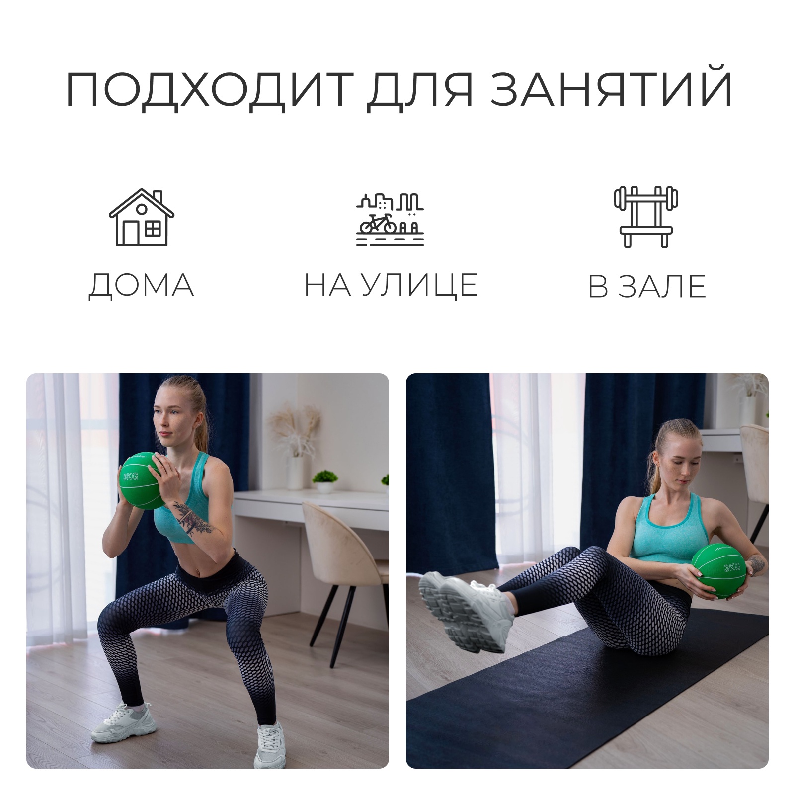 Медицинбол onlytop, 3 кг, цвет зелёный. Медбол подходит для занятий дома, в зале и на улице. Применяется в тренировках на развитие силы для улучшения работы мышц рук, груди, плеч и пресса, а также для реабилитационных занятий. Благодаря резиновому покрытию мячу не страшна влага. Цвет: Зелёный Вес, кг: 3 Материал: Резина Наполнитель: Песок  развернуть описание ▼