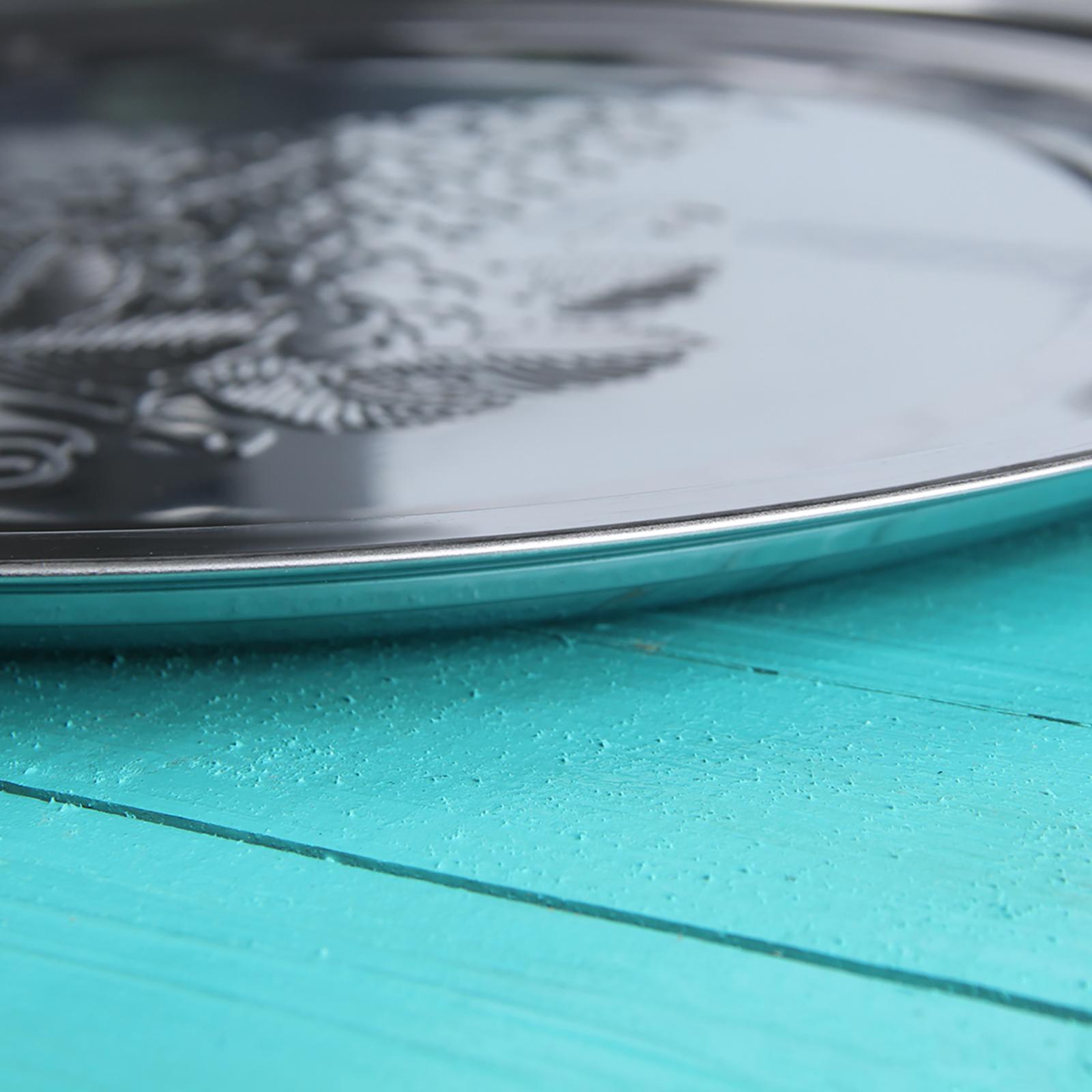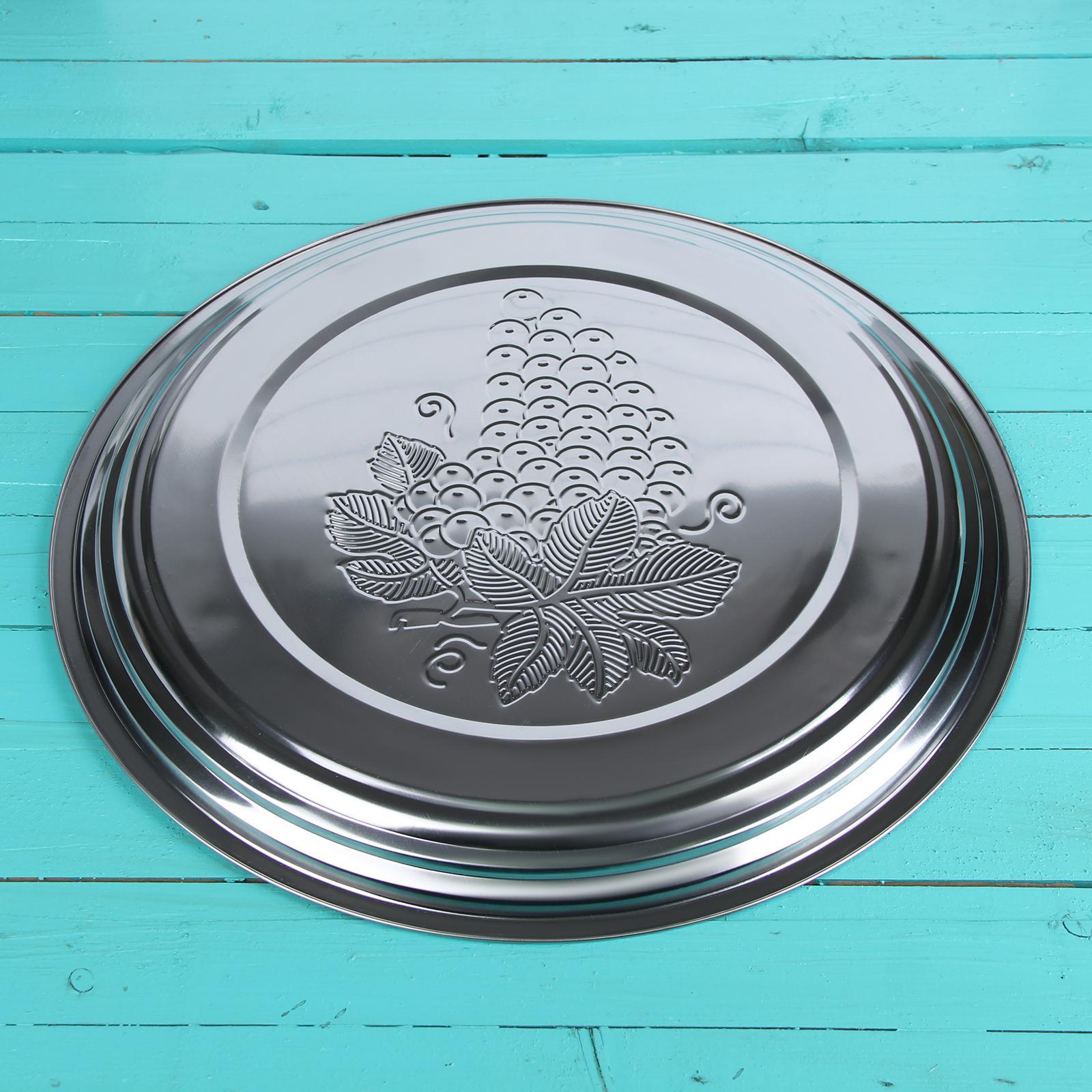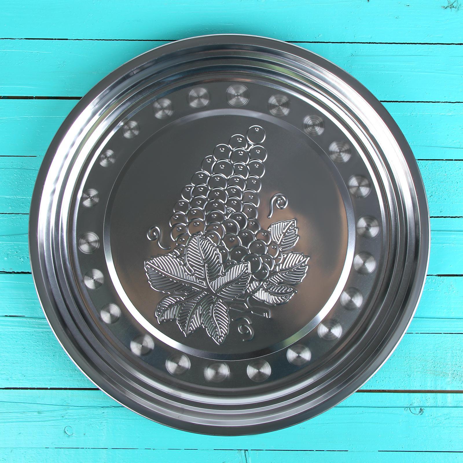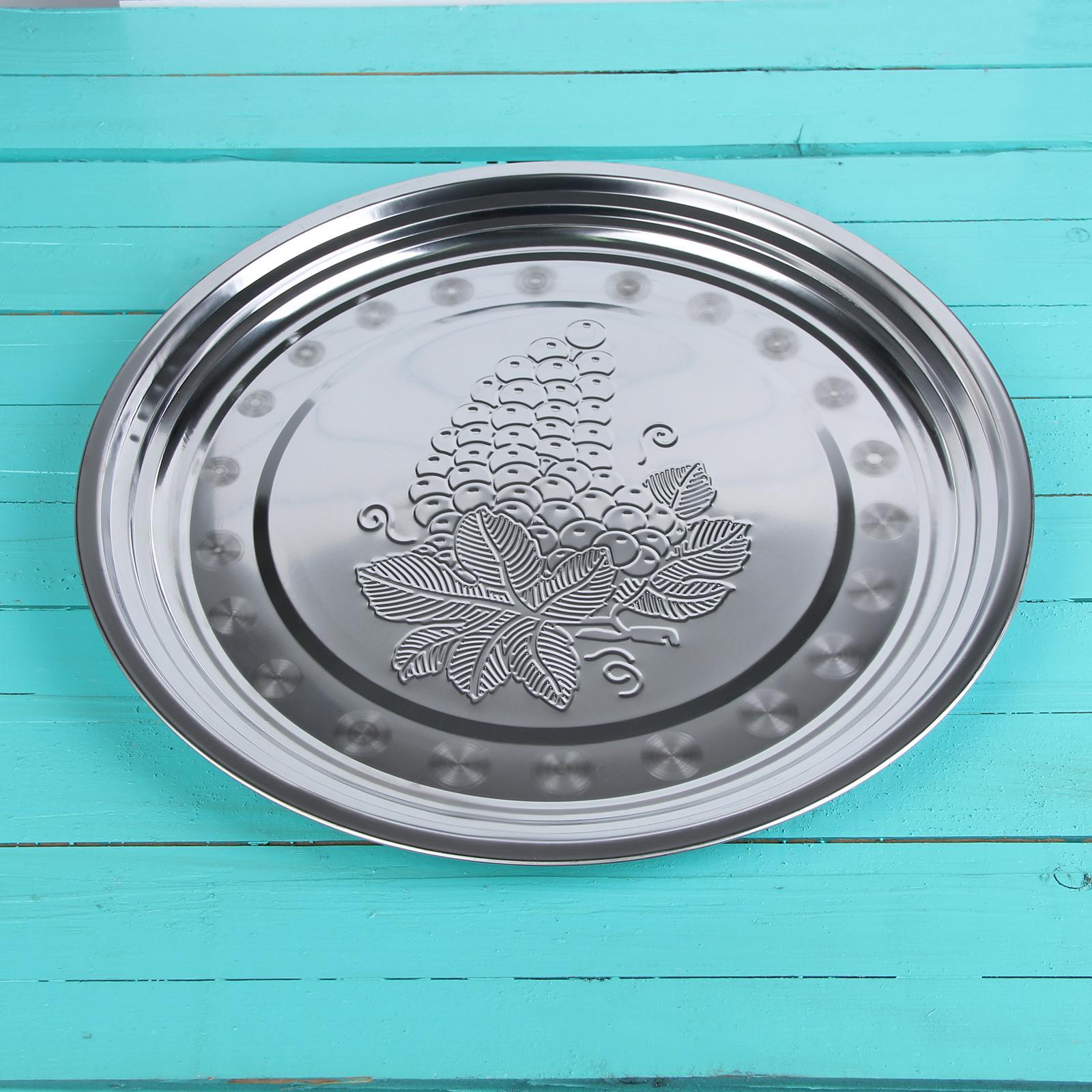 Поднос из нержавеющей стали «виноградная лоза», 36x2,5 см. Преимущества подноса из нержавеющей стали: корпус не теряет форму;эргономичные борта облегчают подачу блюд;гладкая поверхность легко отмывается;стильная полировка делает предмет украшением кухни. Мойте мягкими губками в тёплой воде. Избегайте высокоабразивных моющих средств. Цвет: Хромированный Форма: Круглая Диаметр, см: 36 Количество ячеек: 1 Материал: Нержавеющая сталь Можно мыть в посудомоечной машине: Да Текстура: С рельефом Форма: Круг, шар, цилиндр  развернуть описание ▼