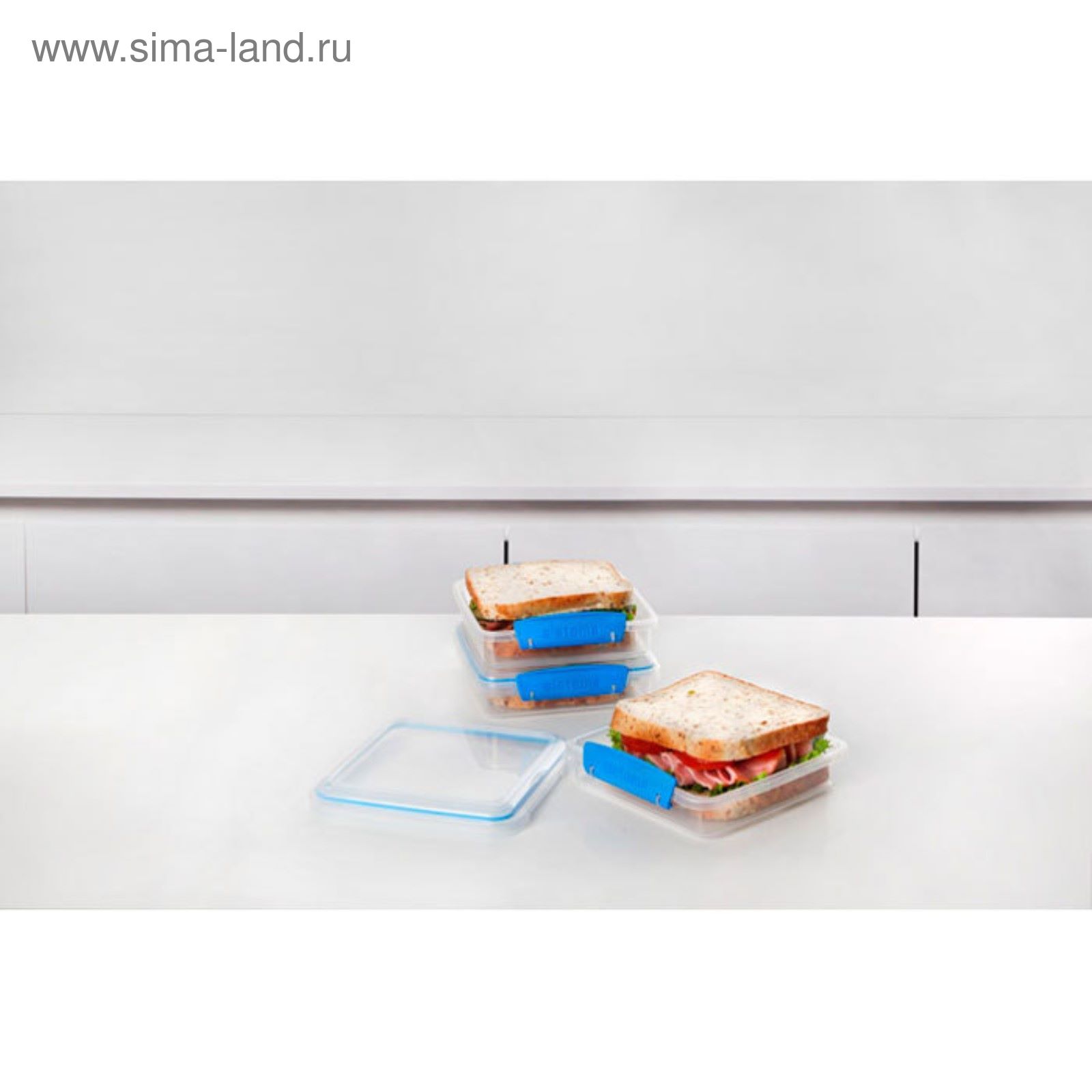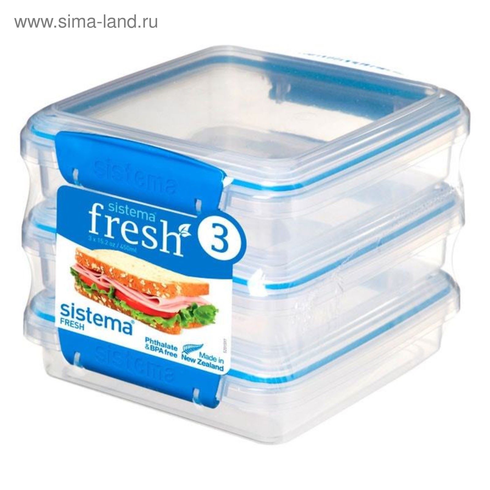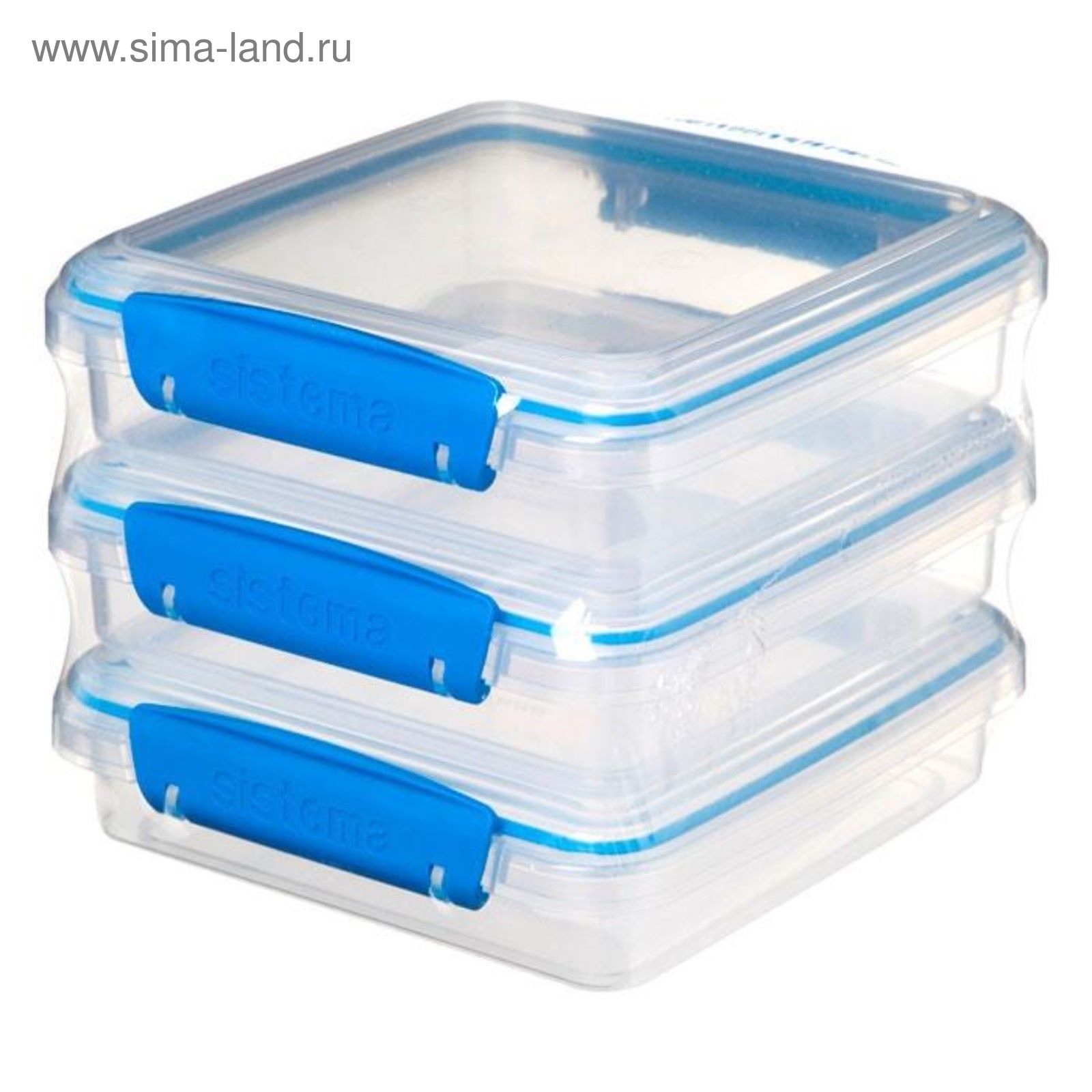 Набор контейнеров для сэндвичей sistema, 450 мл x 3 шт.. Данный набор контейнеров специально изготовлен для хранения бутербродов и сэндвичей. Продукты в них дольше остаются свежими и аппетитными благодаря пластику высокого качества. Особенности: специальная система клипс, которая обеспечит надёжное закрытие ёмкости; в комплекте 3 предмета объёмом 450 мл; материал не содержит эфиров фталевой кислоты и бисфенола А. Новозеландский бренд Sistema известен в 82 странах мира. Продукты компании позволяют организовать быт максимально удобно. Все изделия можно использовать для сервировки стола или хранения пищи, брать с собой на тренировку и в путешествия. Цвет: Прозрачный Цвет: Голубой Форма: Квадратная Объём, л: 0.45 В наборе, шт.: 3 Объём, мл: 450 Материал: Пластик Герметичная крышка: Да Можно мыть в посудомоечной машине: Да Можно использовать в СВЧ-печи: Да Форма: Квадрат, куб  развернуть описание ▼