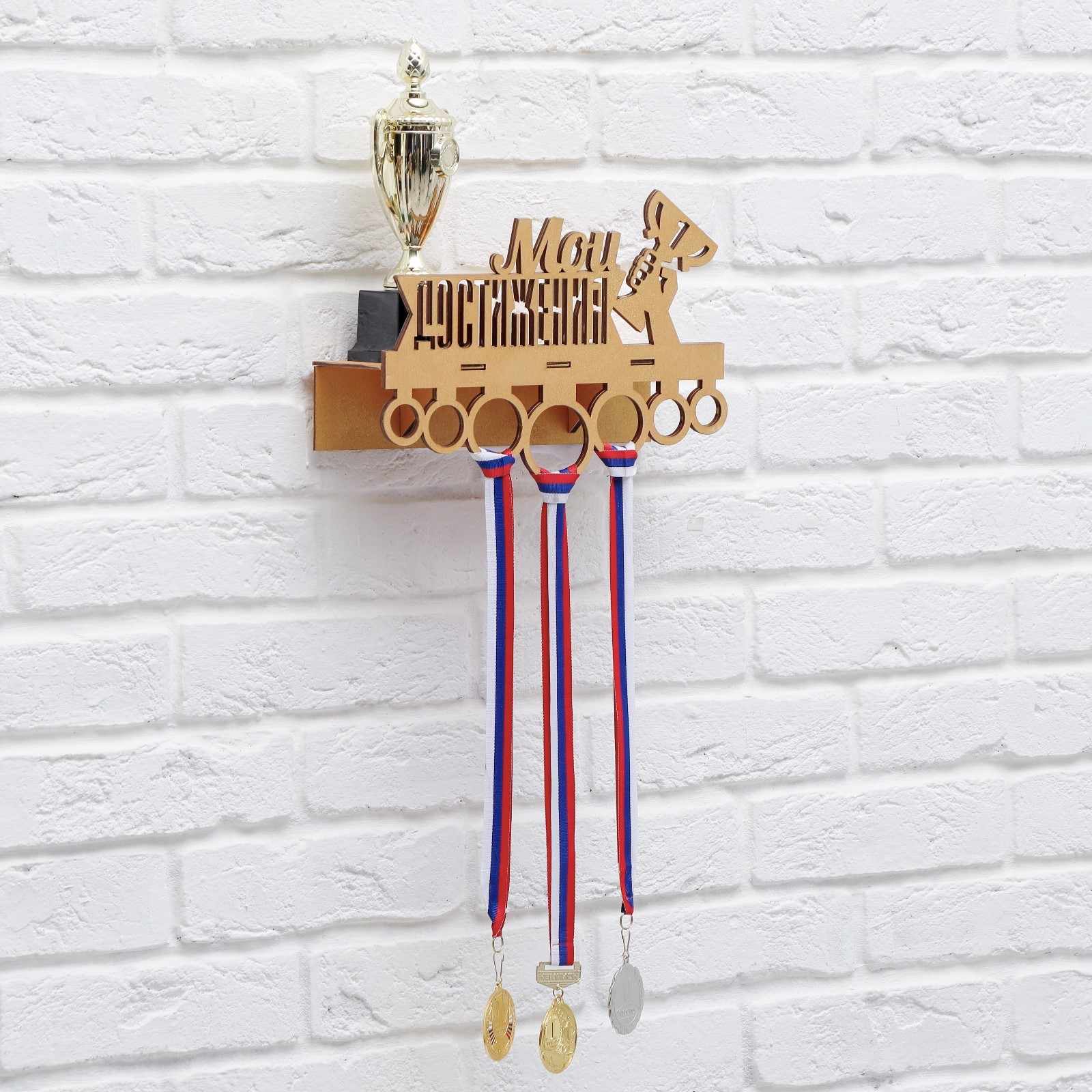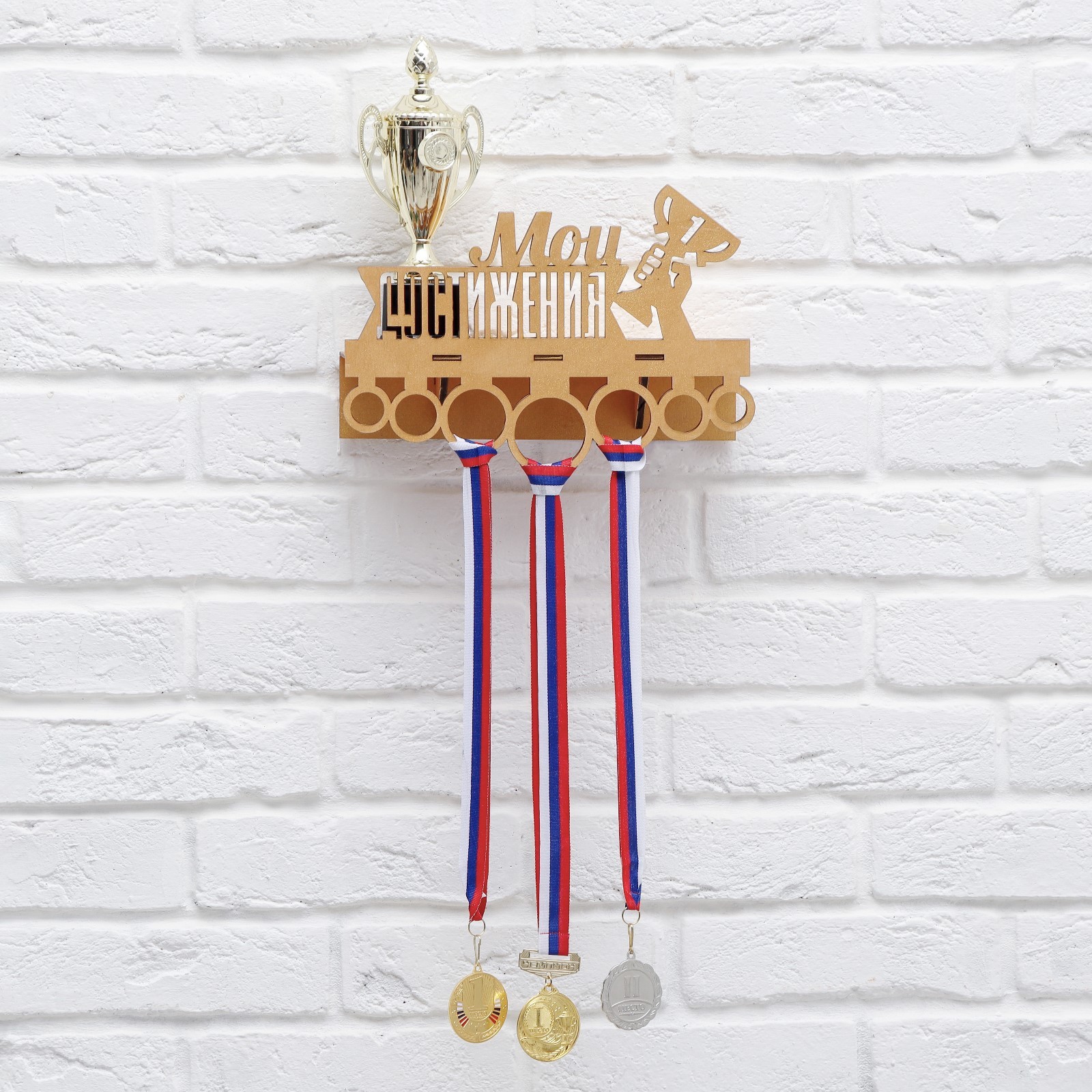 Медальница с полкой "мои достижения". Цвет: Золотистый Длина, см: 30 Вид дерева: Фанера Материал: Дерево Вид спорта: Универсальный Особенность медальницы: Одноцветные Особенность медальницы: С полкой Особенность медальницы: Большие  развернуть описание ▼