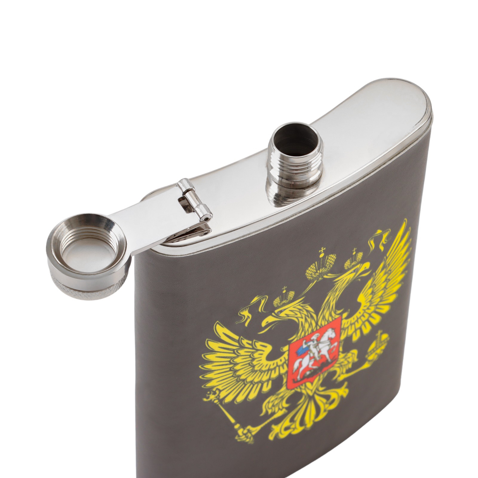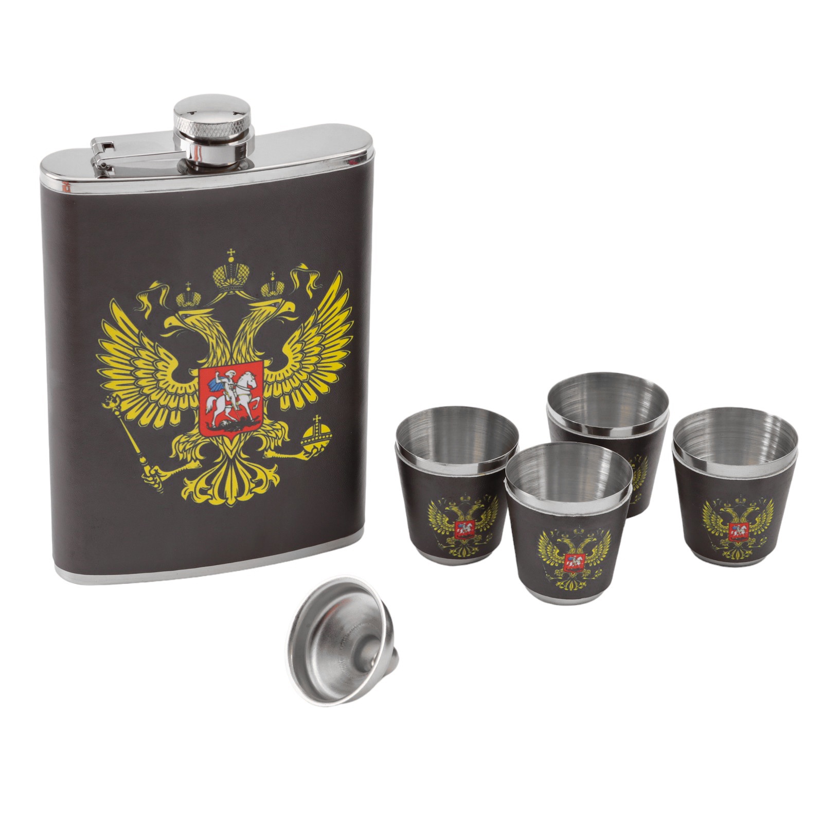 Подарочный набор «россия»: фляжка 270 мл, 4 стопки, воронка. Фляжка — это небольшой сосуд, который используется для хранения и переноса жидкостей. Они популярны среди путешественников, спортсменов и любителей активного отдыха. Легкий и функциональный аксессуар - станет незаменимым спутником любых приключений. Фляжка - это оригинальный способ хранить и переносить жидкость в стильном форм-факторе, модный аксессуар, который привлекает внимание и поднимает настроение. Фляжка будет вашим верным спутником, готовым утолить вашу жажду в любых ситуациях. Компактный размер фляжки делает ее идеальным выбором для путешествий и прогулок. Фляга предназначена для хранения и транспортировки питьевой воды. В нее также можно наливать любые согревающие напитки, в том числе алкогольные. Отличным дополнением в наборе с фляжкой являются 4 рюмки и воронка для удобного переливания жидкостей, упакованы в подарочную коробку. Подарочный набор подойдёт в качестве подарка папе, брату, другу, брату, дедушке на 23 февраля, день рождения или любой другой праздник. Цвет:Хромированный|Цвет:Чёрный|Для кого:Для мужчины|В наборе, шт.:6|Объём, мл:30|Объём, мл:270|Вид упаковки:Коробка картонная|Рисунок:Да|Тематика праздника:23 Февраля|Адресат:Без адресата|Материал:Металл|Материал:Искусственная кожа|Составляющие набора:Воронка|Составляющие набора:Фляга|Составляющие набора:Рюмки (стопки)|Возраст:Для взрослых|Страна:Китай  развернуть описание ▼