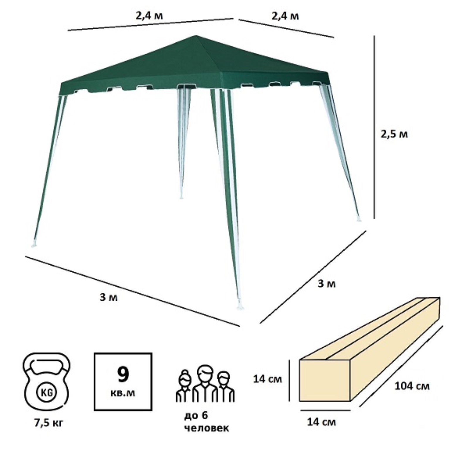 Тент-шатер садовый из полиэстера №18, 250х300х300 см,. Тент садовый из полиэстера – практичное и популярное решение для использования на даче, пикниках, шашлыках и кемпинге. Крыша тента защитит от солнца. Тент садовый из полиэстера быстро и несложно монтируется и закрепляется с помощью растяжек. Размер: 3х3х2. 5 м Материал: полиэстер 140 г Каркас: металлическая трубка (19/19/25 мм) Цвет: зеленый Размер упаковки: 104х14х14 см Вес брутто: 7. 5 кг Производитель: Green Glade Цвет: Зелёный Ширина, см: 300 Высота, см: 250 Глубина, см: 300 : 140 Материал каркаса: Металл Материал тента: Полиэстер Особенности: Без особенностей С москитной сеткой: Нет Вид: Шатры  развернуть описание ▼