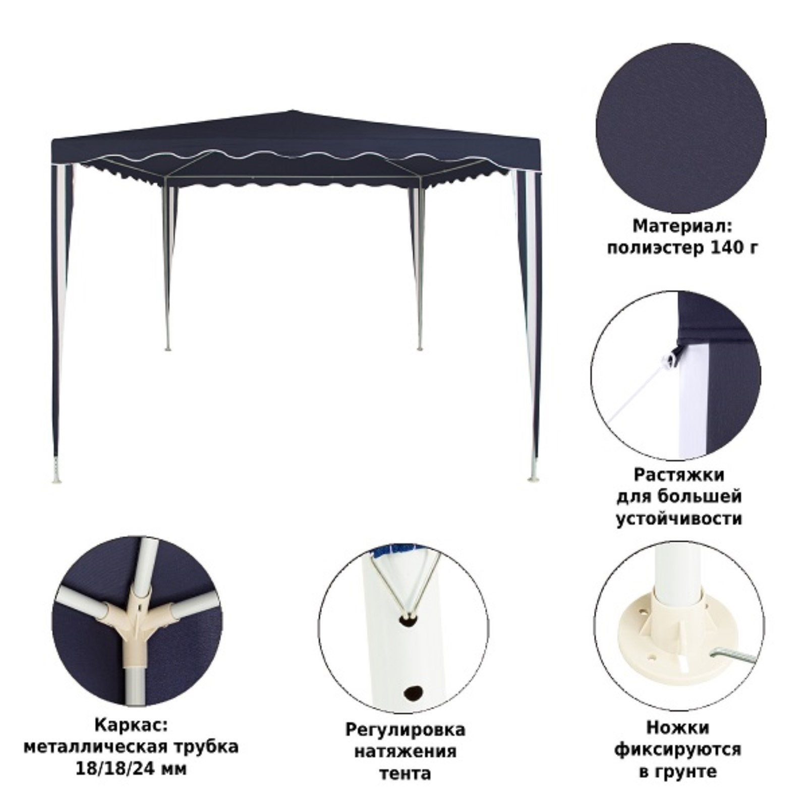 Размер: 3х3х2. 5 м Вес нетто: 5 кг Материал: полиэстер 140 г Каркас: металлическая трубка (18/18/24 мм) Цвет: синий Размер упаковки: 110х14х21 см Вес брутто: 6 кг Производитель: Green Glade