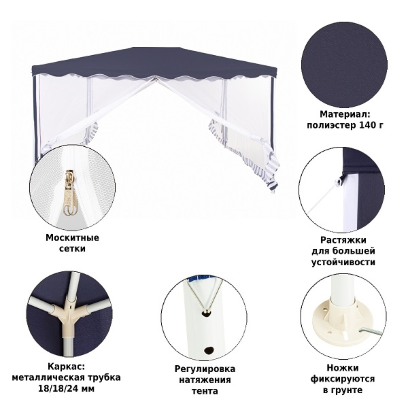 Тент-шатер садовый из полиэстера №1038. Тент садовый из полиэстера – практичное и популярное решение для использования на даче, пикниках, шашлыках и кемпинге. Крыша тента защитит от солнца, а москитные сетки избавят от насекомых. Тент садовый из полиэстера быстро и несложно монтируется и закрепляется с помощью растяжек. Размер: 3х4х2. 5 мВес нетто: 9 кгМатериал: полиэстер 140 гКаркас: металлическая трубка (18/18/24 мм)Москитная сетка Цвет: синийРазмер упаковки: 108х18х20 смВес брутто: 10. 2 кгПроизводитель: Green Glade Цвет: Синий Ширина, см: 400 Высота, см: 250 Глубина, см: 300 Диаметр трубы каркаса, мм: 18 Диаметр трубы каркаса, мм: 24 : 140 Материал каркаса: Металл Материал тента: Полиэстер Особенности: С москитной сеткой С москитной сеткой: Да Вид: Шатры  развернуть описание ▼